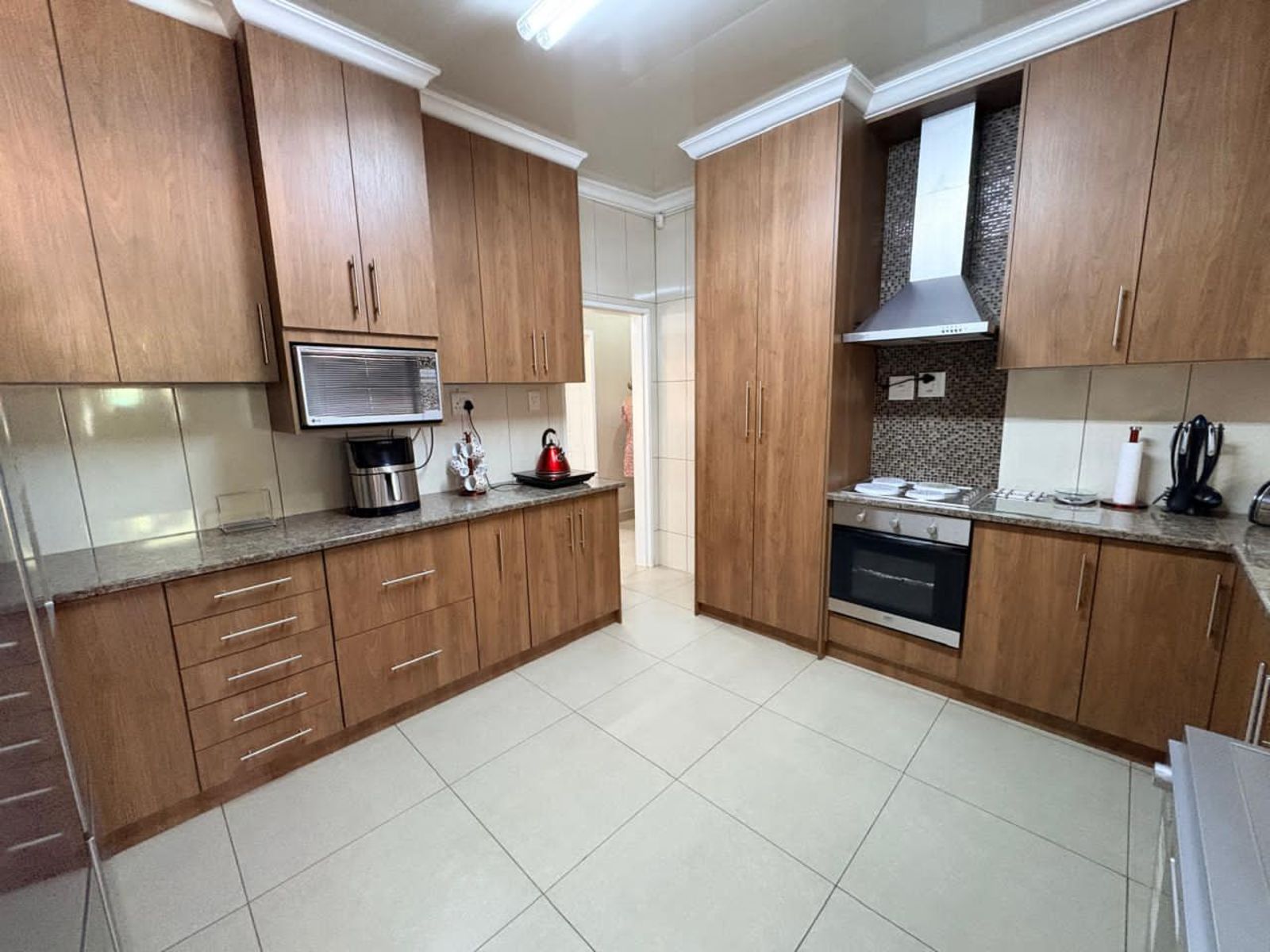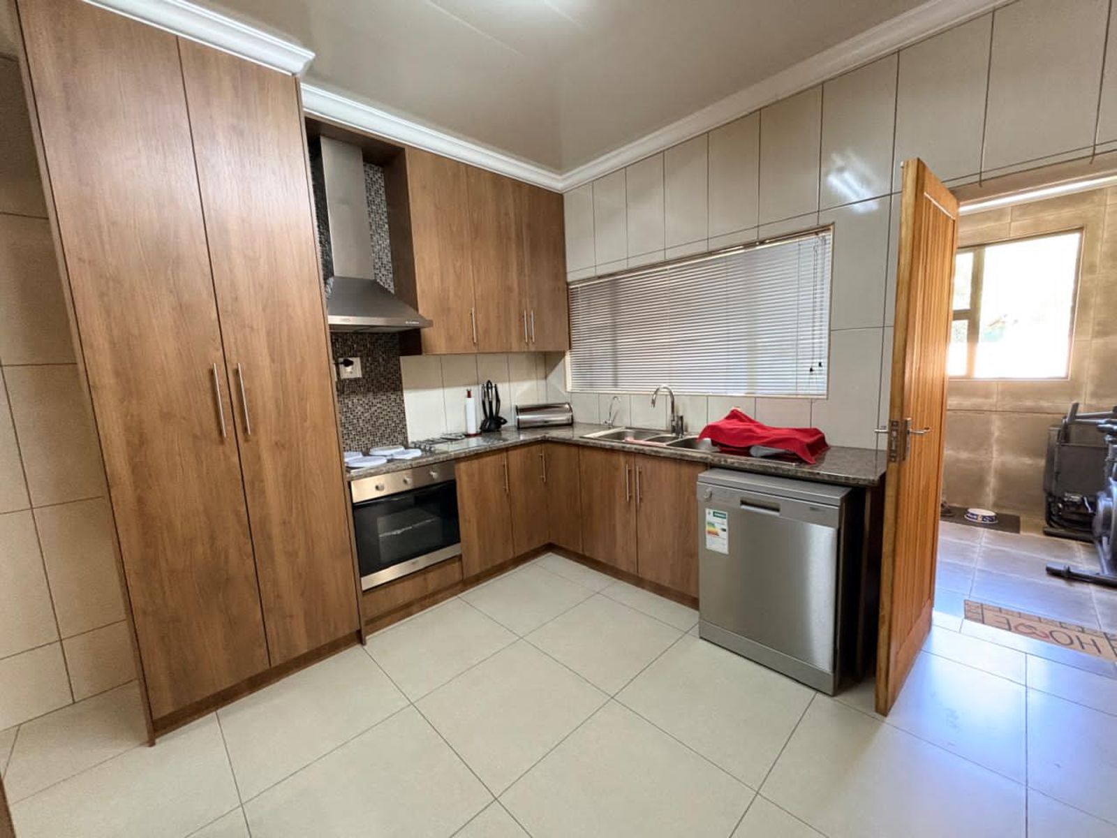 The kitchen is well equipped with built-in cupboards, a hob, extractor fan, pantry, and scullery, providing ample storage and functionality.