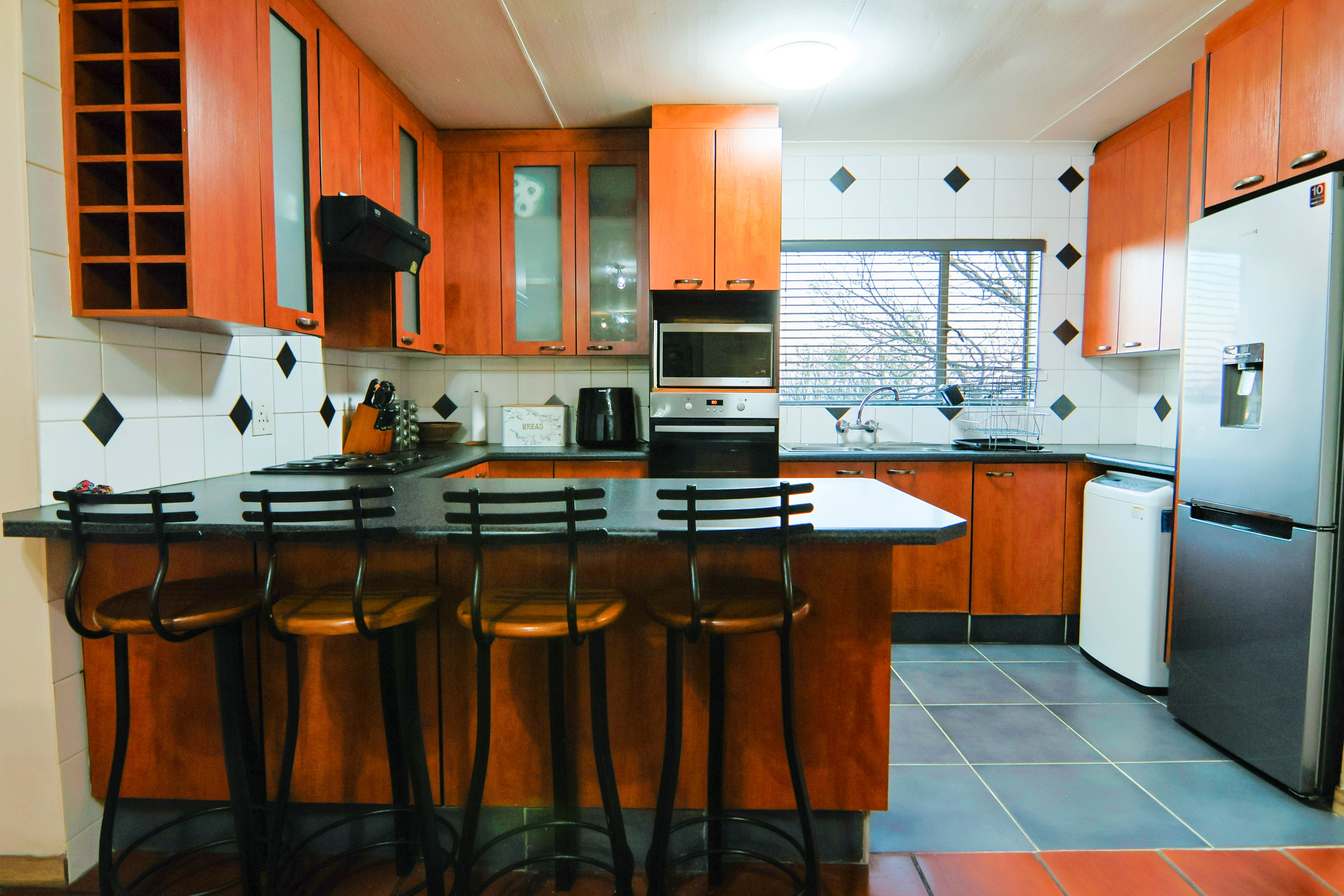 The kitchen is equipped with a double sink, loads of built-in cupboards, wine cabinet, an eye-level oven, a breakfast nook and space for one undercounter appliance.