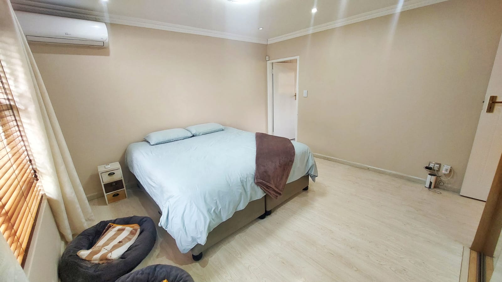 The main bedroom suite serves as a tranquil retreat, complete with laminate flooring, mirrored sliding built-in cupboards, wooden blinds, air conditioning, and curtain rails.