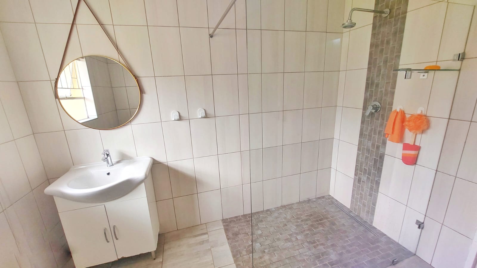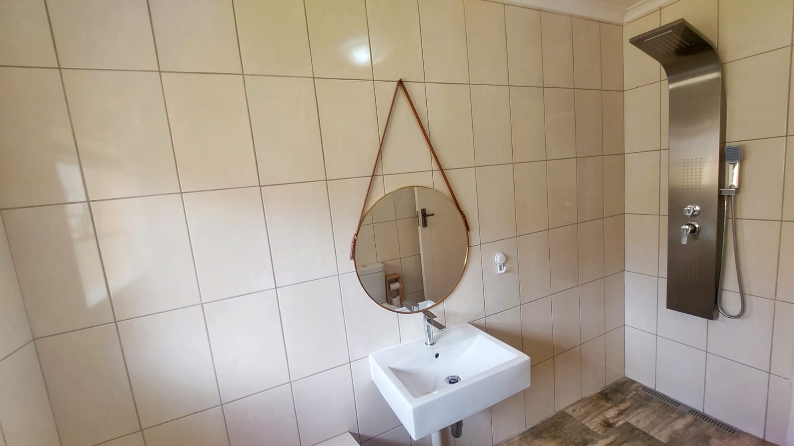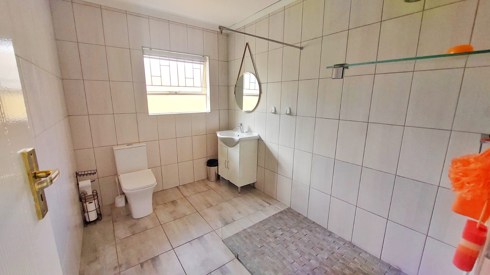 The en-suite bathroom is fully tiled and features a walk-in shower, single vanity, loo, and wall heater for year-round comfort.