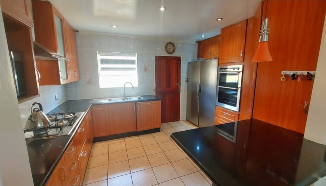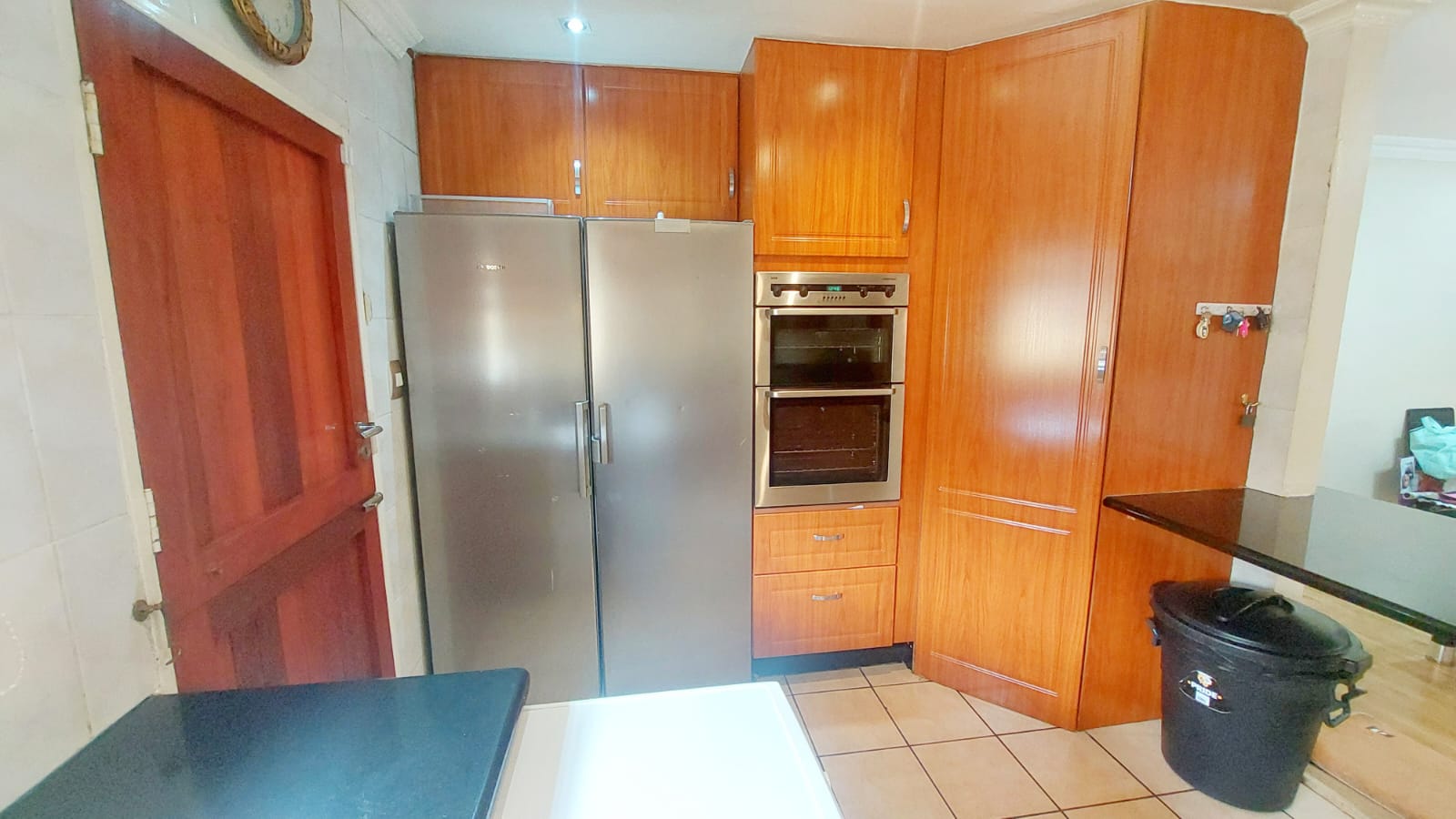 The kitchen, positioned to the right of the dining area, is both stylish and highly functional. It features granite countertops, a five-plate gas hob with extractor fan, a built-in eye-level oven with warmer, and a large pantry cupboard. Additional highlights include space for a double-door refrigerator, a tiled splashback, fitted blinds, and charming stable doors that enhance both light and airflow. The dining area has been thoughtfully designed to accommodate a doggy door, allowing convenient access for pets.