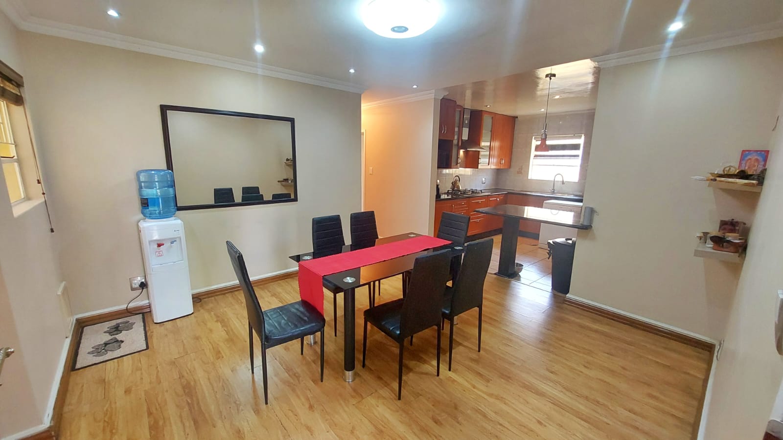 A welcoming entrance hall leads into the elegant receiving area, which flows naturally into the dining space, finished with sleek laminate flooring. Adjacent to the dining room, the spacious lounge, also fitted with laminate flooring ,opens via sliding doors onto a generously sized covered patio, creating an inviting indoor-outdoor entertainment area ideal for year-round enjoyment.