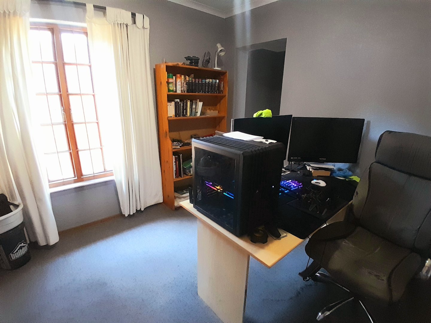 The lounge opens onto a covered, fenced patio that overlooks a lush and expansive garden — ideal for relaxing, entertaining, or even future property extension. A handy wendy house adds extra outdoor storage to this tranquil, green retreat. At the front, the home boasts a single automated garage and a landscaped garden, ready for your creative vision.