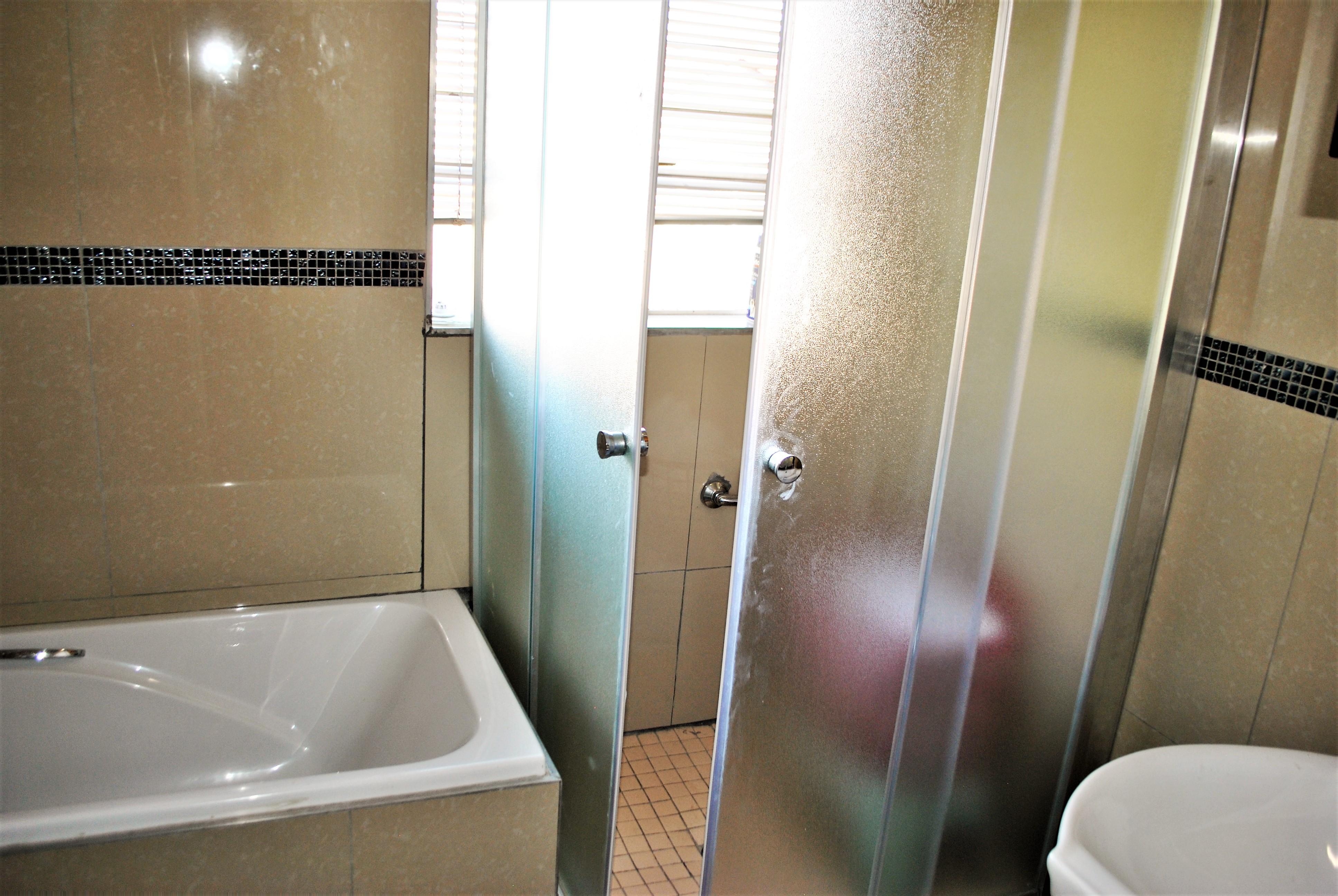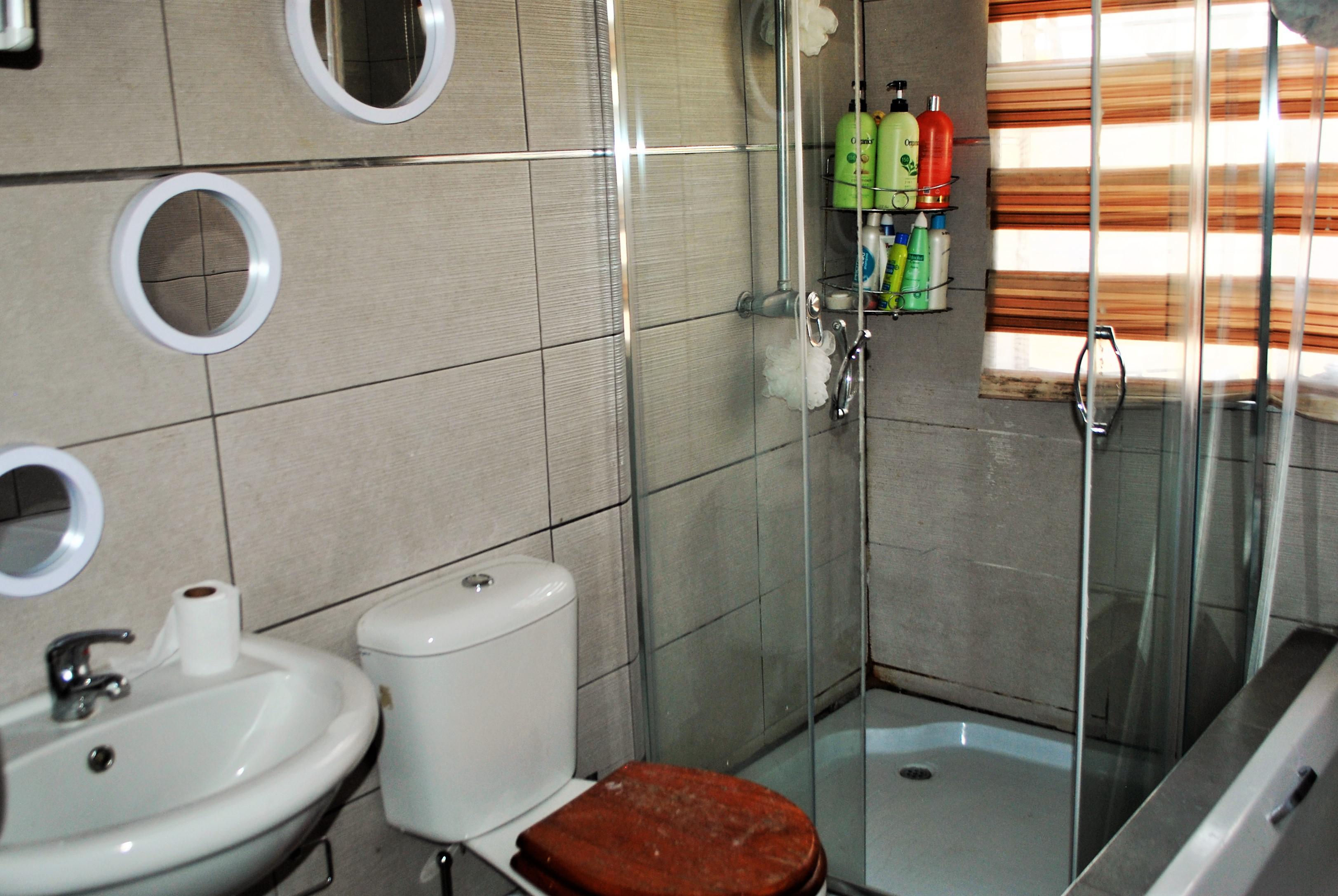 The bottom floor has 3 bedrooms all with built-in cupboards and laminated wood flooring and 2 bathrooms, the main bedroom being en-suite with a full bathroom, shower, bath, basin, and loo. The second and third bedrooms share a full bathroom.