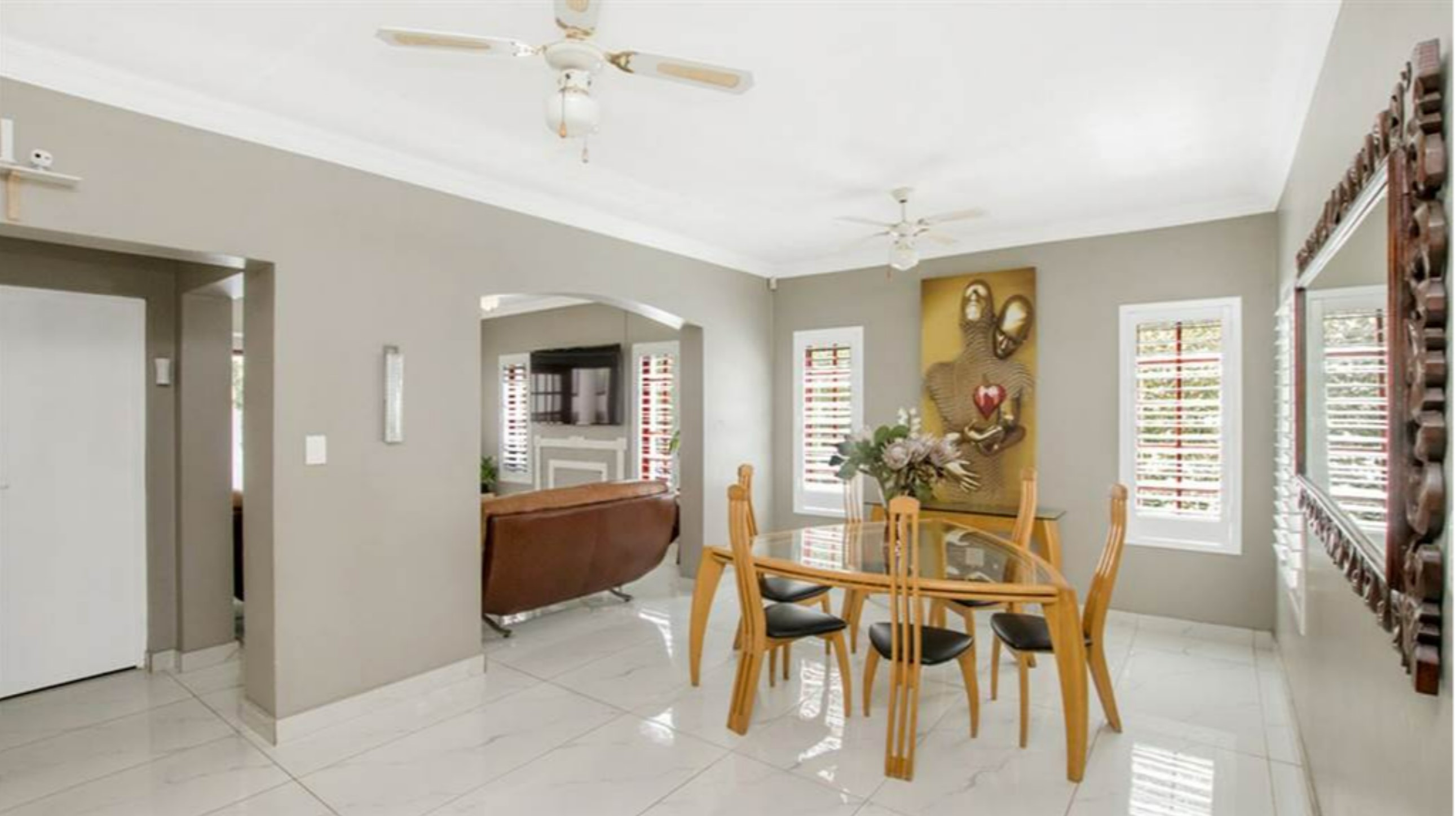 The home offers ample living space with its 2 separate lounges. The formal lounge is tucked away privately at one end of the house, while the TV lounge is open-plan off the dining area. The TV lounge features a built-in fireplace and a sliding door leading to the covered patio. In addition, there is a quaint sunroom/breakfast room just off the dining area and kitchen.