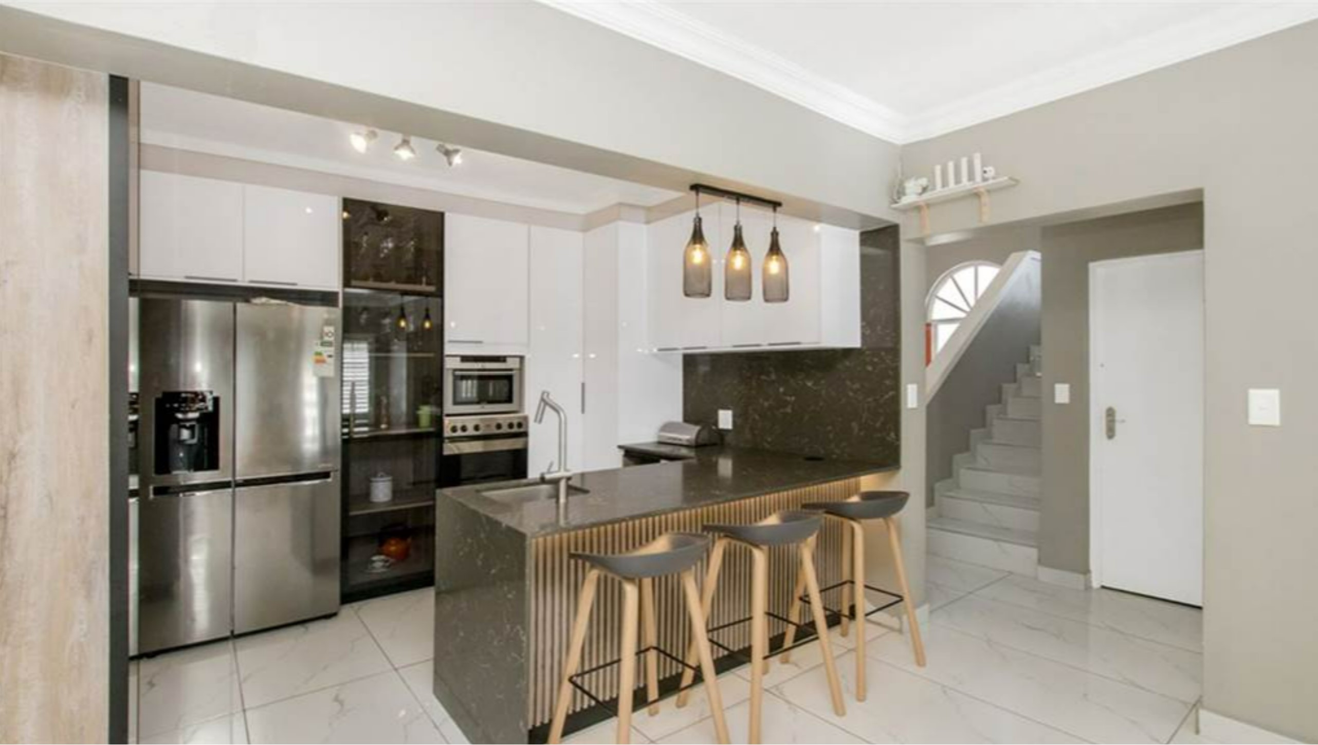 The kitchen, recently renovated, highlights contemporary, high-quality finishes, including a gas hob and ample storage space.