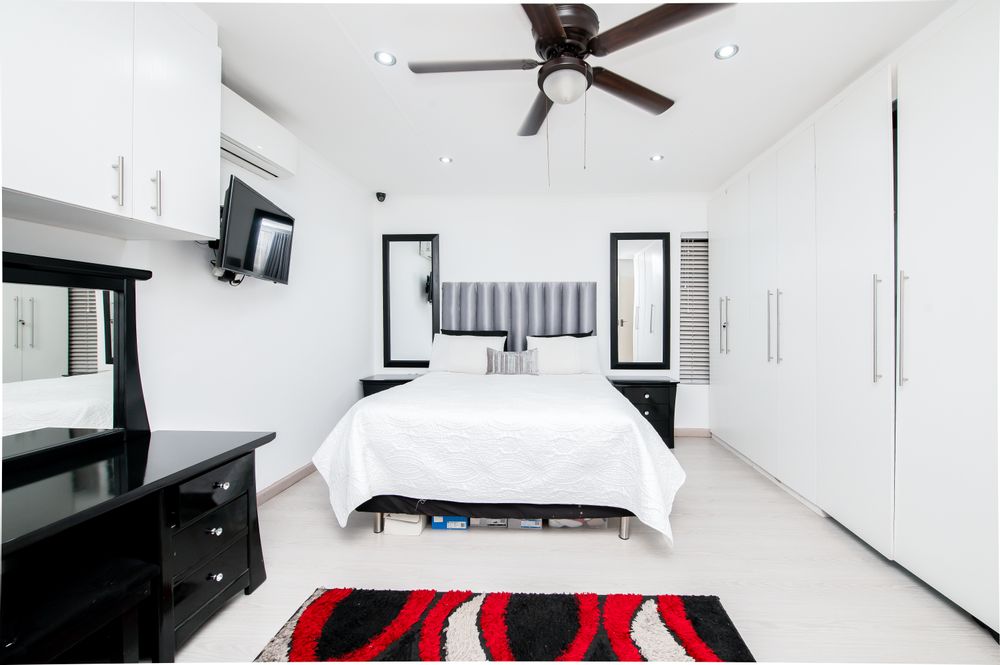 4 deluxe and elegant Bedrooms - master bedroom, conveniently located downstairs, features a full ensuite with a bathtub and shower, fashionable laminated flooring, a spacious closet, and an air conditioning and fan unit for added comfort.