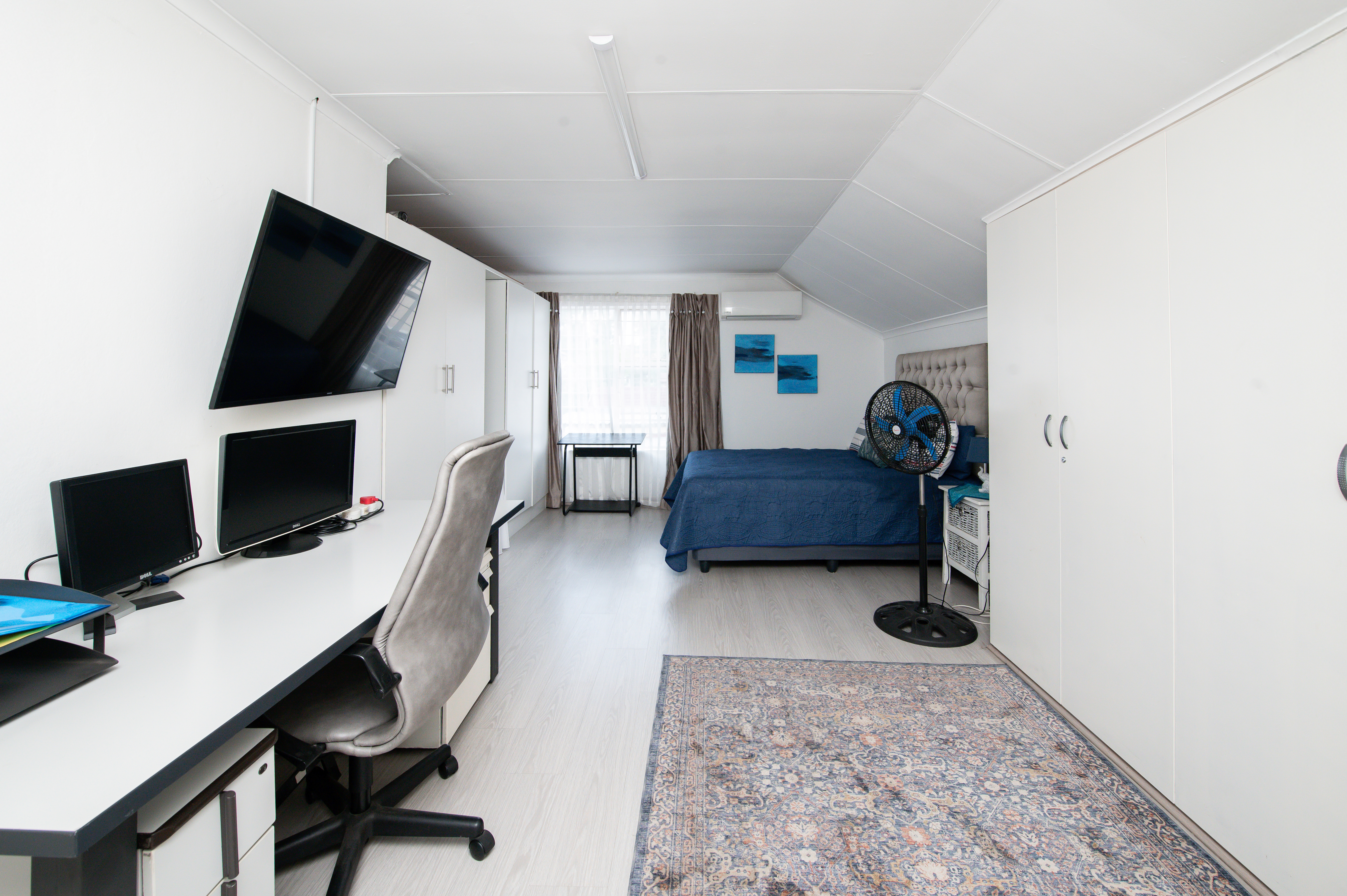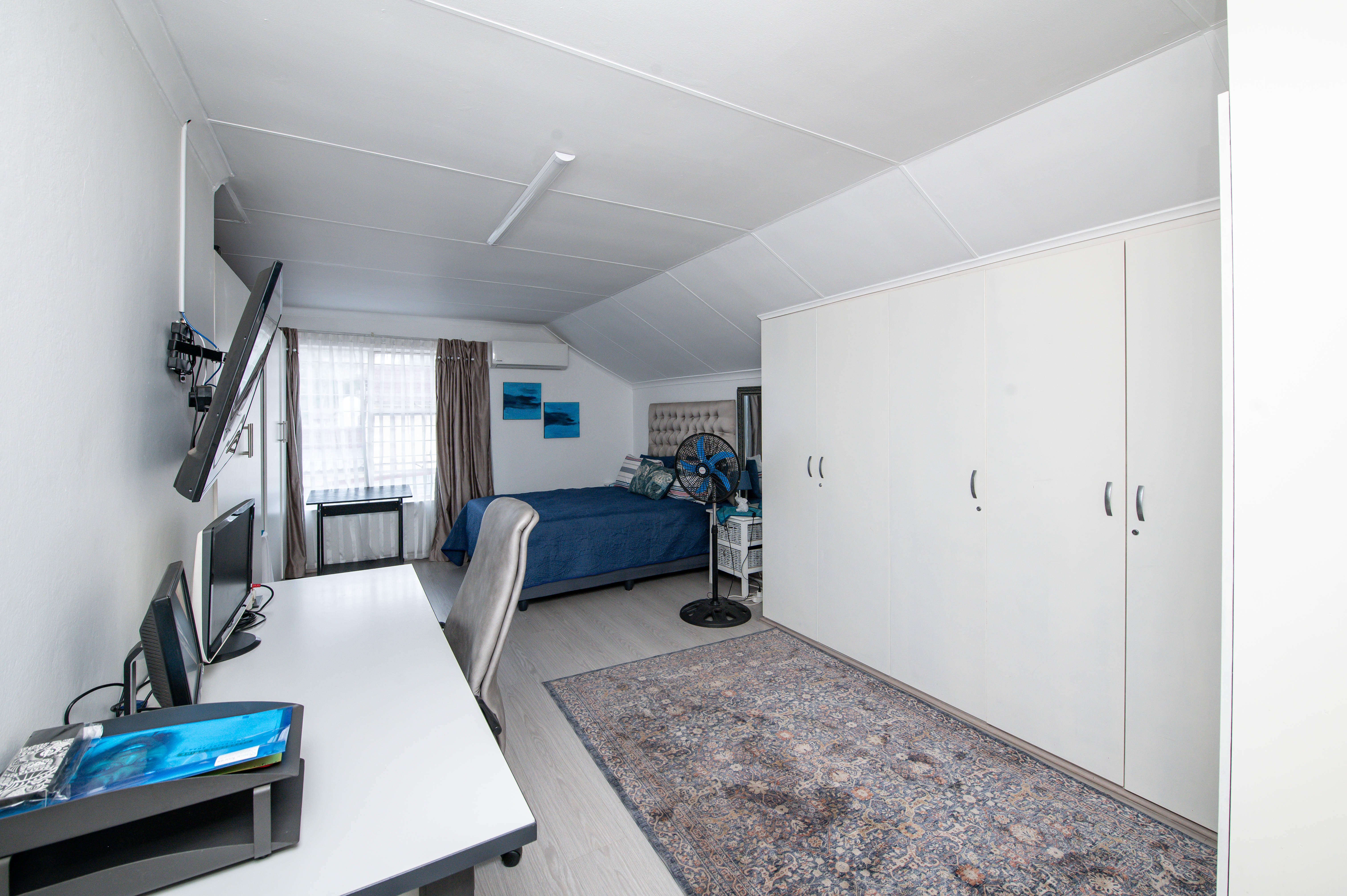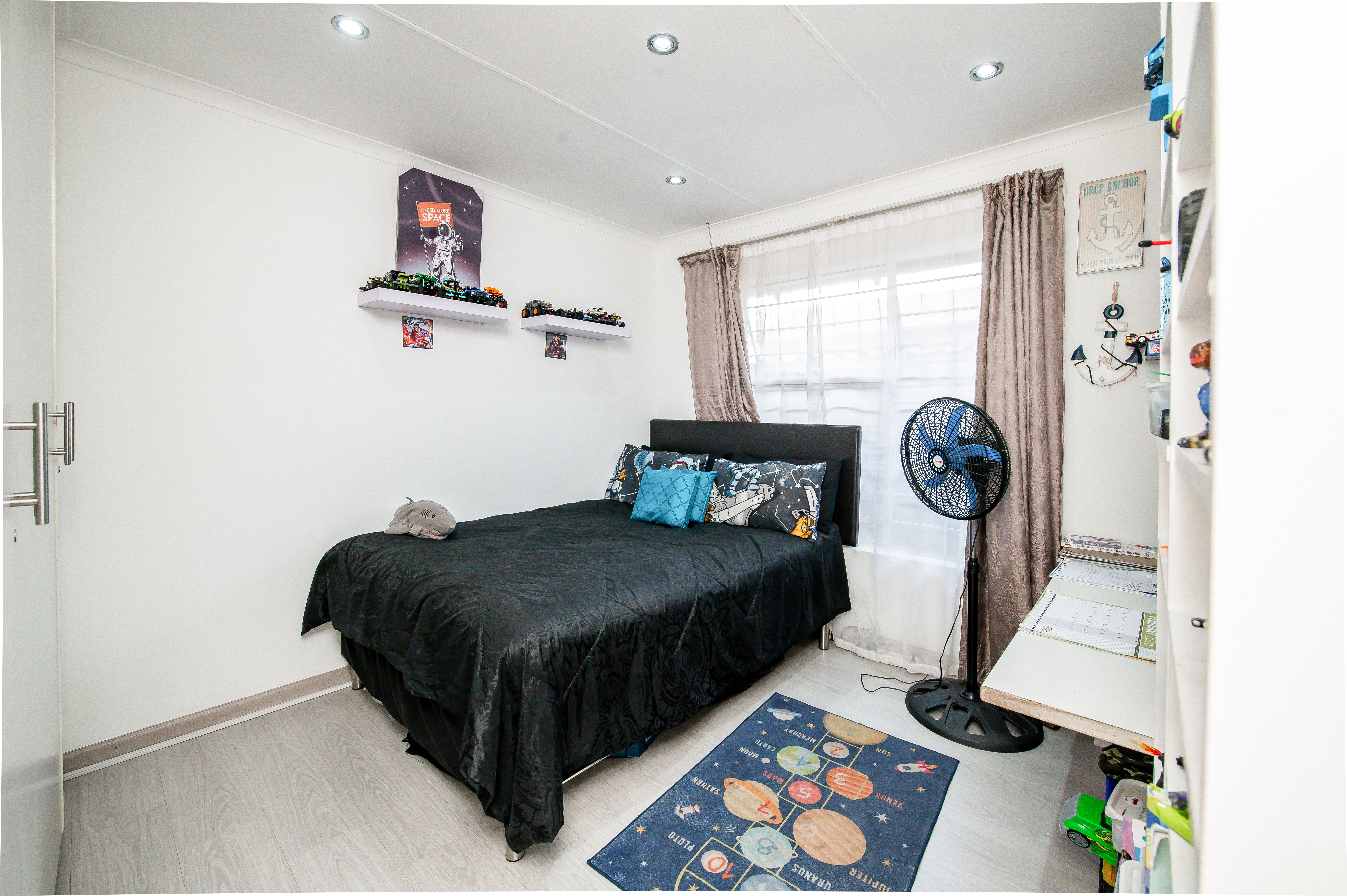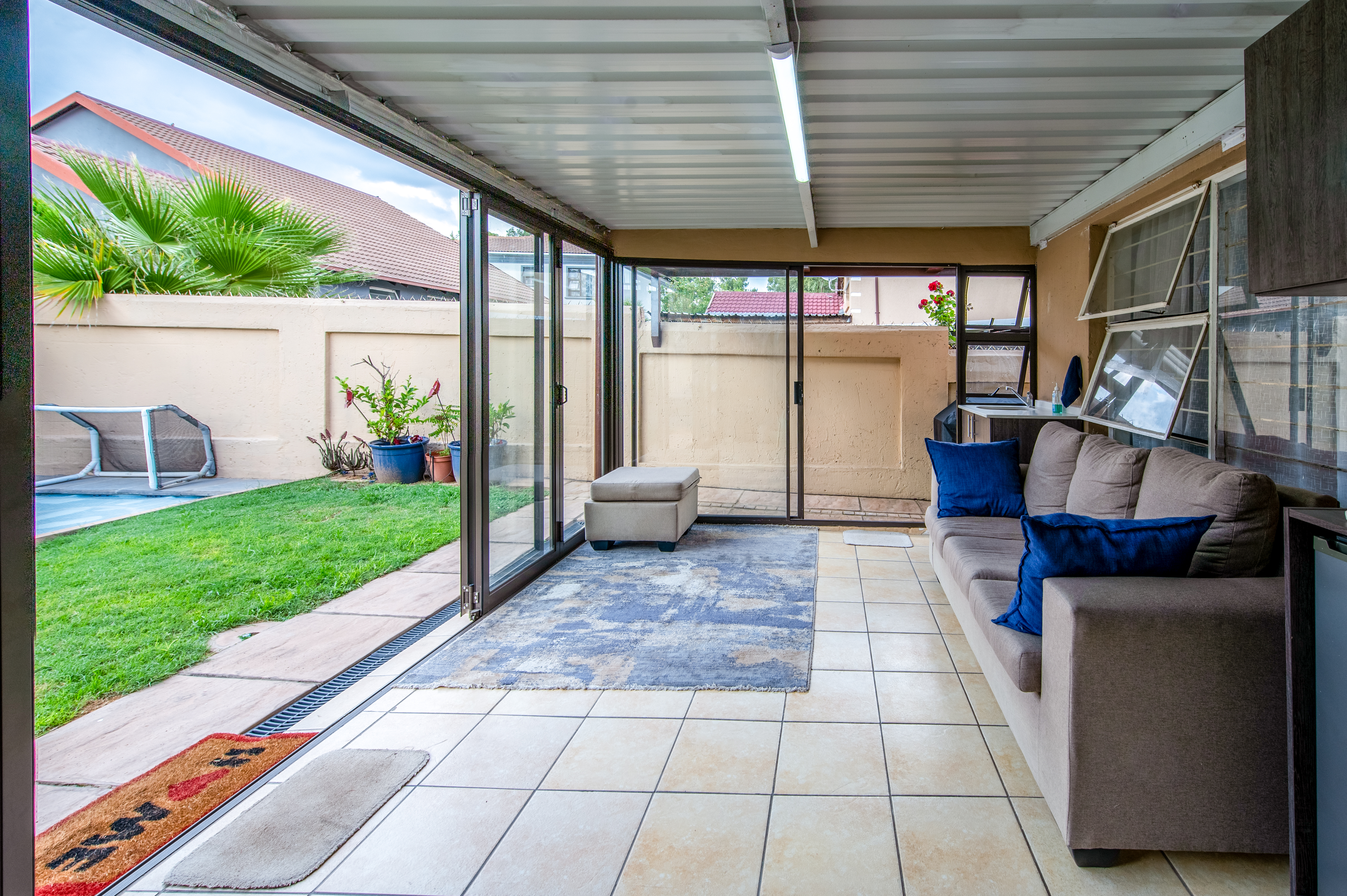 Cameras for remote monitoring, control of air-conditioners, lights, irrigated garden areas and geyser using Alexa. Large storage spaces and Wendy house in the yard