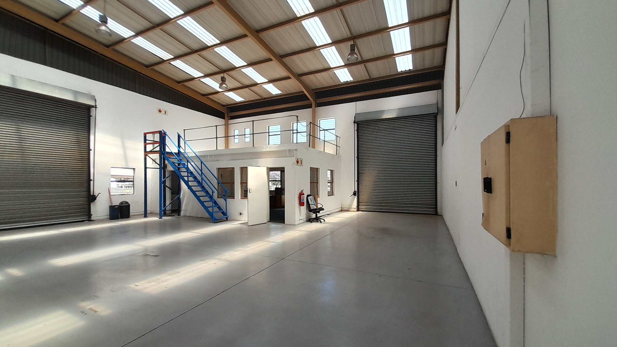The unit features a neat reception area flowing into a spacious open-plan warehouse with screeded flooring and three 3m roller shutter doors. Two doors are ramp-accessed, while one includes a 2m dock leveler, ensuring efficient loading and offloading. Additional features include a lockable internal storeroom, kitchenette, and three ablutions. The warehouse offers a height of 6m to the apex and 4m to the eaves, accommodating a wide range of operational requirements.