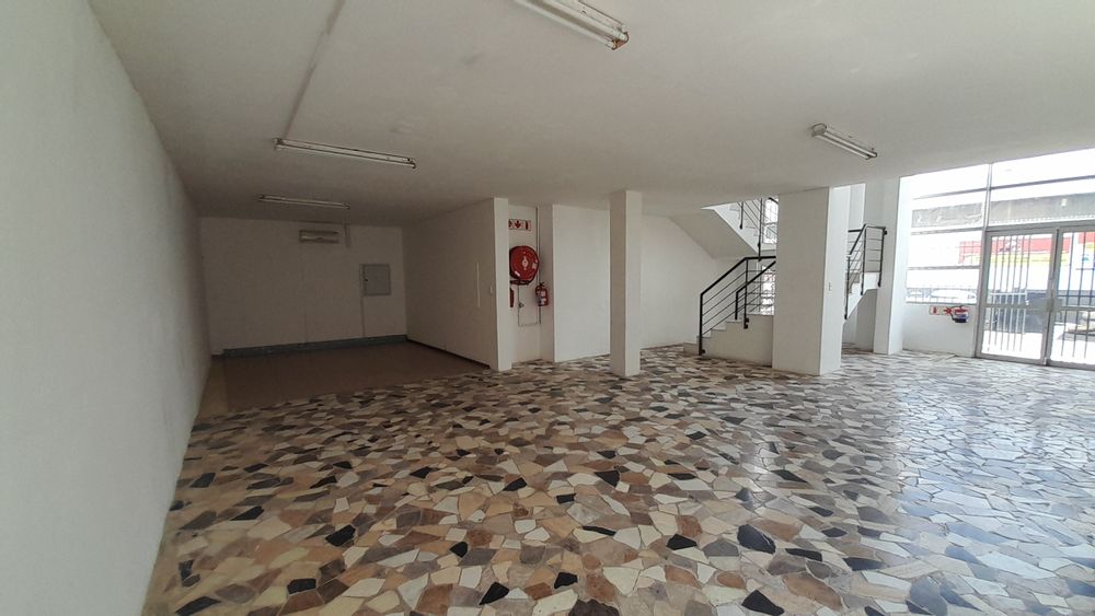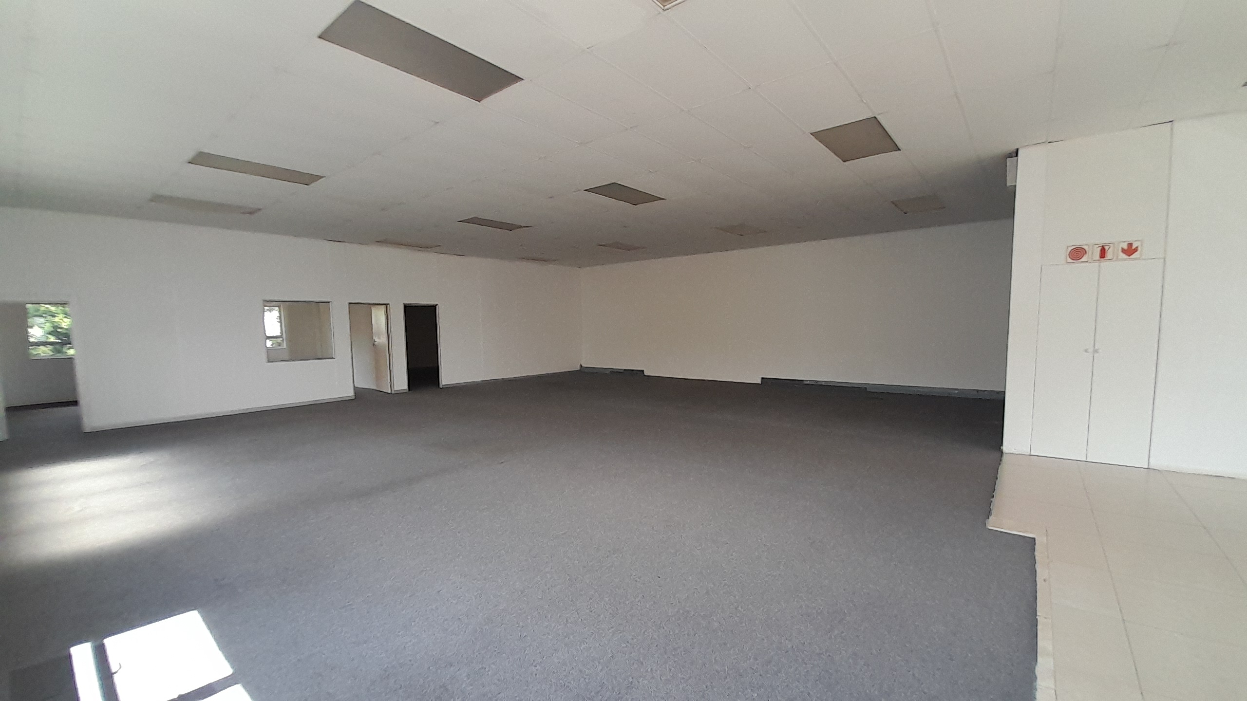 The ground floor features a fully tiled open-plan area, ideal for product display or reception use. The first floor includes two closed offices, a boardroom, and additional open-plan workspace, along with a kitchenette and two ablutions, one equipped with a shower. Carpet flooring is installed on the upper level, and central air conditioning ensures a comfortable environment throughout. Large windows provide ample natural light, enhancing the bright and spacious feel of the unit.