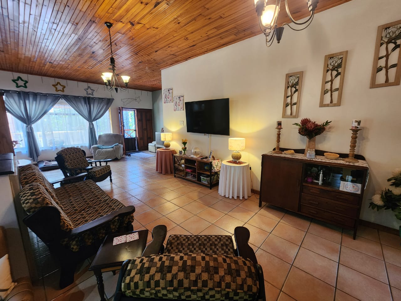 The main house has a roomy layout with three bedrooms, all en suite. An extra room could be used as a fourth bedroom or as a study. The kitchen and scullery are neatly laid out with red granite countertops, providing ample space for kitchen appliances. The sunken dining room has warm parquet floors and shares a large fireplace with the lounge creating a cozy living space.