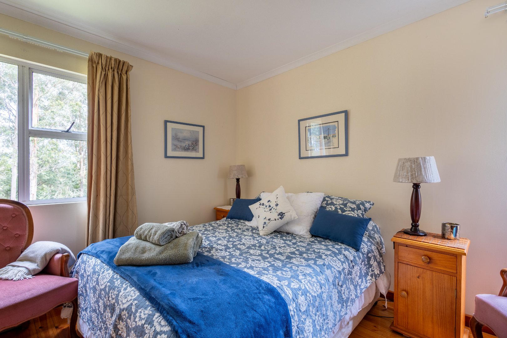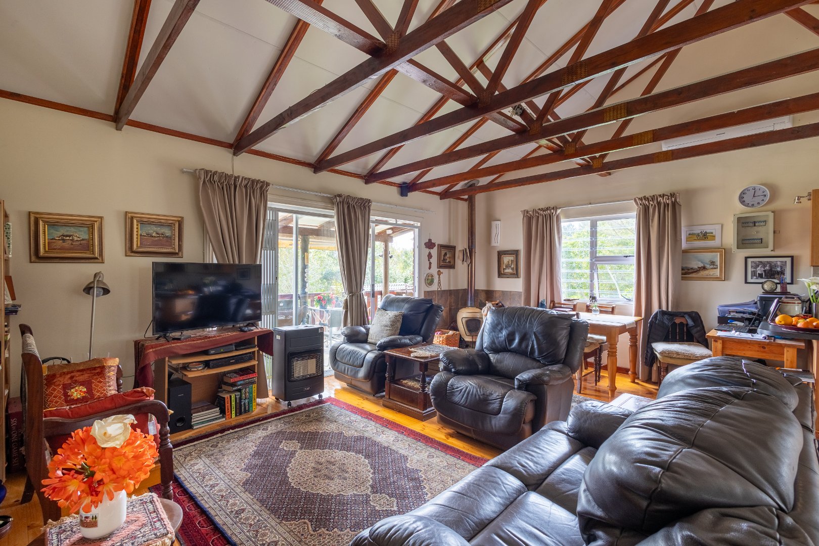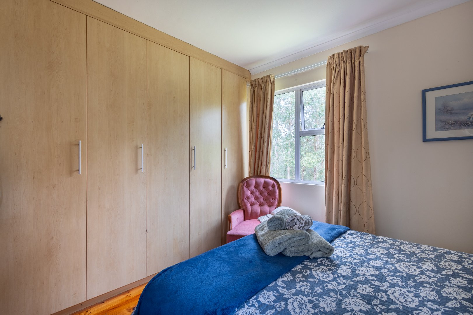 A double story with living area on top floor. 2-bedrooms, north facing with open plan kitchen, dining room and lounge. The bathroom has a built-in bath and shower with electric geyser and solar heated water system. The undercover patio off the living area is north facing with garden and mountain views. The lower half of the building is a brick and mortar double size garage plus additional storage areas.
