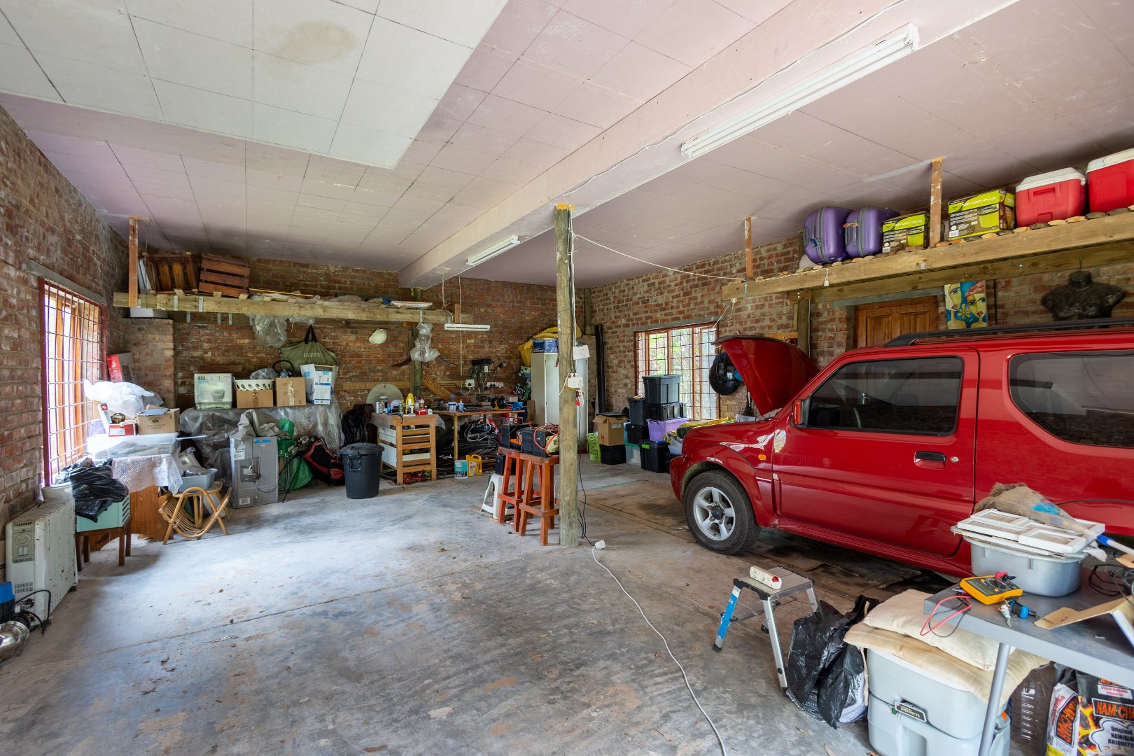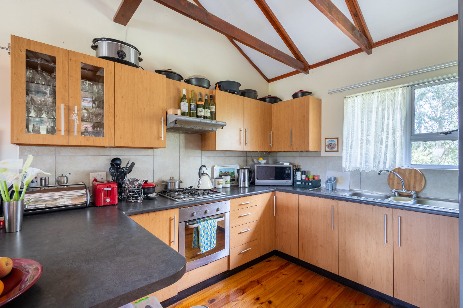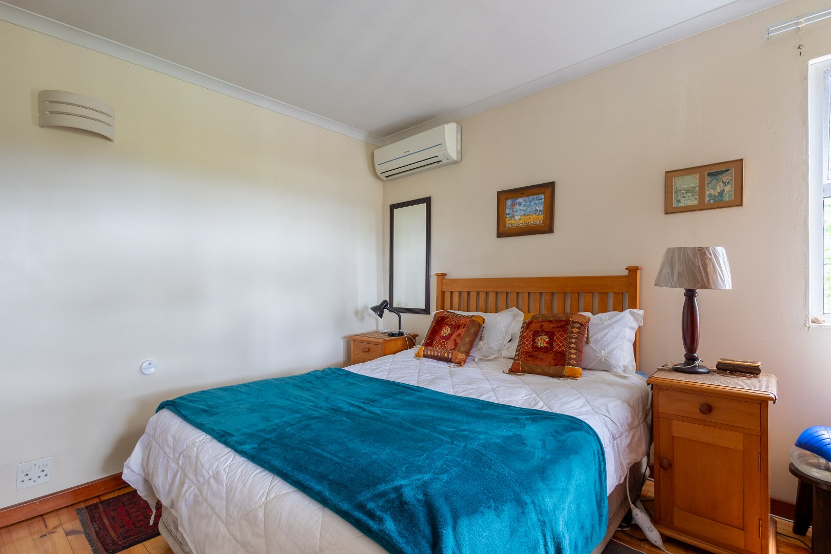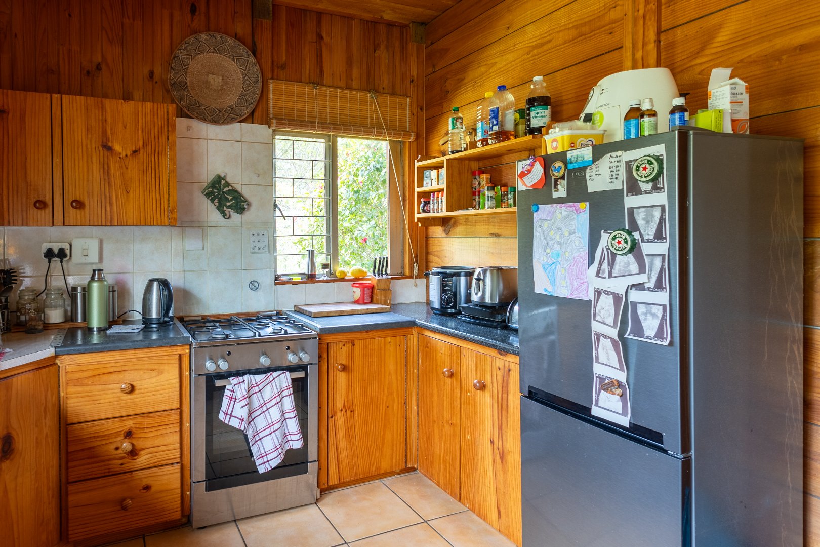 A double story with living area on top floor. 2-bedrooms, north facing with open plan kitchen, dining room and lounge. The bathroom has a built-in bath and shower with electric geyser and solar heated water system. The undercover patio off the living area is north facing with garden and mountain views. The lower half of the building is a brick and mortar double size garage plus additional storage areas.