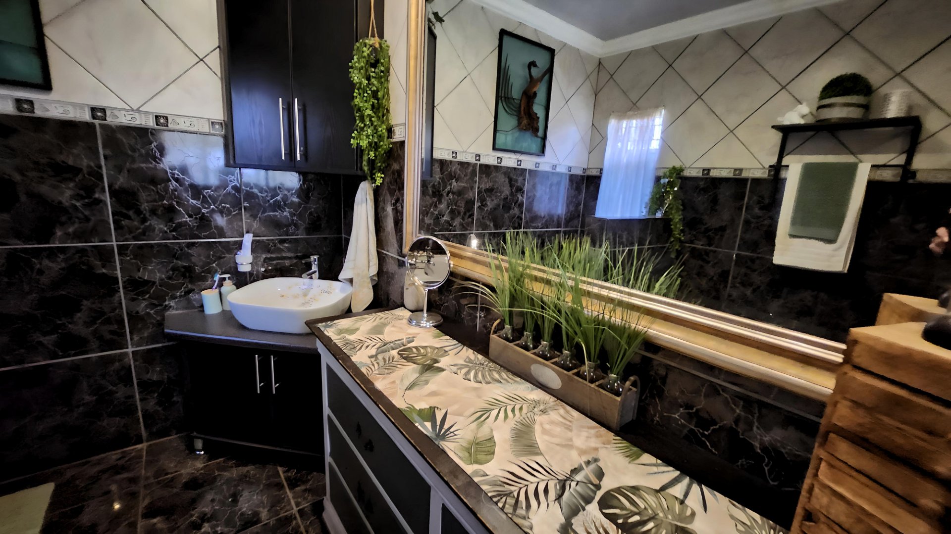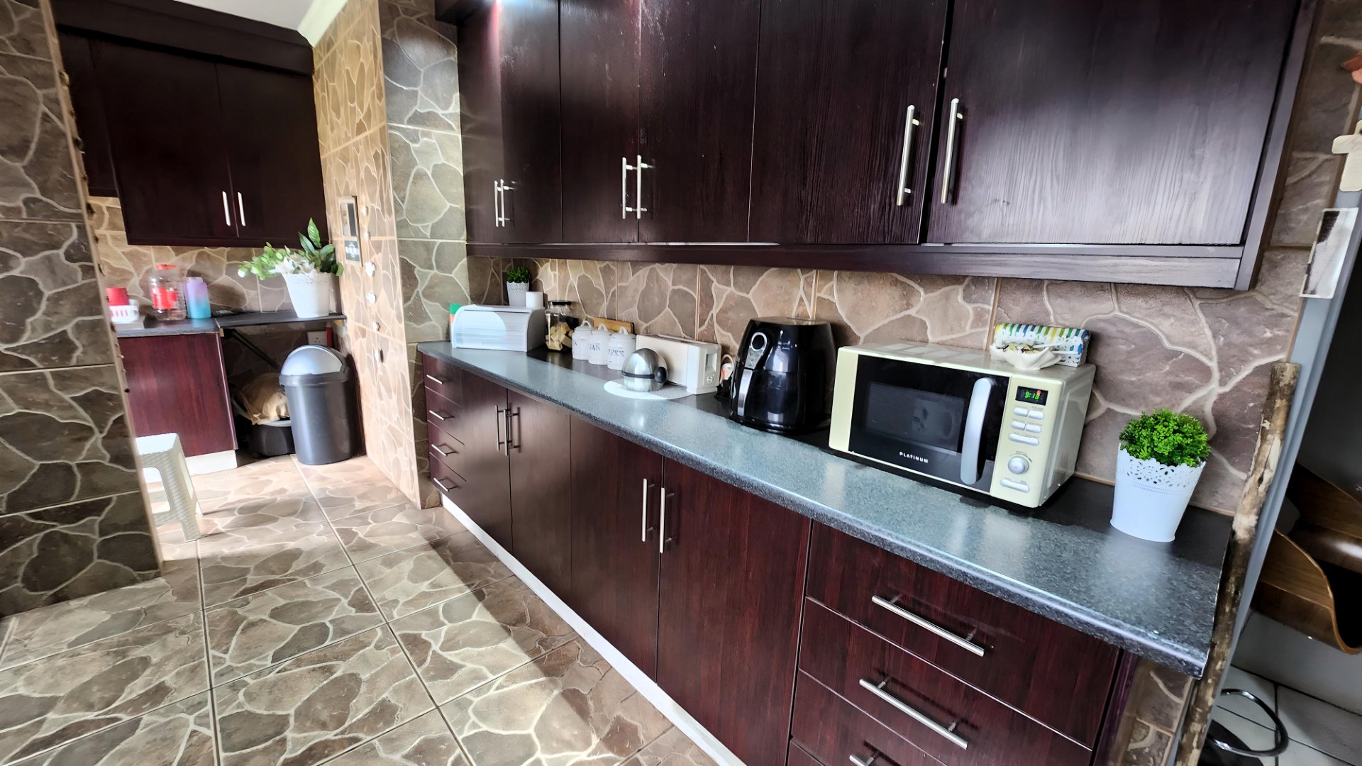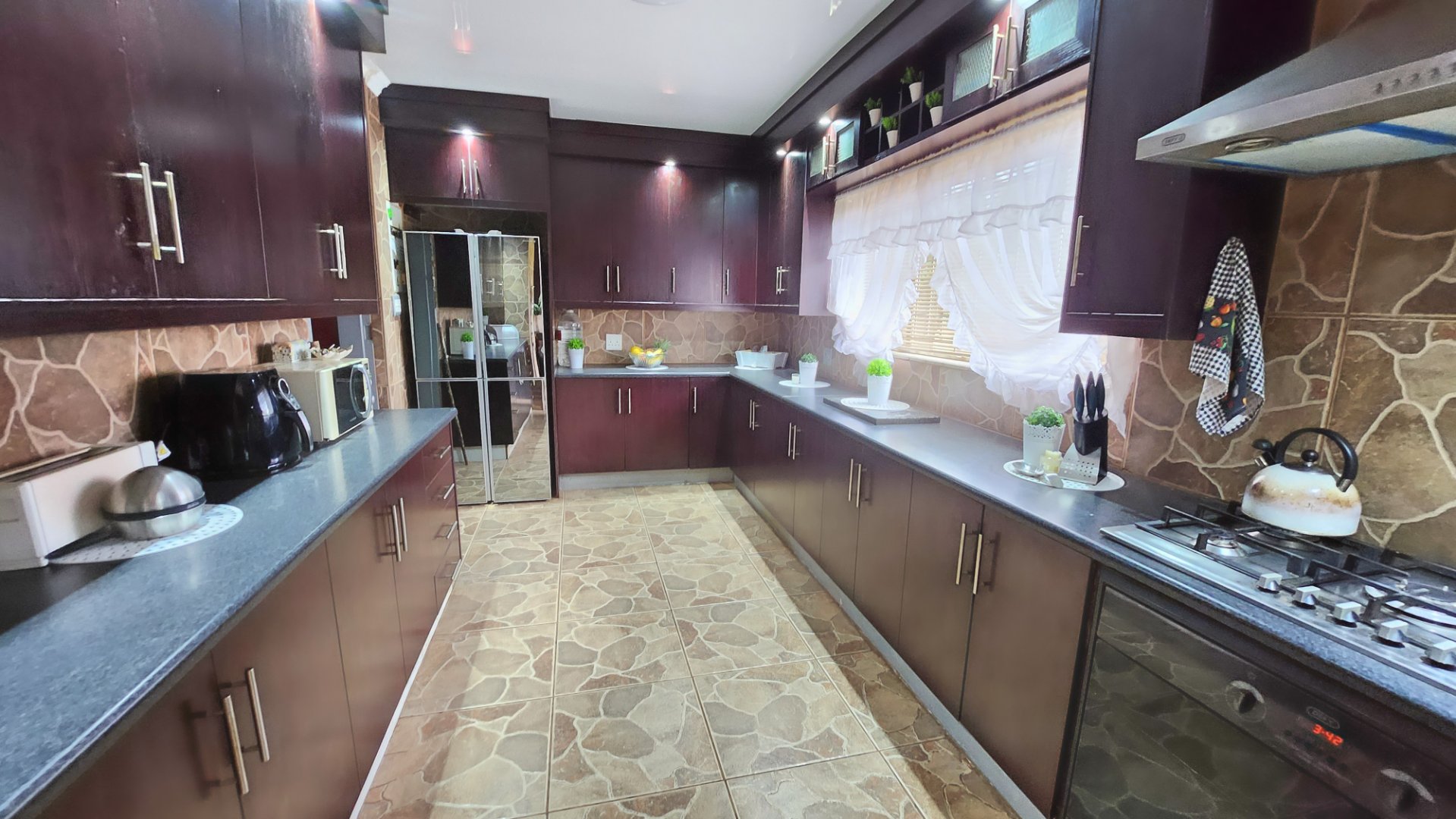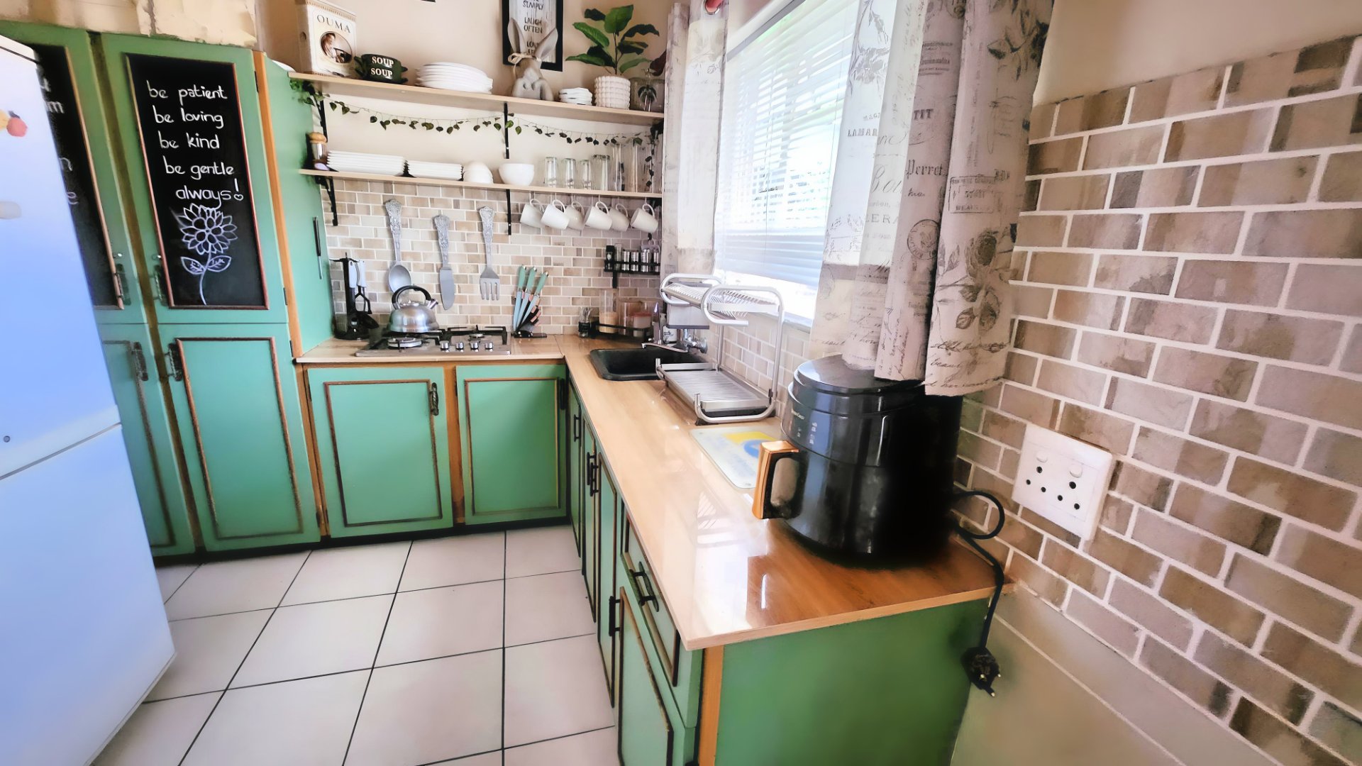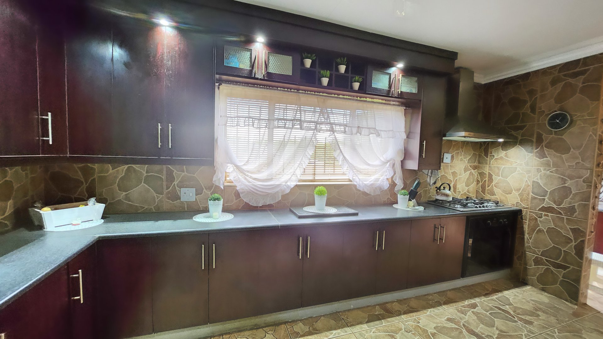 The heart of the home is a neat and well-appointed kitchen, complemented by a second kitchen, allowing the property to be effortlessly divided into two separate living spaces—ideal for extended family or a rental flatlet. The entertainment area, complete with a built-in braai, overlooks the sparkling swimming pool, creating the perfect setting for hosting gatherings and enjoying outdoor living.