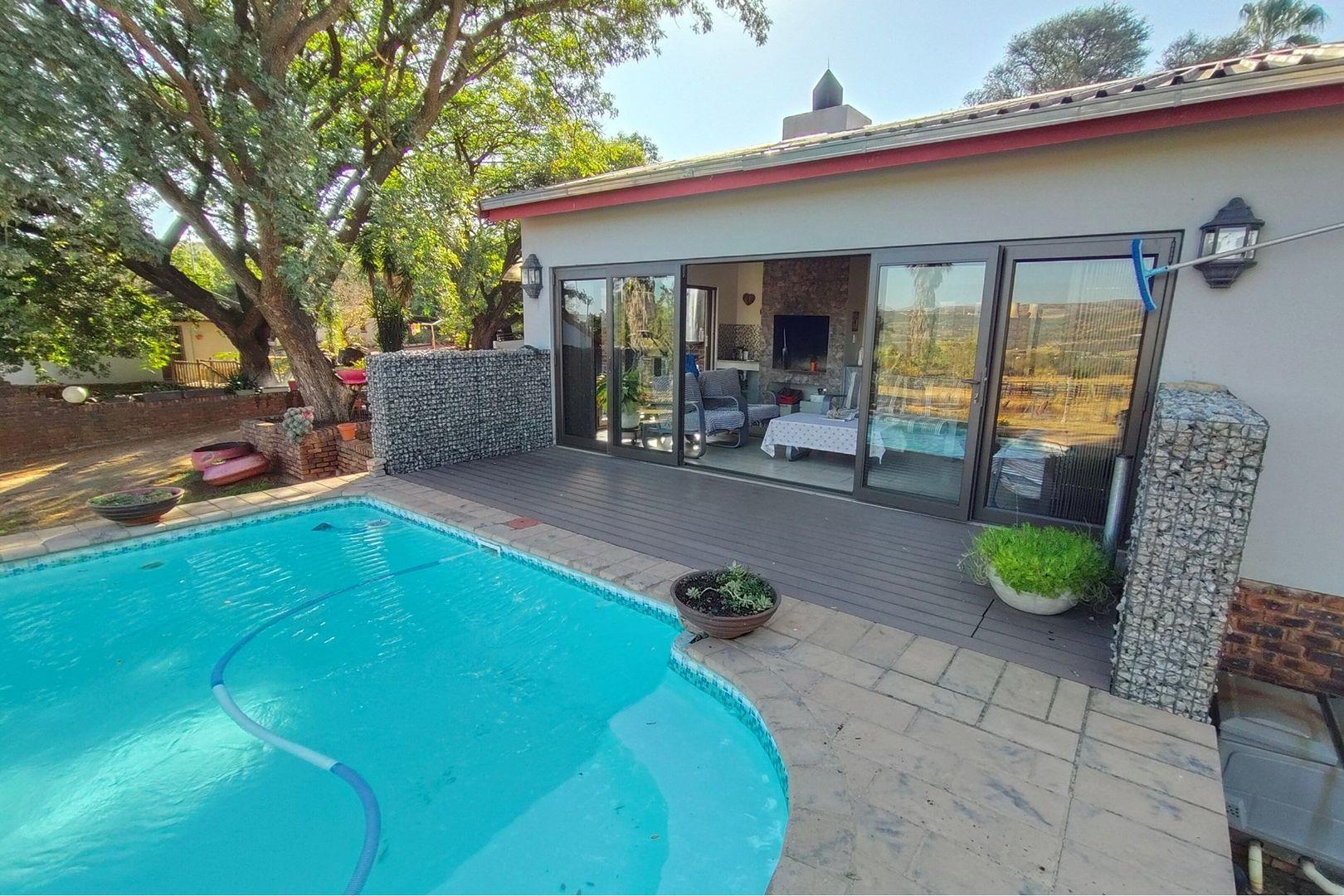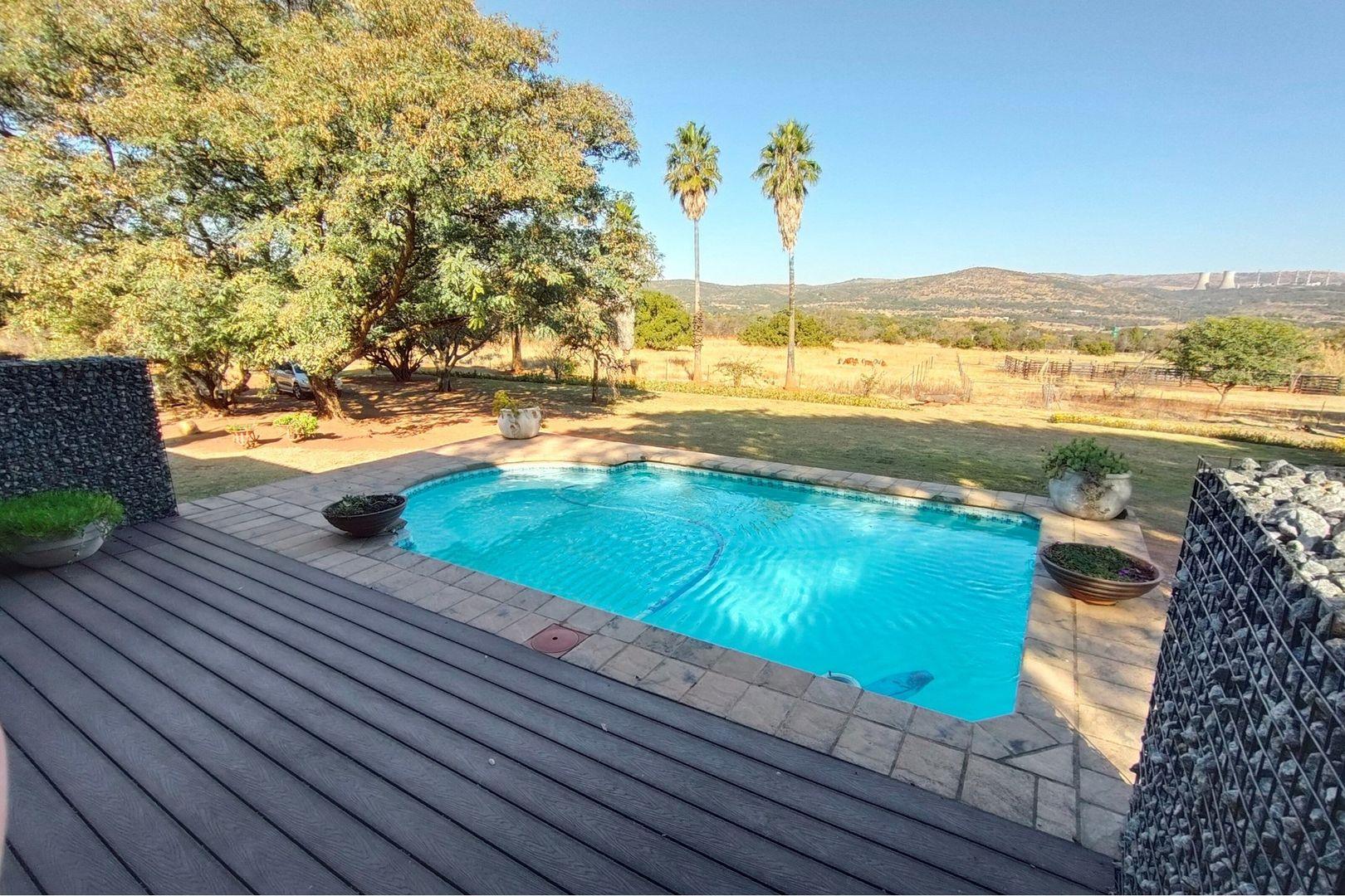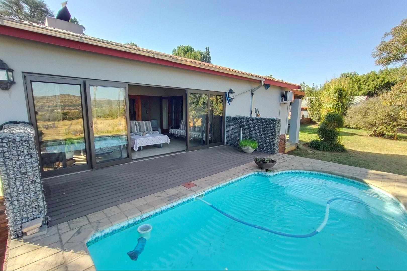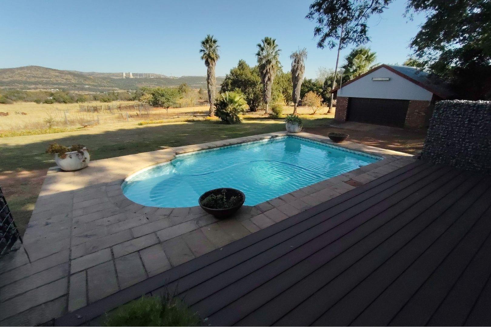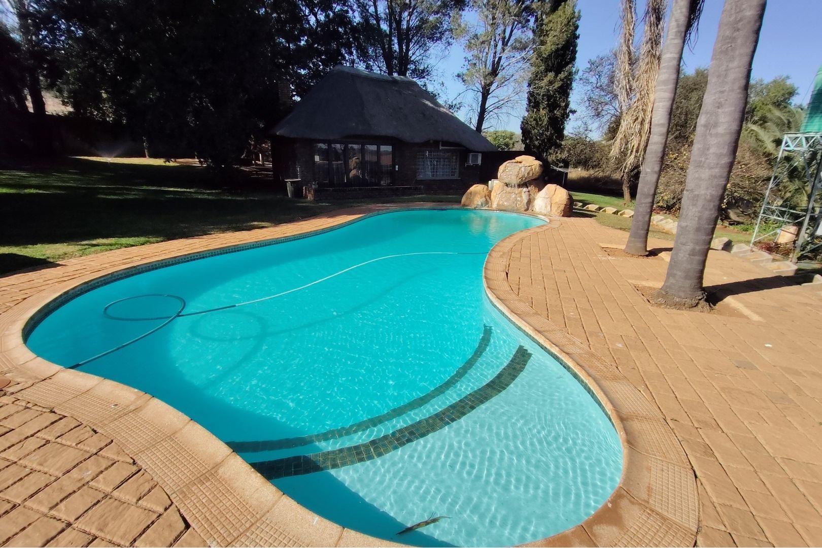 Outdoors, indulge in the sparkling swimming pool, beautifully landscaped garden, and entertainment-ready terrace with a built-in braai. A water feature, irrigation system, and comprehensive security setup with an alarm system guarantee peace of mind, Borehole, Fence, Garden, Paving, Pets Allowed, Staff Quarters, Storage, 24 hour Security, Aircon, CCTV, Central Heating, Fire place, Satellite, Smoking Allowed, Driveway, Spa Pool, Special Doors, Water tanks, Sliding Doors, Tv Antenna, Feedlot for 80 Cattle and 1.5ha Arable land. Garden under sprinkler irrigation.