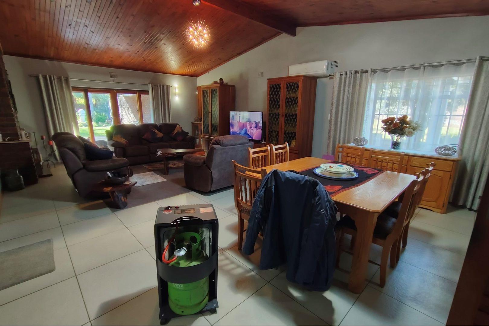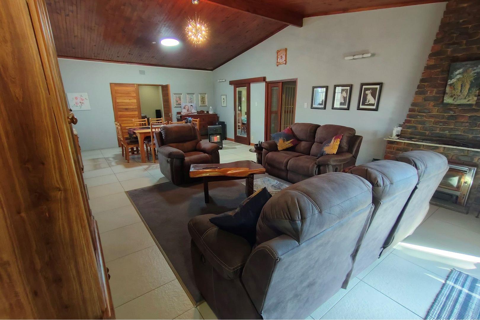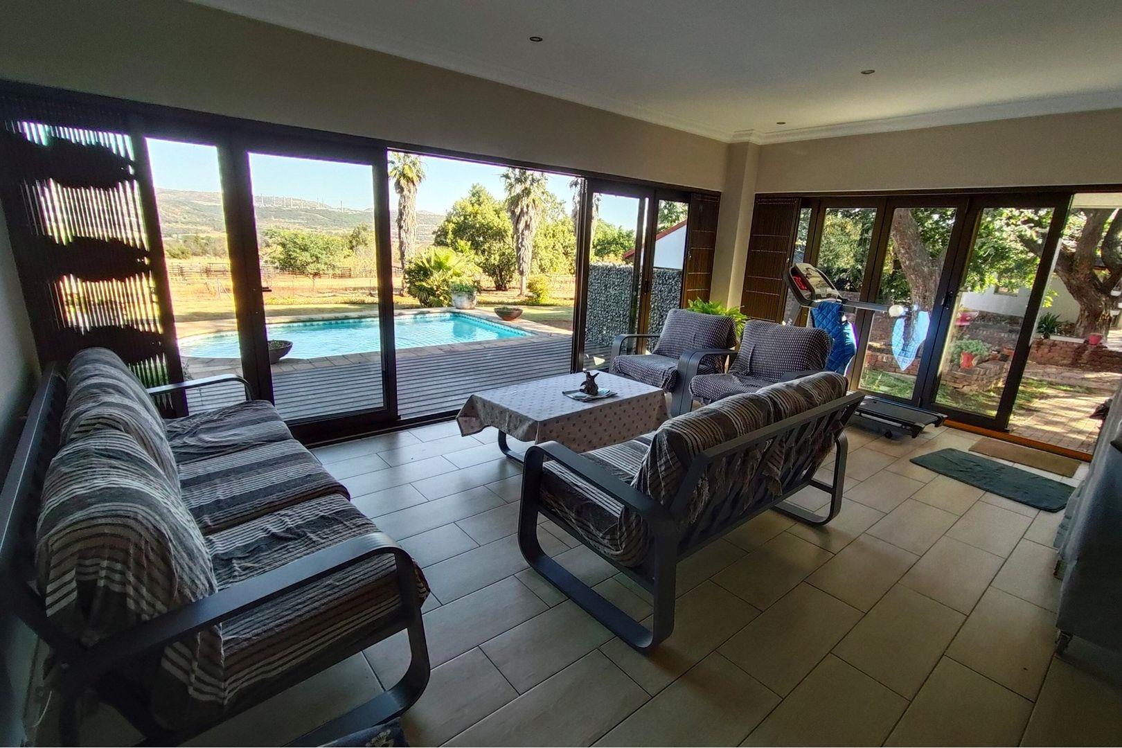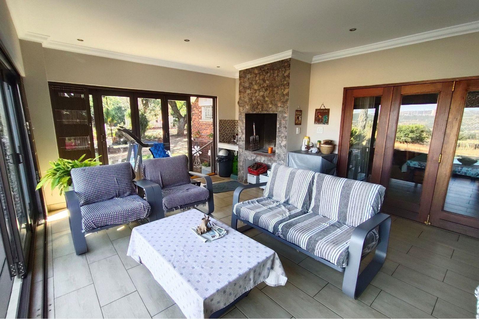 Outdoors, indulge in the sparkling swimming pool, beautifully landscaped garden, and entertainment-ready terrace with a built-in braai. A water feature, irrigation system, and comprehensive security setup with an alarm system guarantee peace of mind, Borehole, Fence, Garden, Paving, Pets Allowed, Staff Quarters, Storage, 24 hour Security, Aircon, CCTV, Central Heating, Fire place, Satellite, Smoking Allowed, Driveway, Spa Pool, Special Doors, Water tanks, Sliding Doors, Tv Antenna, Feedlot for 80 Cattle and 1.5ha Arable land. Garden under sprinkler irrigation.