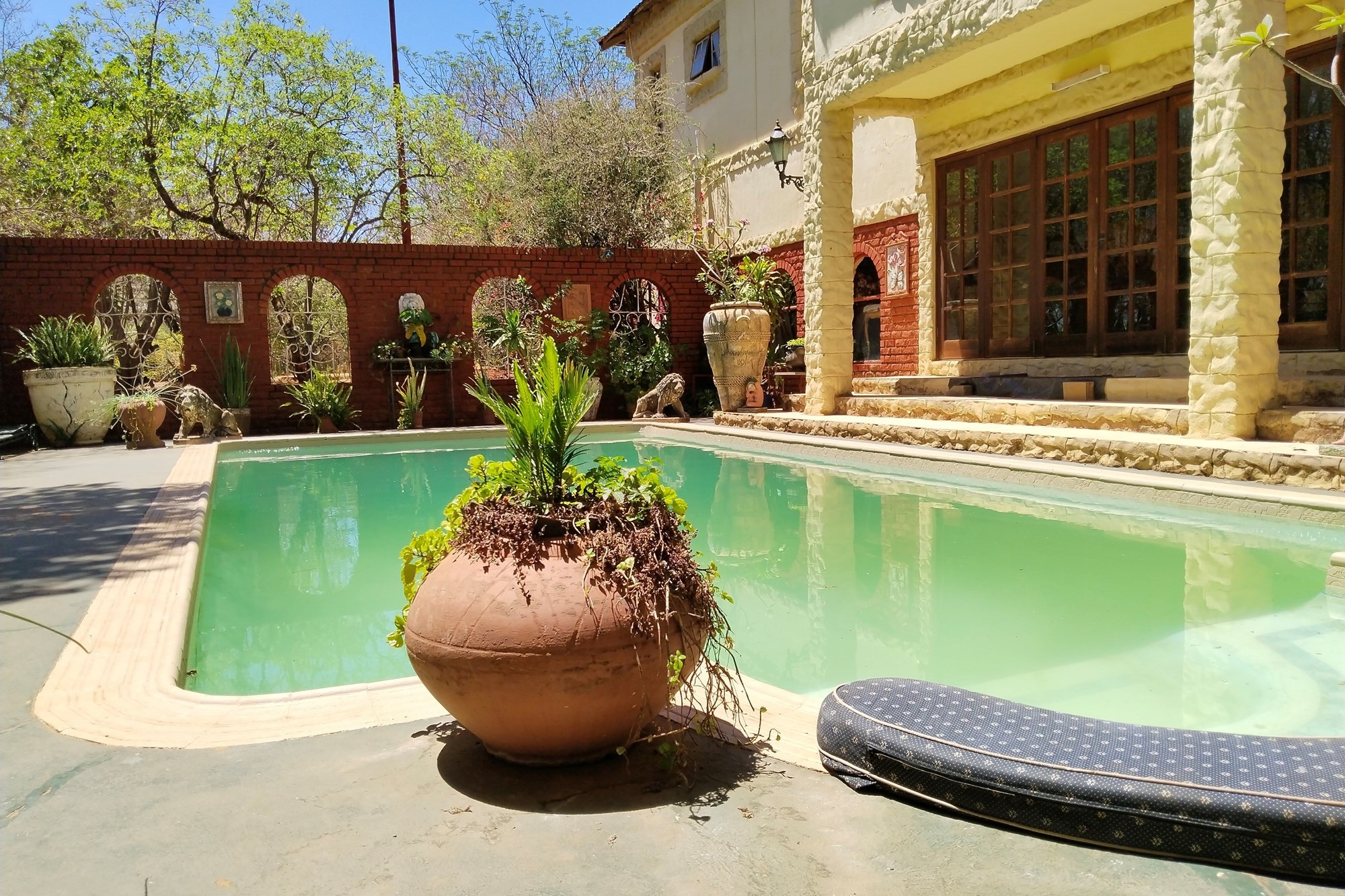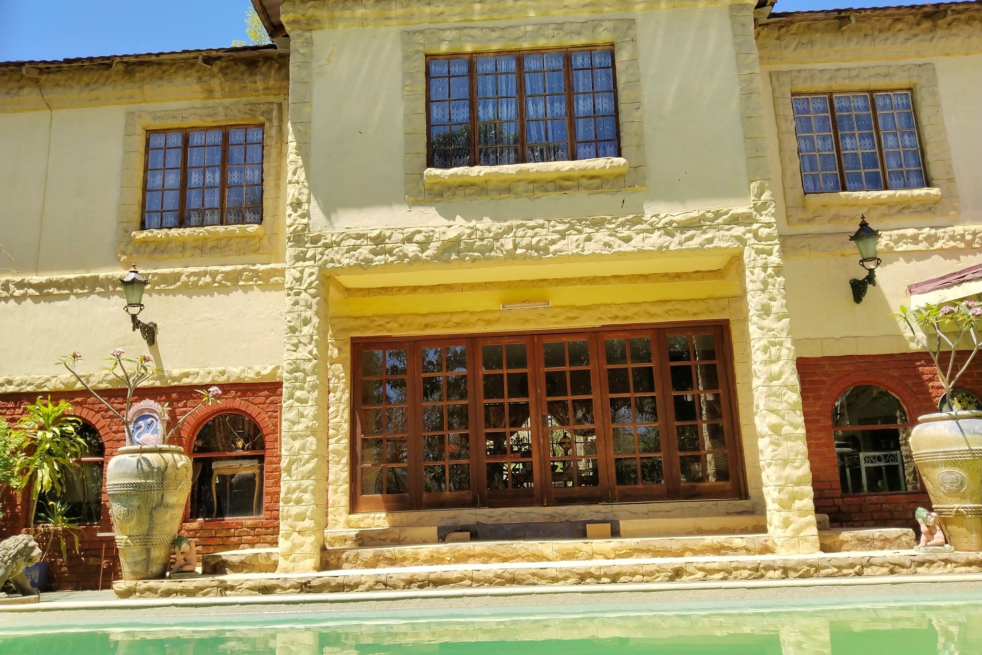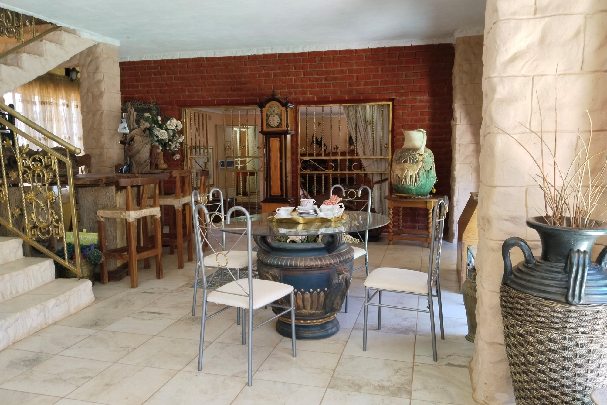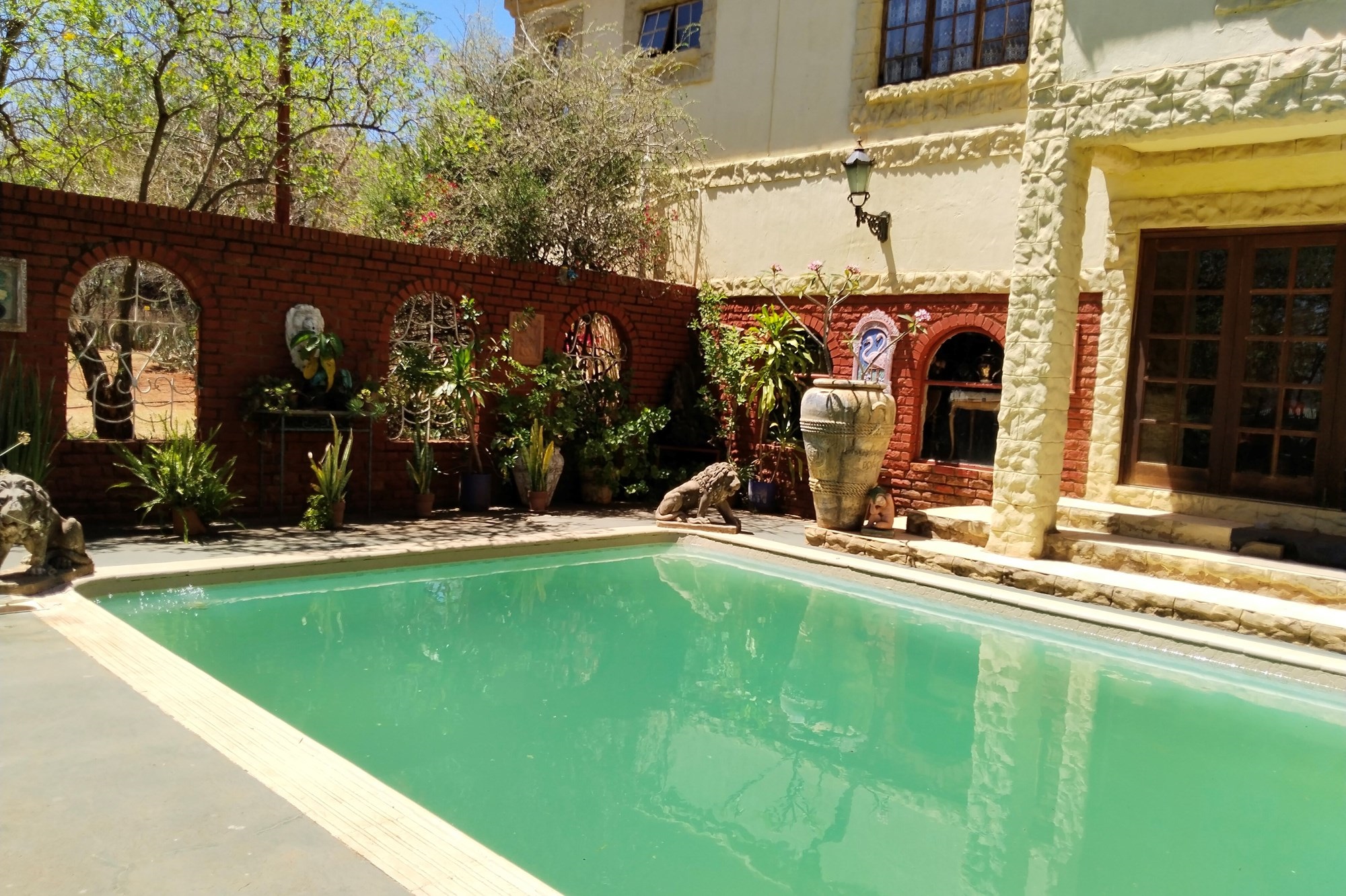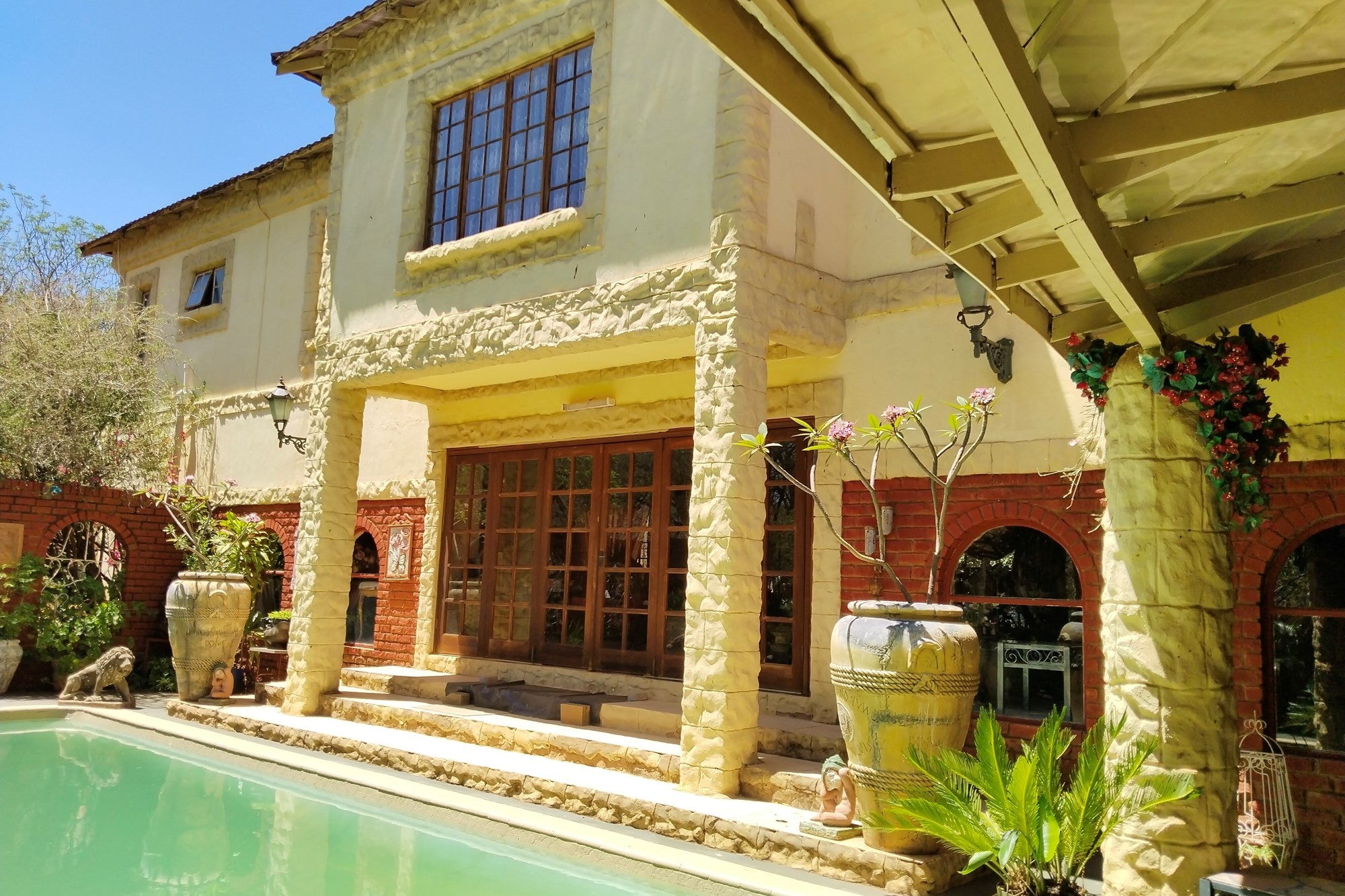 The estate features luxurious bathrooms with enclosed showers, en-suite designs, and built-in wardrobes, ensuring comfort and seclusion. The interior is elegantly decorated with a mix of brick, glass, and wood details, contributing to its rustic charm. Air conditioning throughout, partially furnished bedrooms, and staff accommodations enhance the inviting atmosphere.