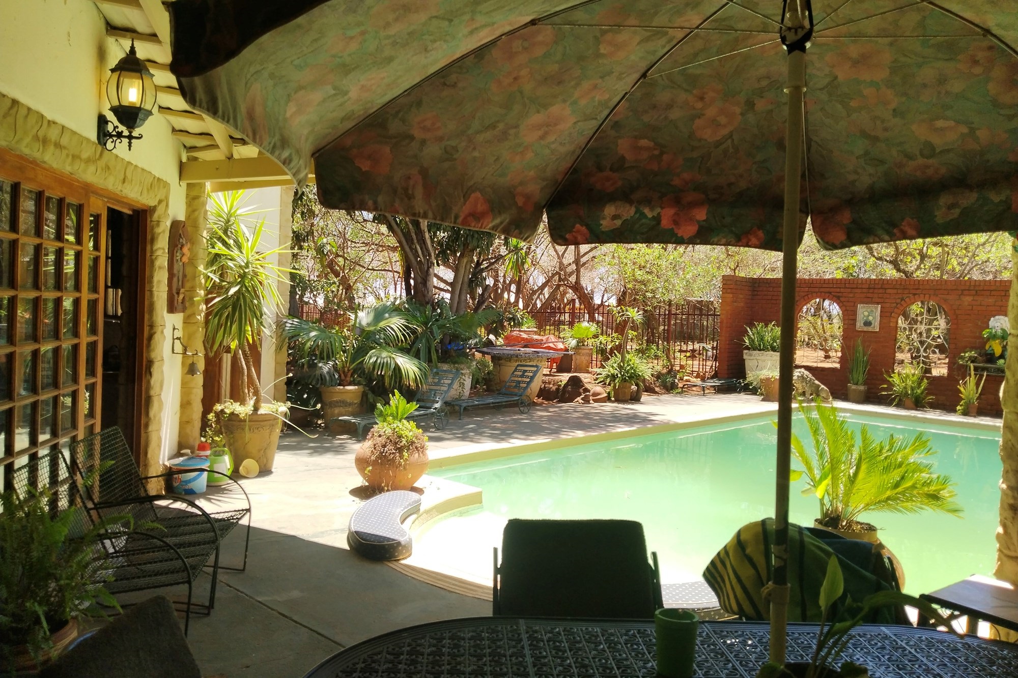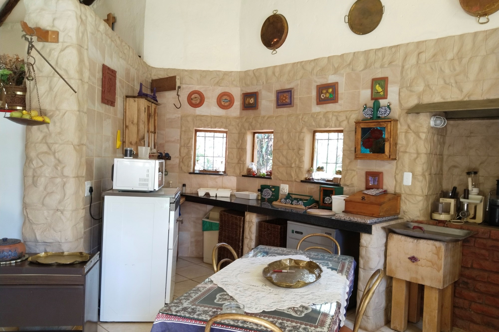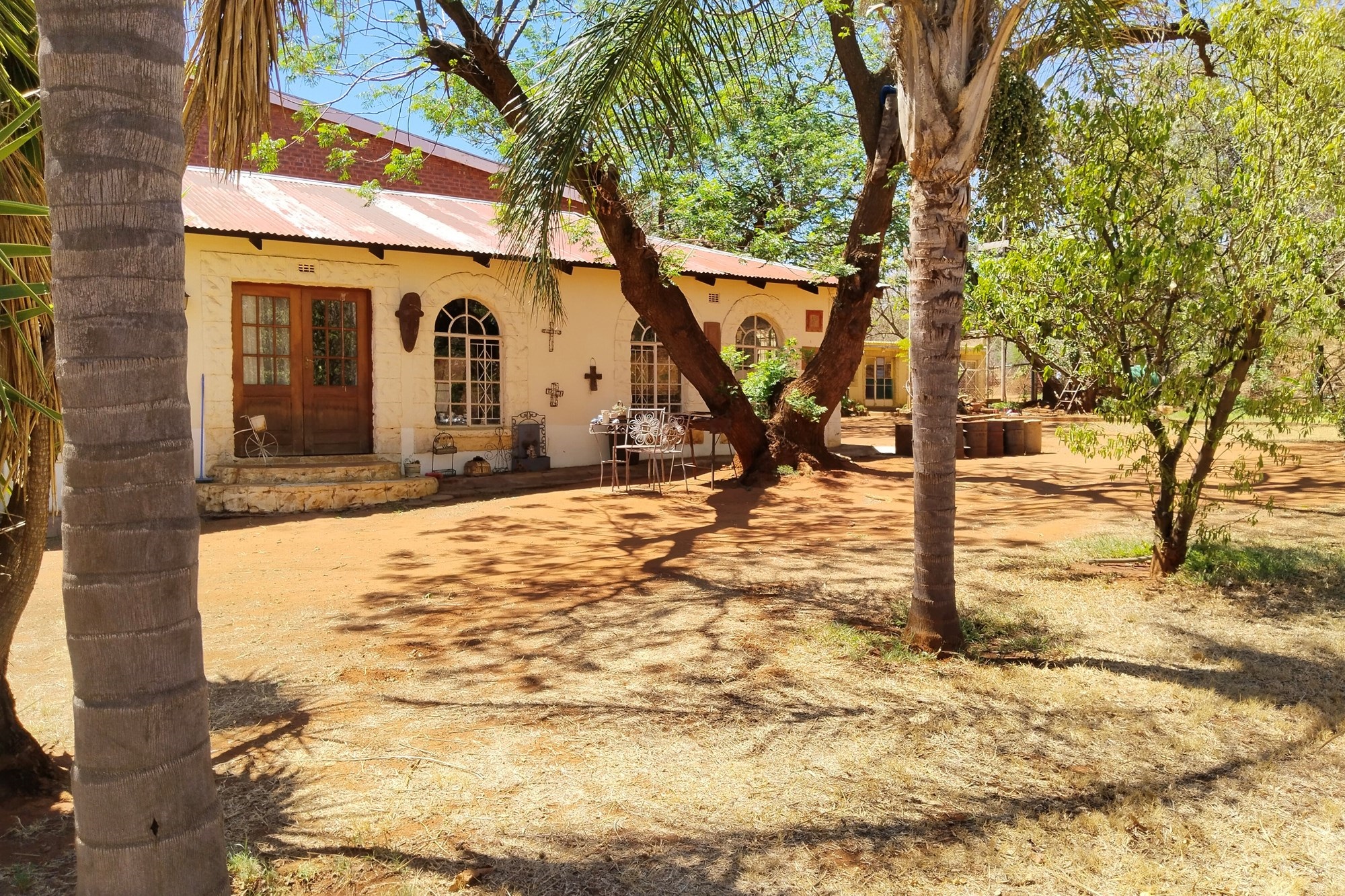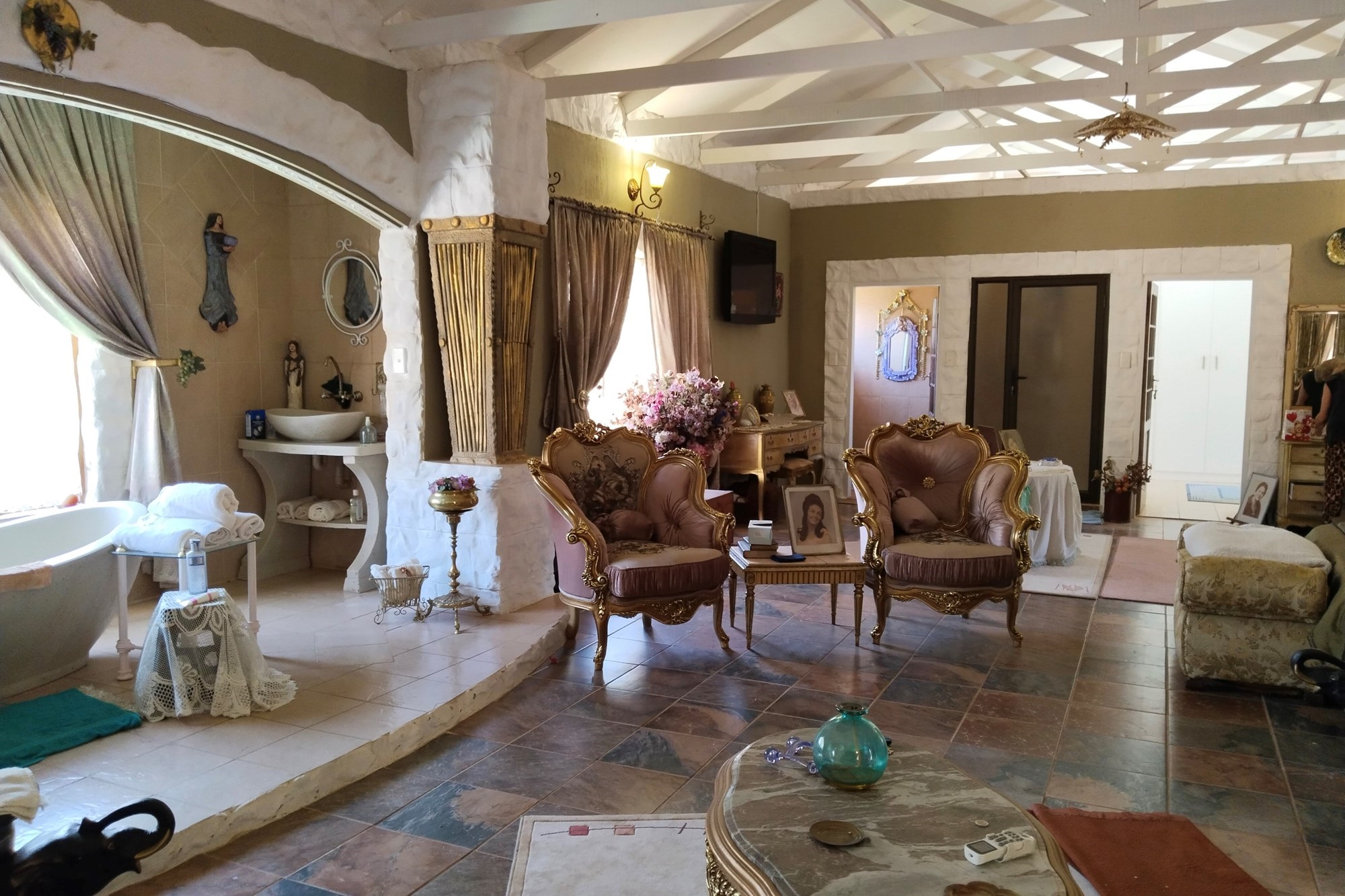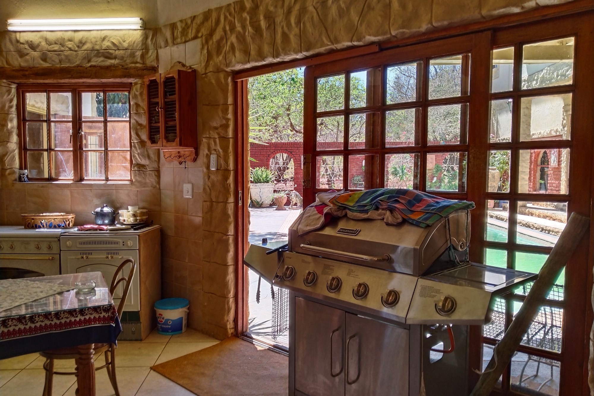 The estate features luxurious bathrooms with enclosed showers, en-suite designs, and built-in wardrobes, ensuring comfort and seclusion. The interior is elegantly decorated with a mix of brick, glass, and wood details, contributing to its rustic charm. Air conditioning throughout, partially furnished bedrooms, and staff accommodations enhance the inviting atmosphere.