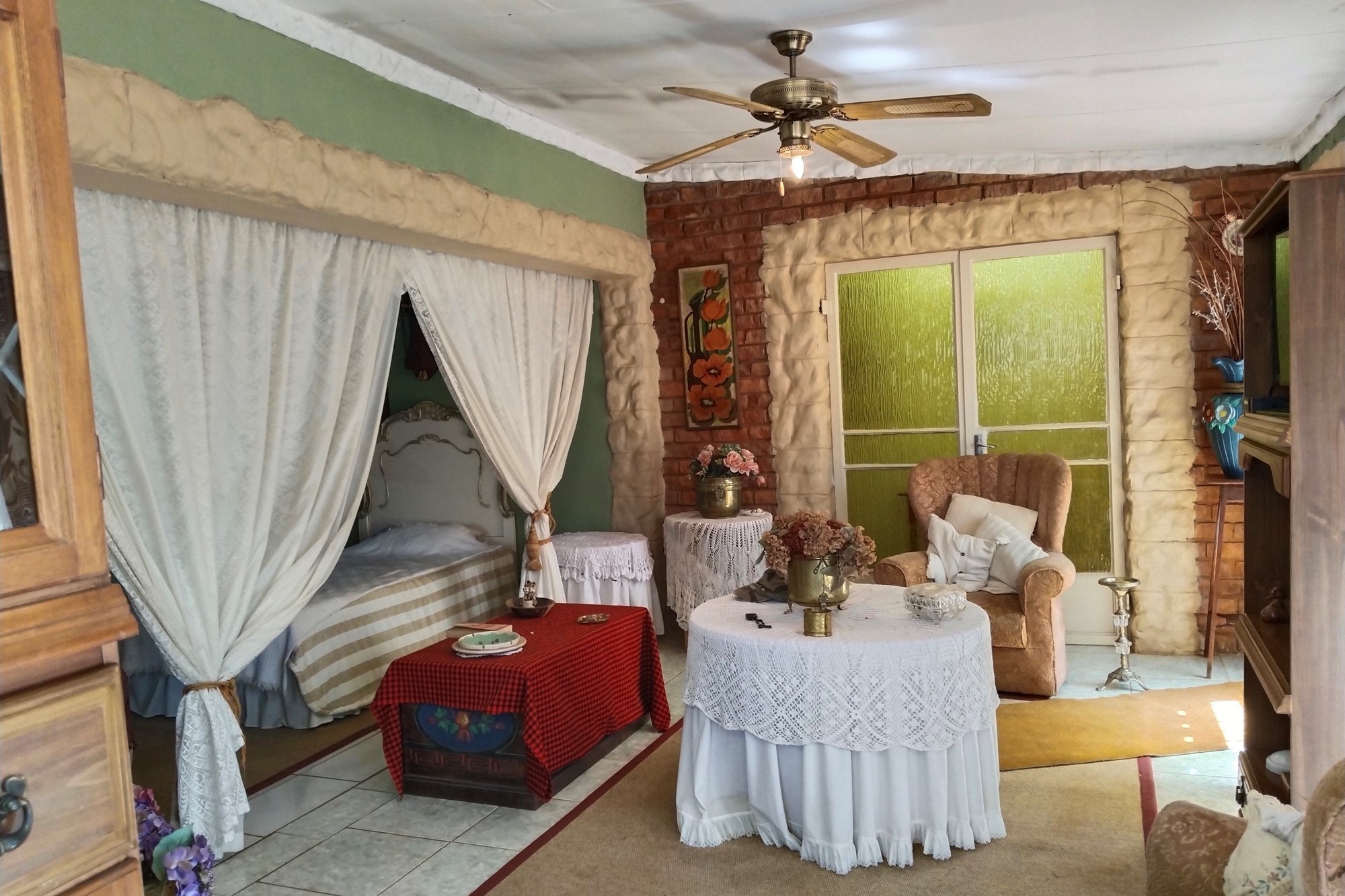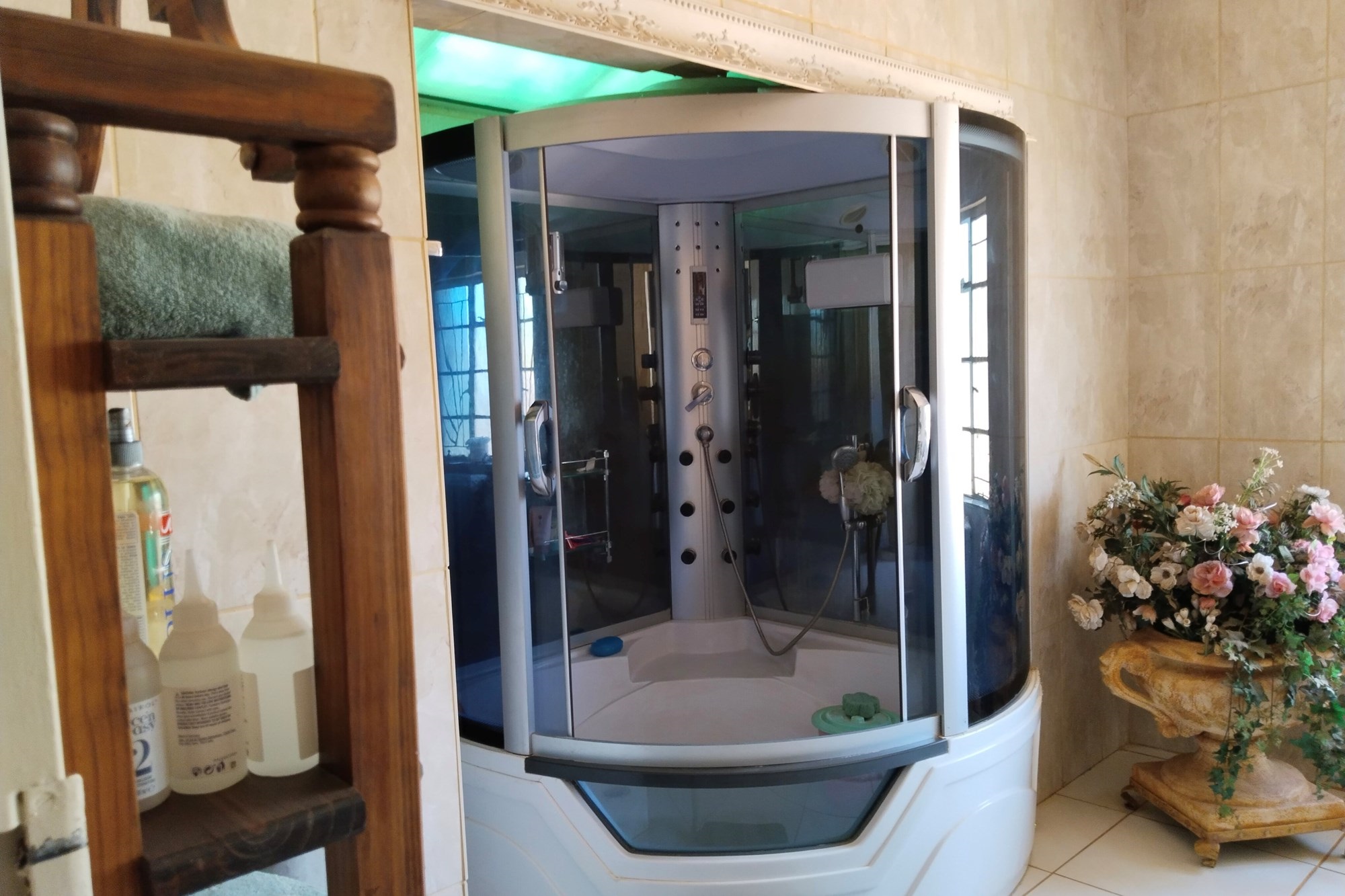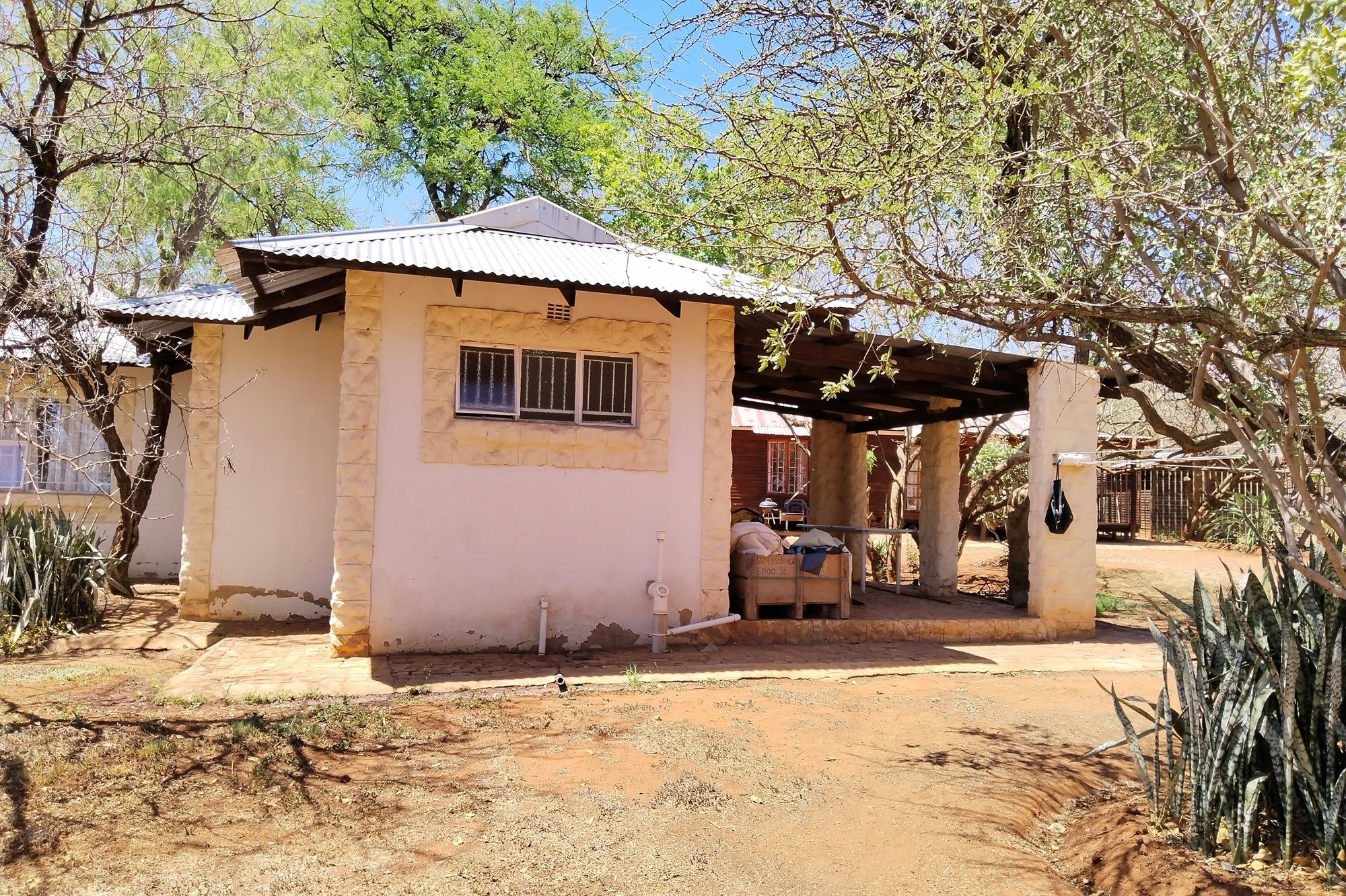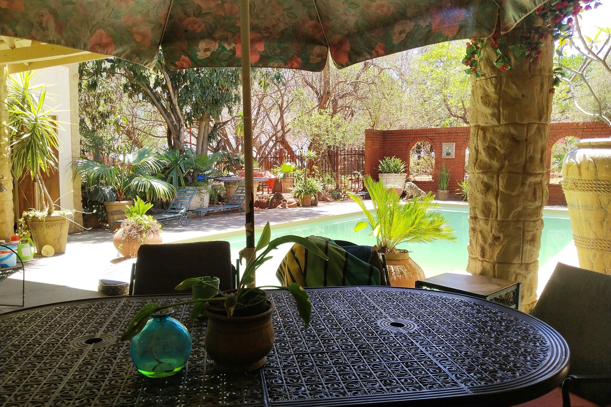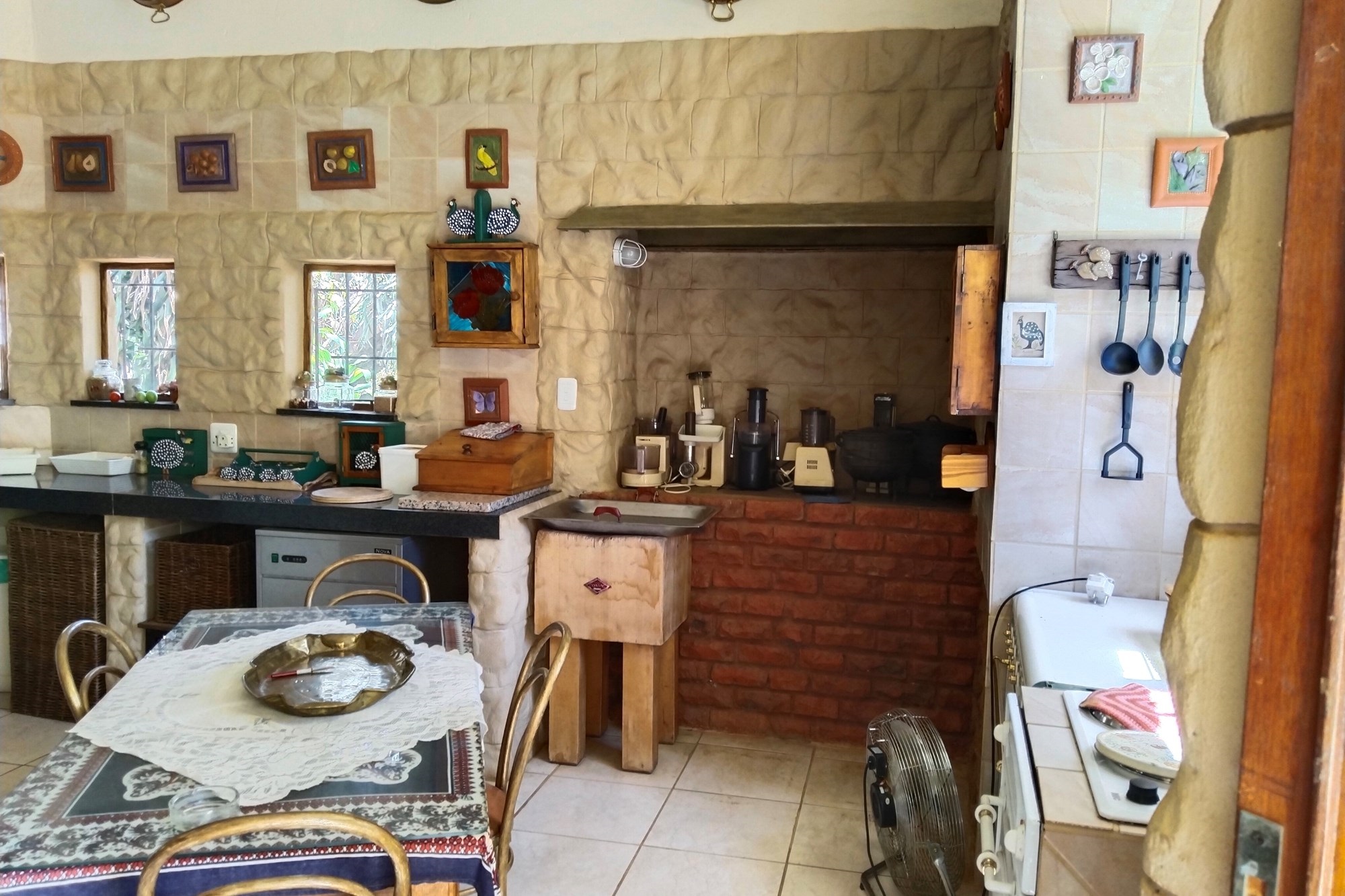 The estate features luxurious bathrooms with enclosed showers, en-suite designs, and built-in wardrobes, ensuring comfort and seclusion. The interior is elegantly decorated with a mix of brick, glass, and wood details, contributing to its rustic charm. Air conditioning throughout, partially furnished bedrooms, and staff accommodations enhance the inviting atmosphere.
