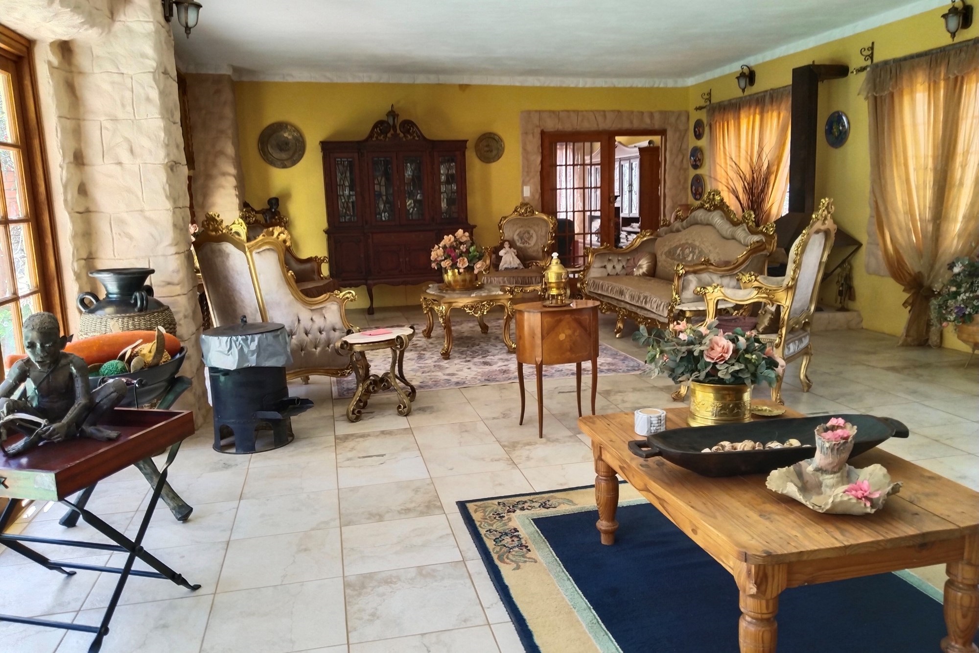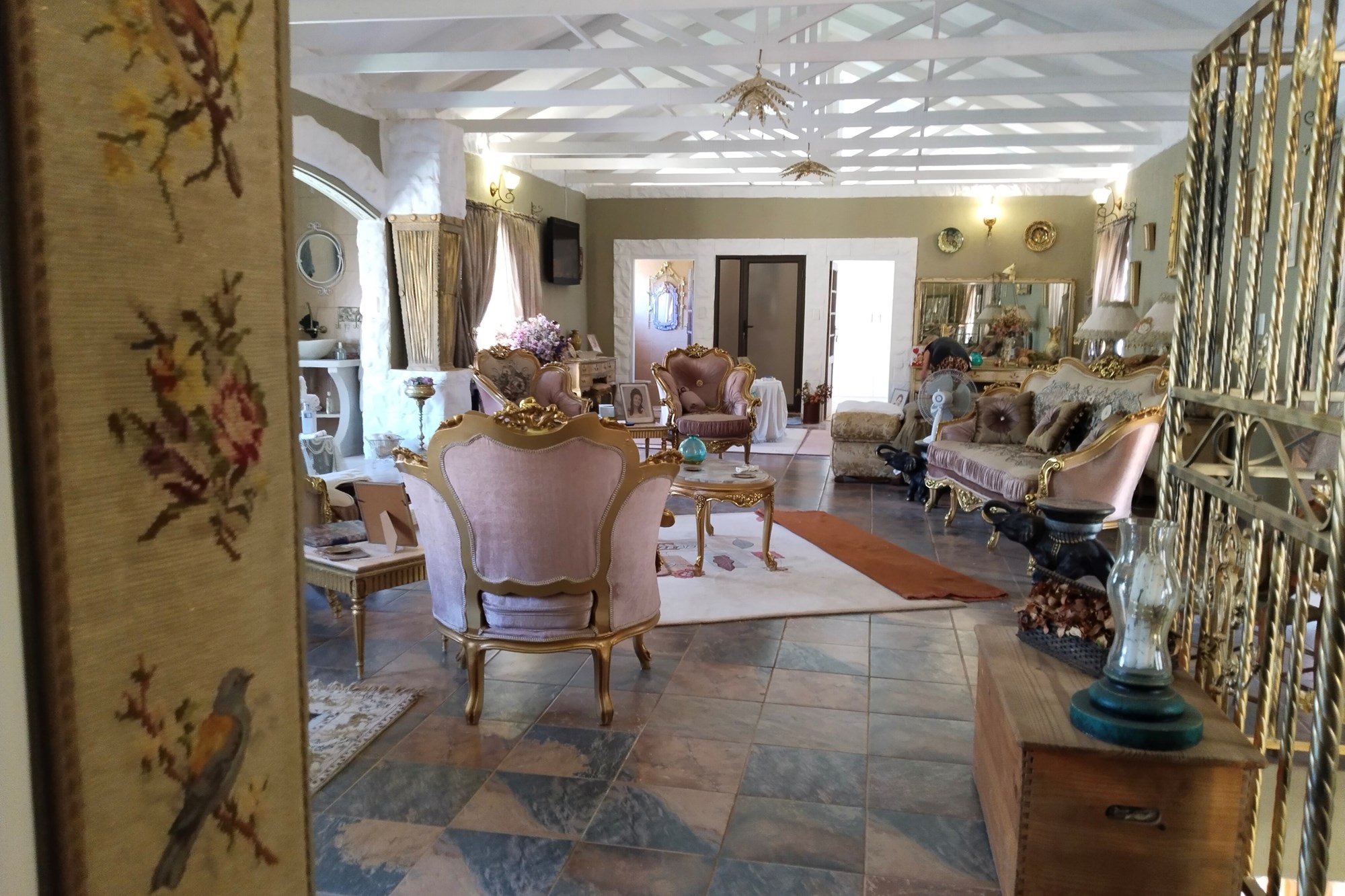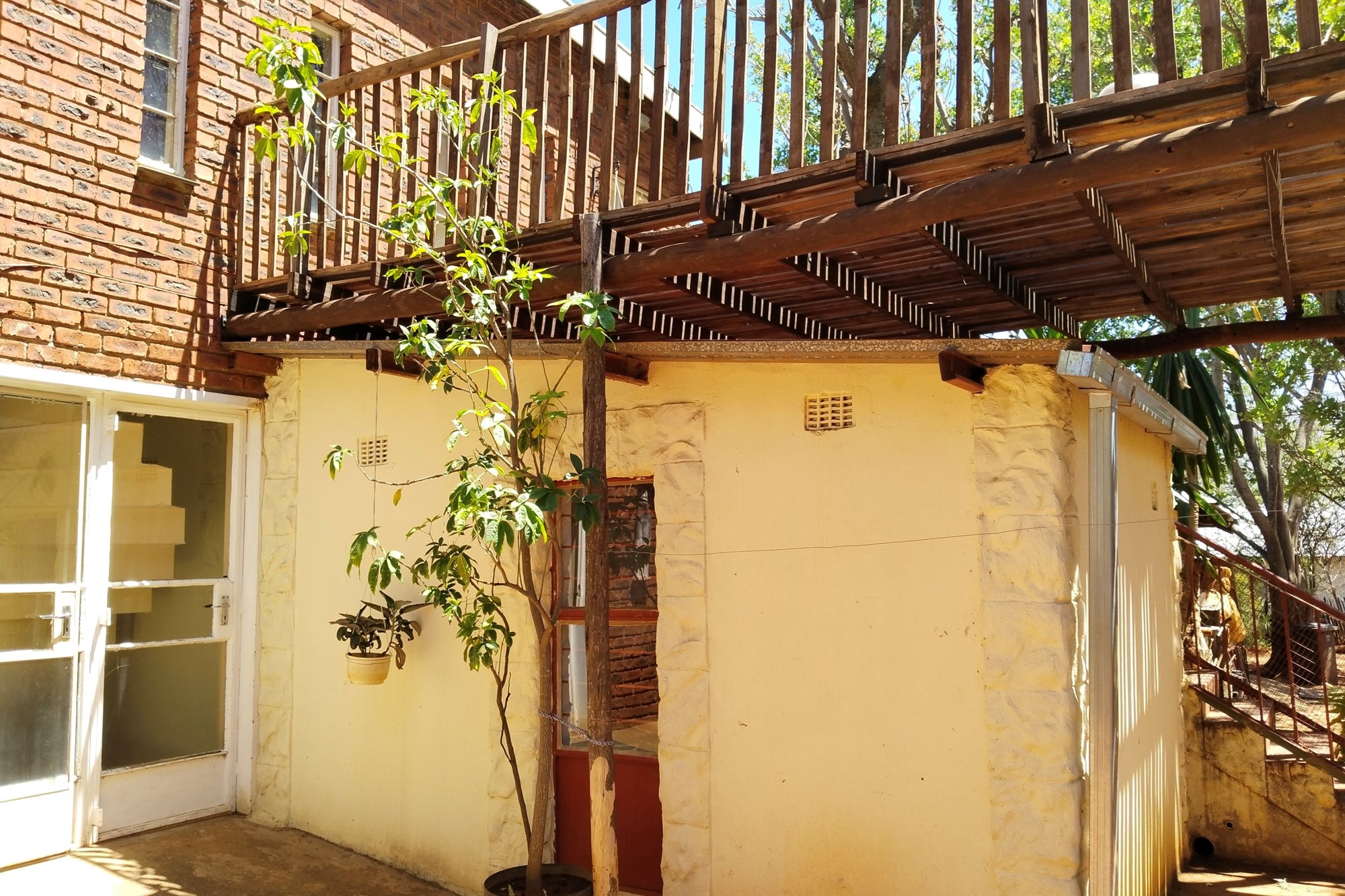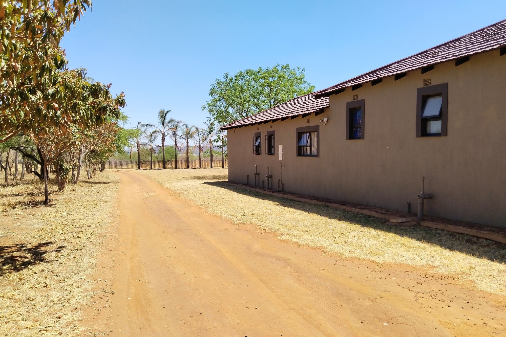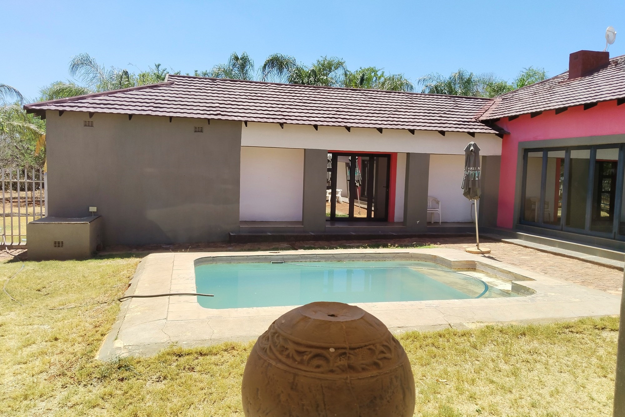 The estate features luxurious bathrooms with enclosed showers, en-suite designs, and built-in wardrobes, ensuring comfort and seclusion. The interior is elegantly decorated with a mix of brick, glass, and wood details, contributing to its rustic charm. Air conditioning throughout, partially furnished bedrooms, and staff accommodations enhance the inviting atmosphere.