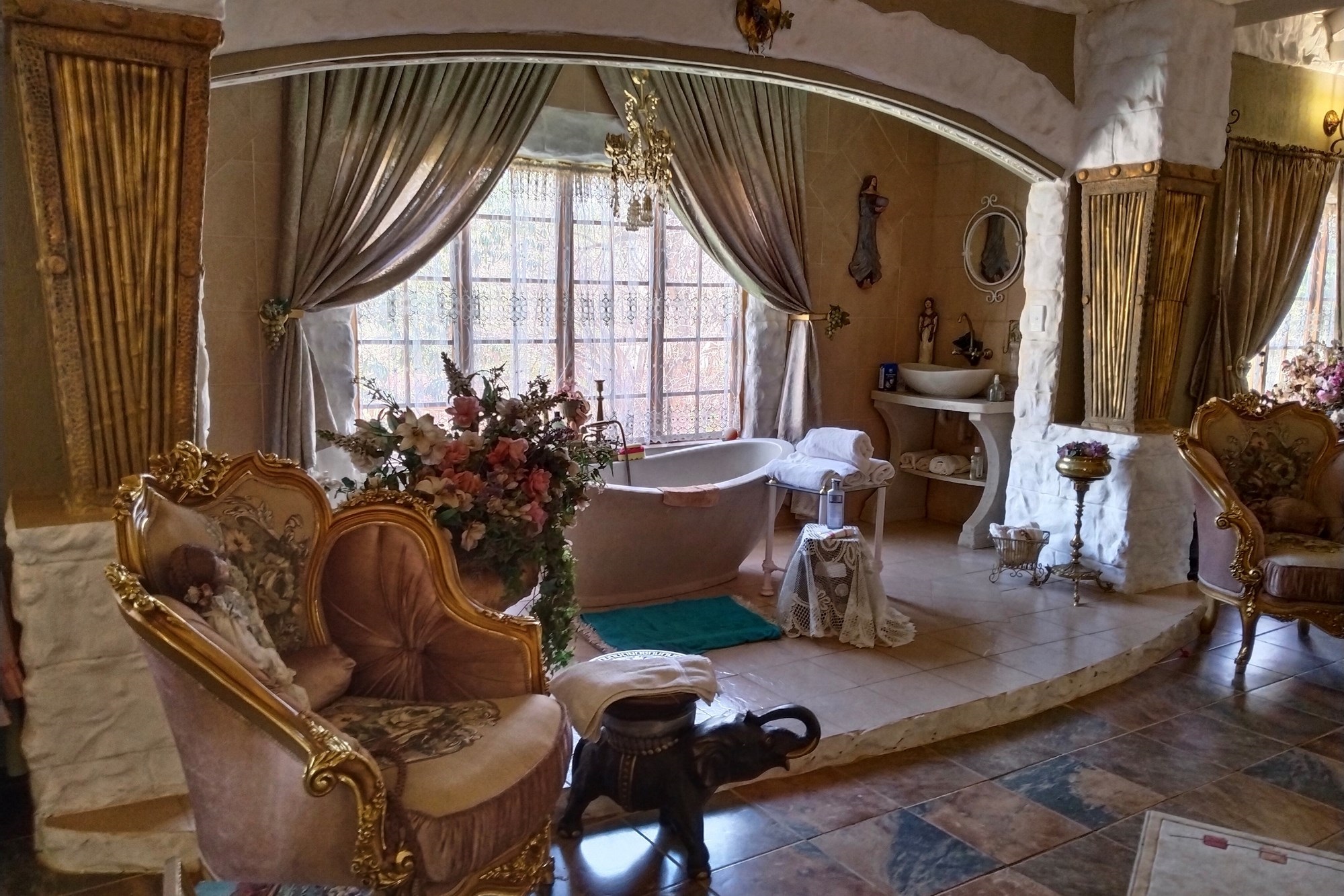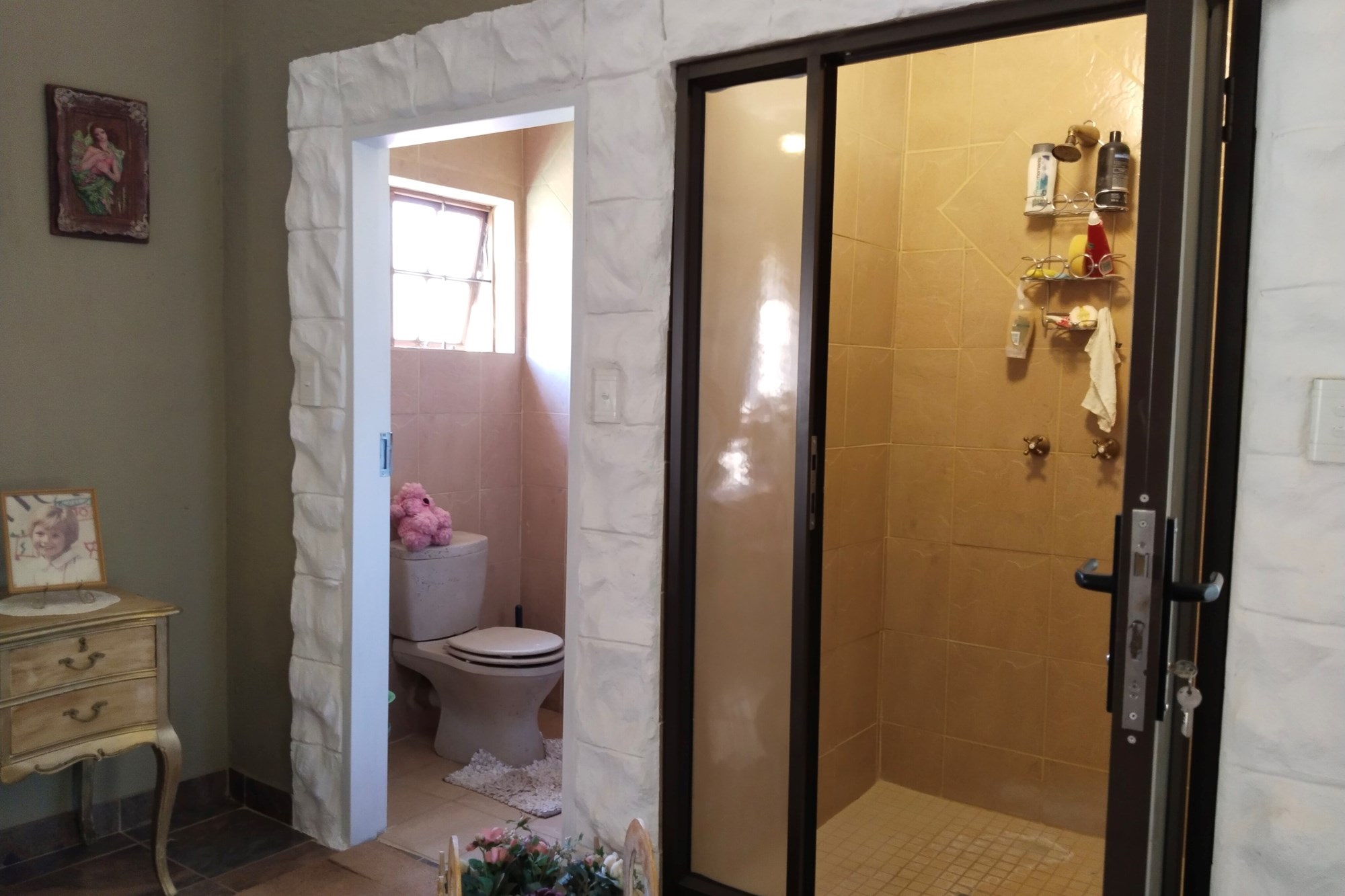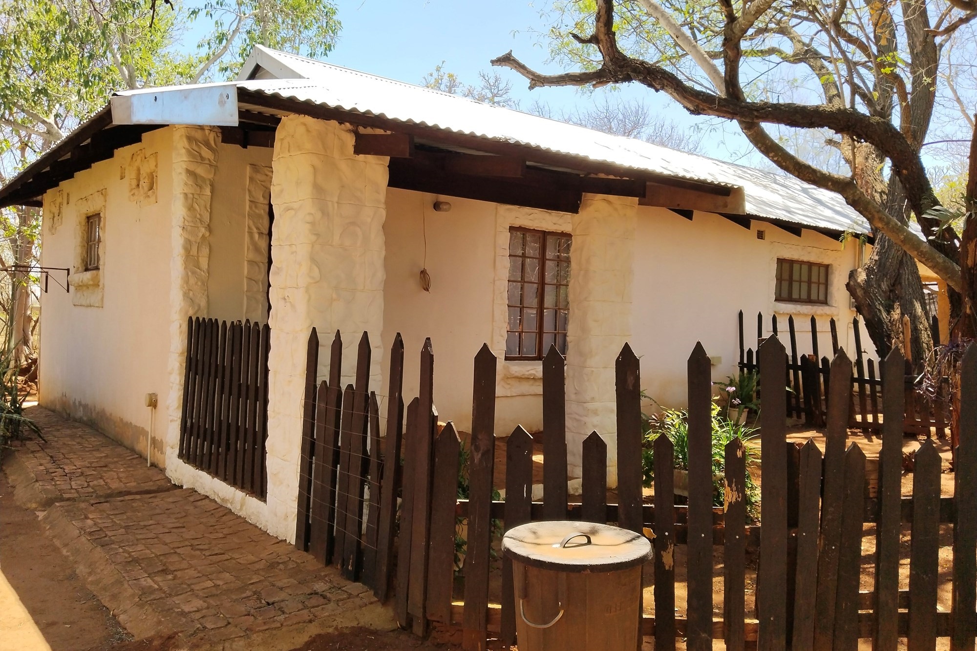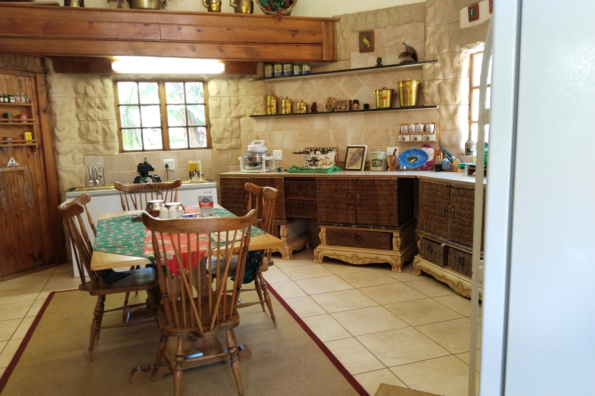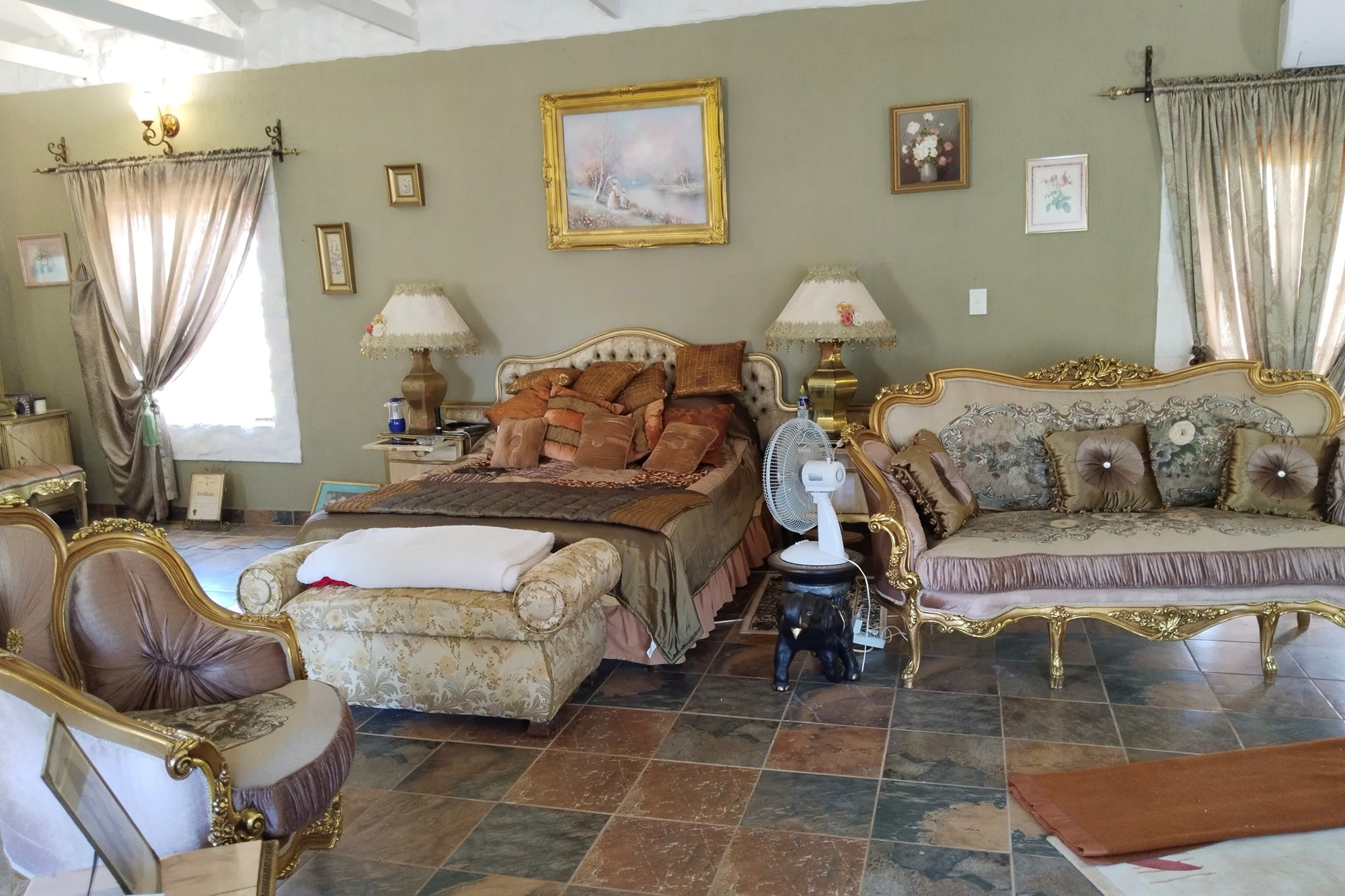 The estate features luxurious bathrooms with enclosed showers, en-suite designs, and built-in wardrobes, ensuring comfort and seclusion. The interior is elegantly decorated with a mix of brick, glass, and wood details, contributing to its rustic charm. Air conditioning throughout, partially furnished bedrooms, and staff accommodations enhance the inviting atmosphere.