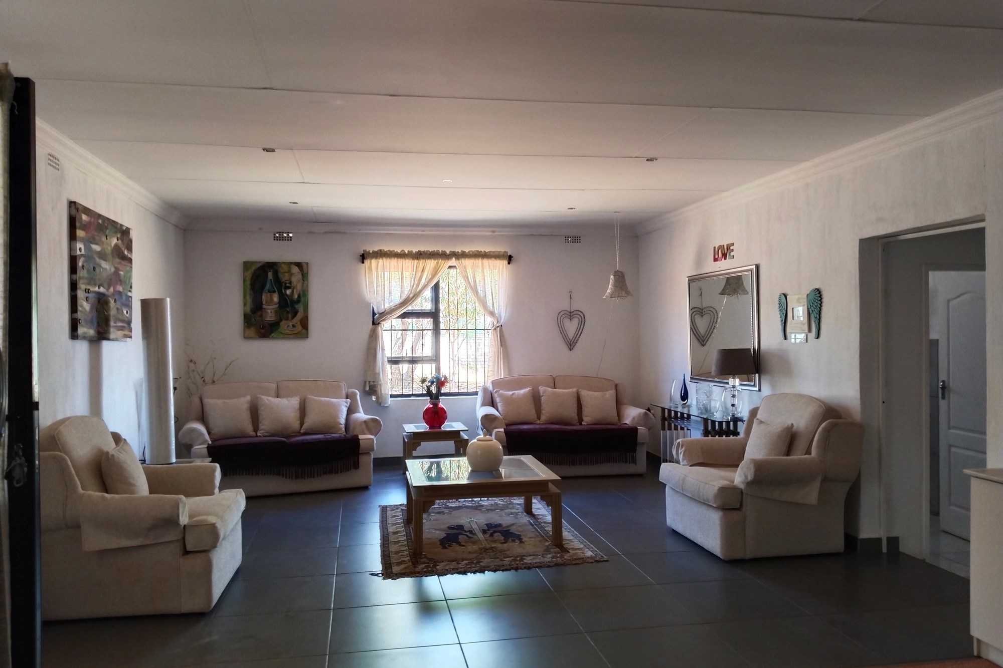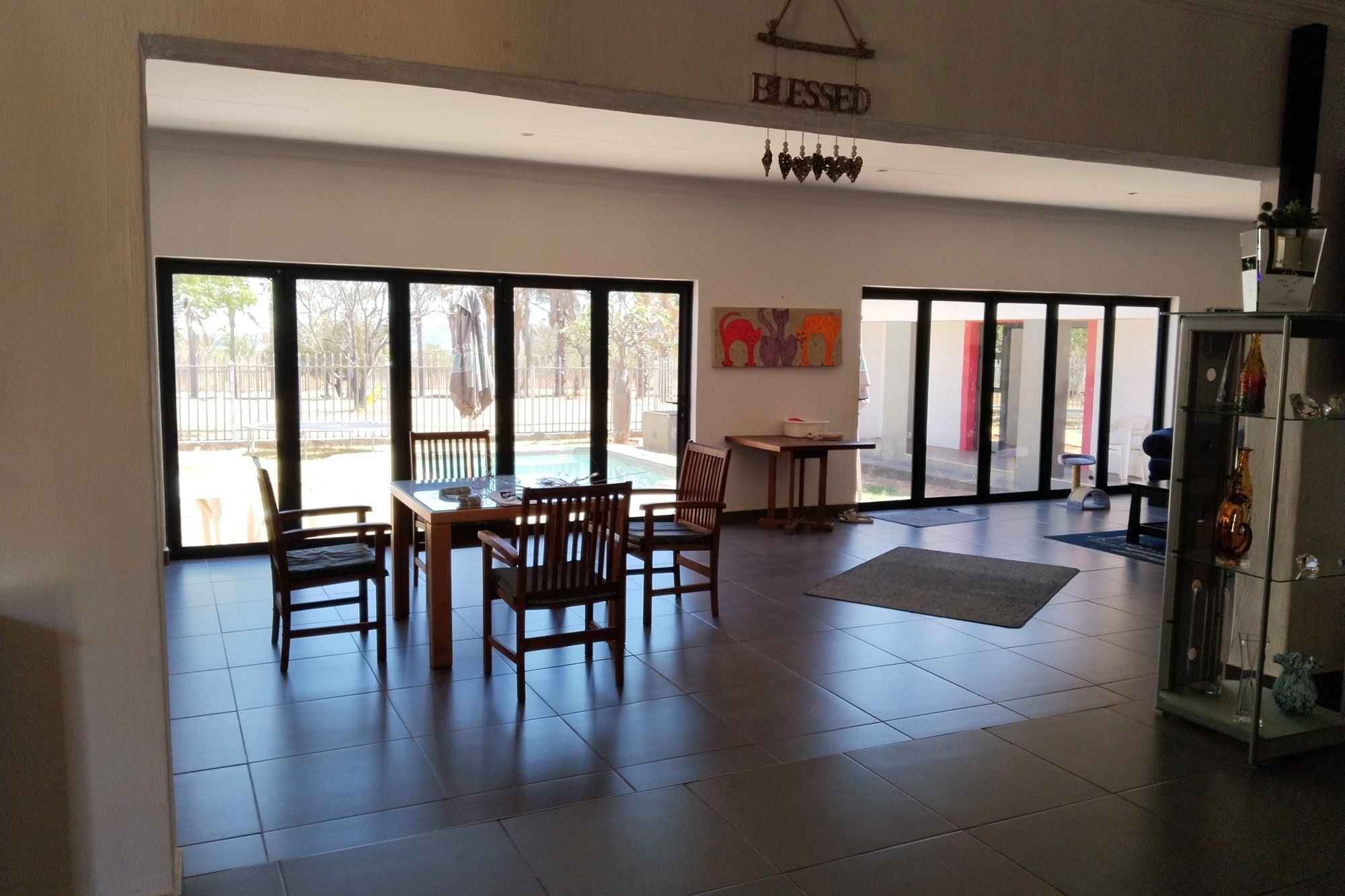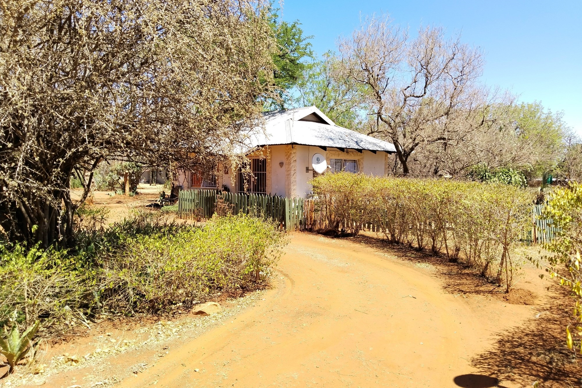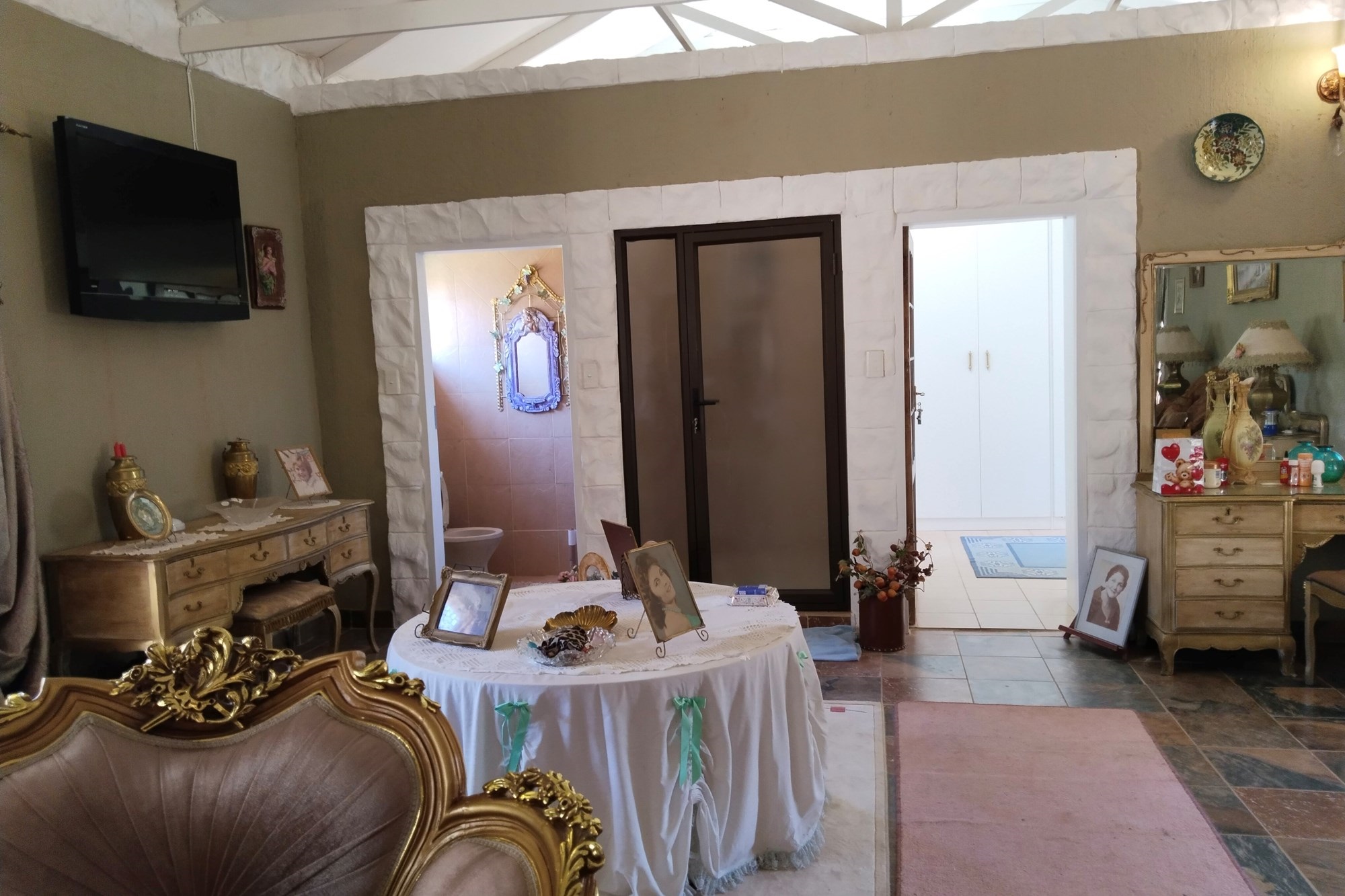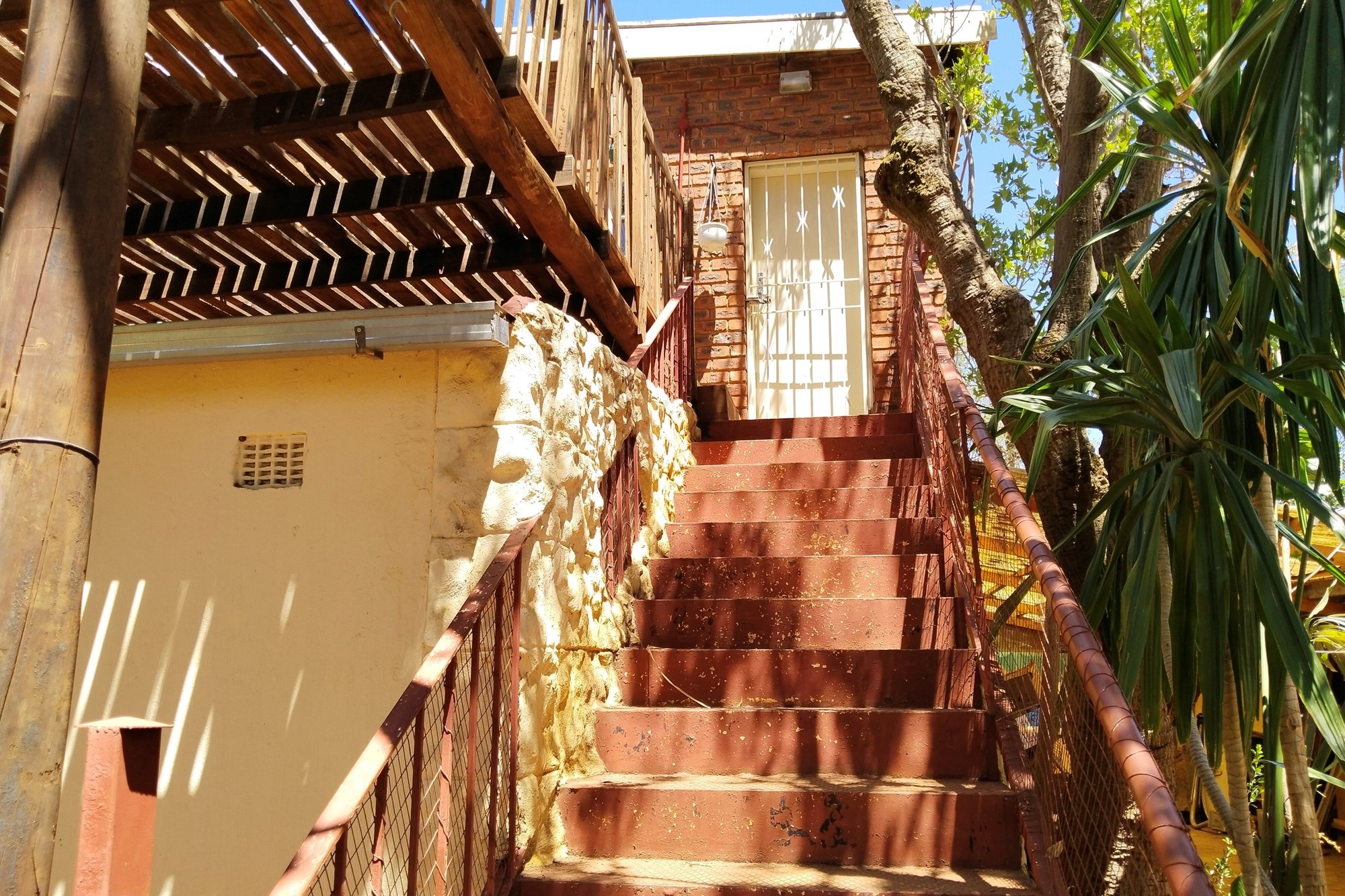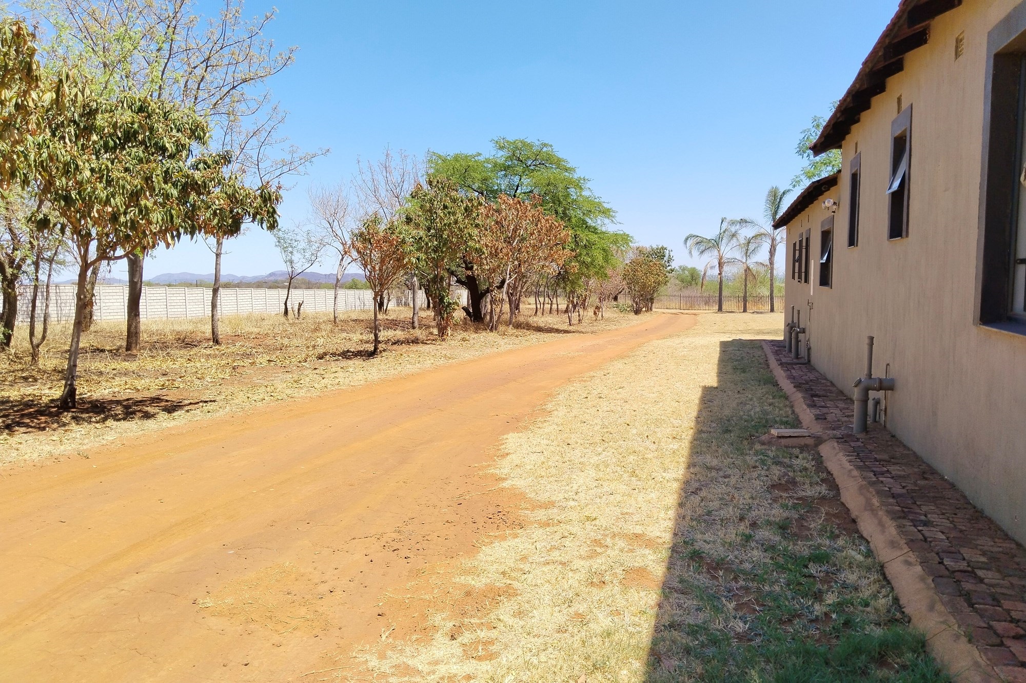 The estate features luxurious bathrooms with enclosed showers, en-suite designs, and built-in wardrobes, ensuring comfort and seclusion. The interior is elegantly decorated with a mix of brick, glass, and wood details, contributing to its rustic charm. Air conditioning throughout, partially furnished bedrooms, and staff accommodations enhance the inviting atmosphere.