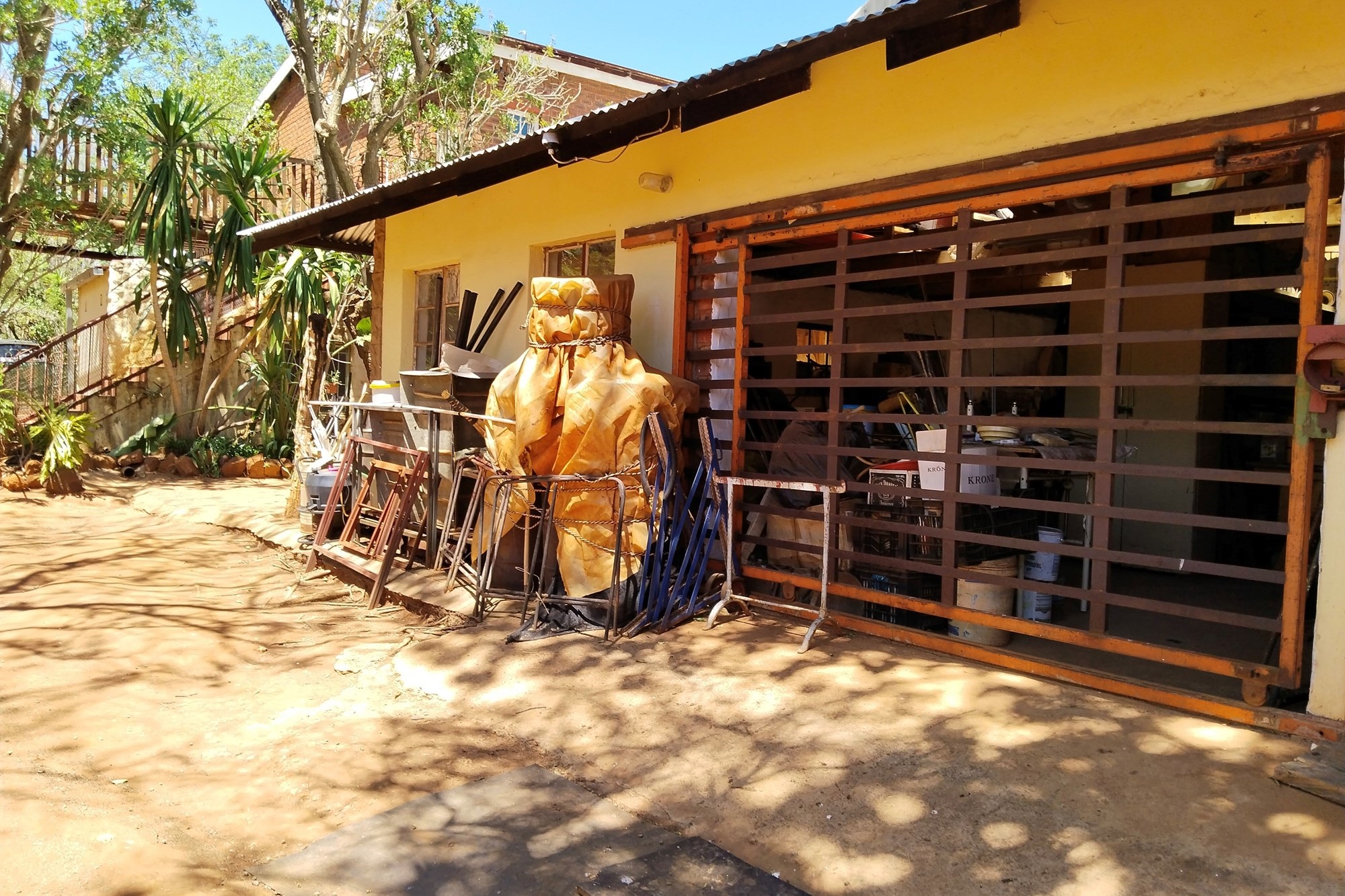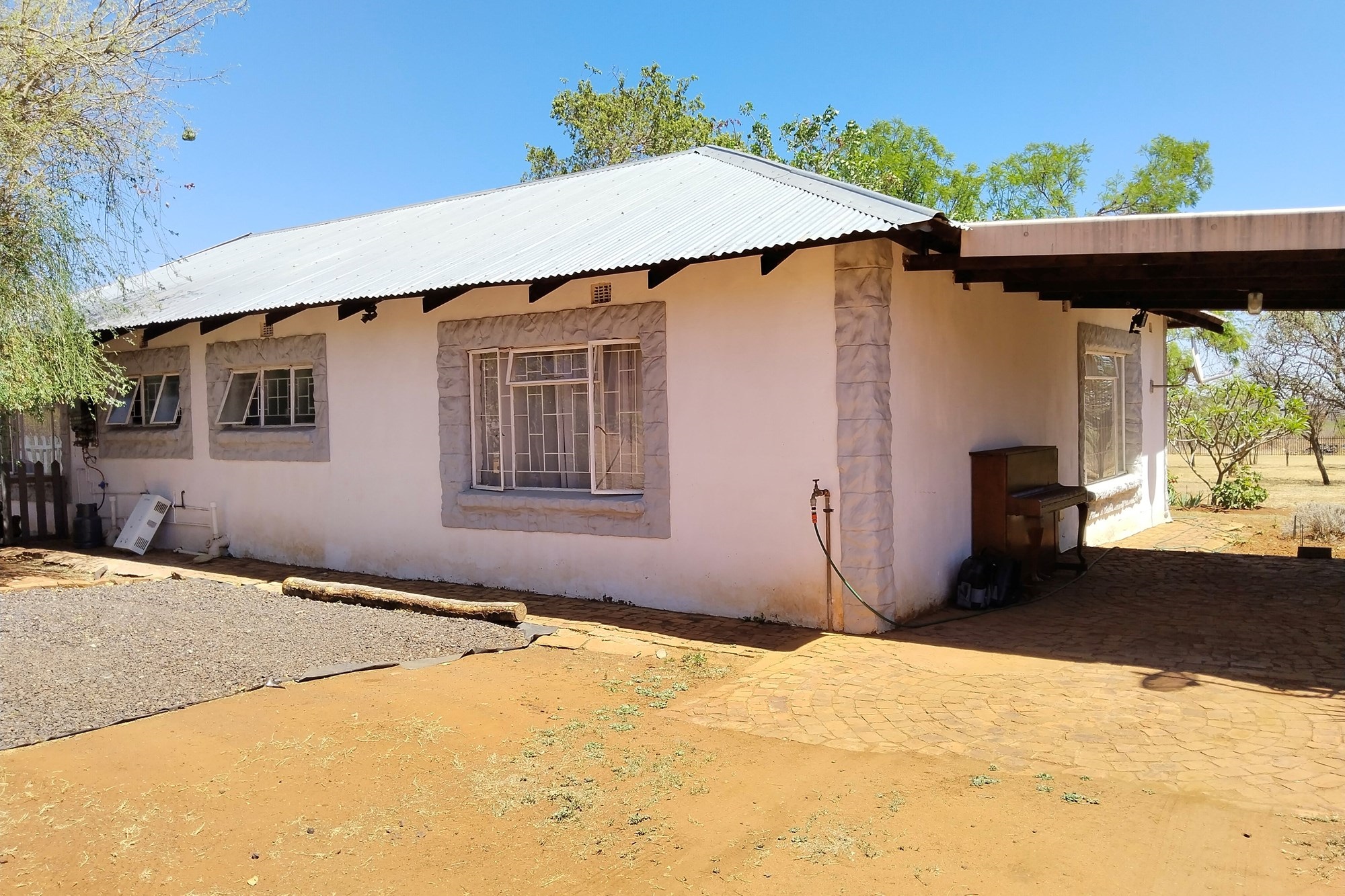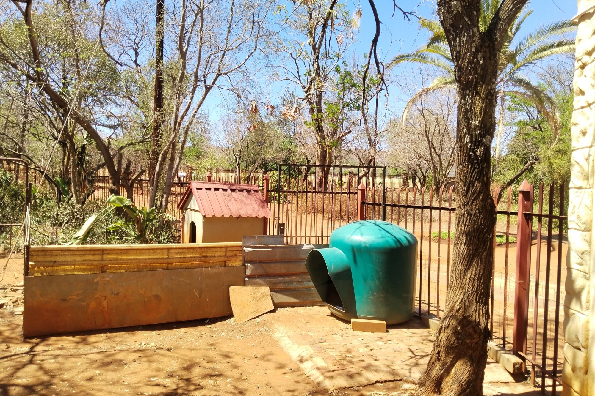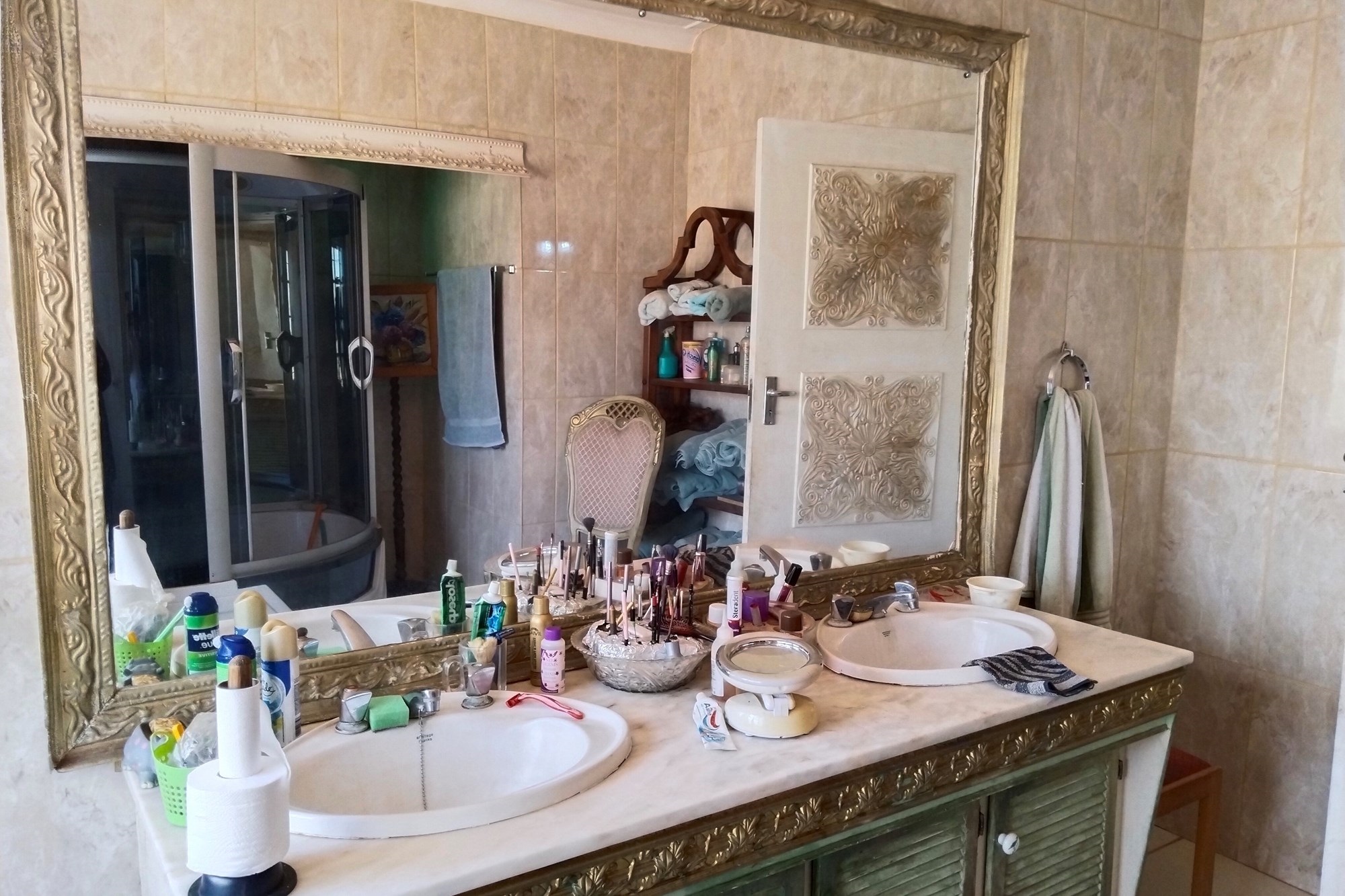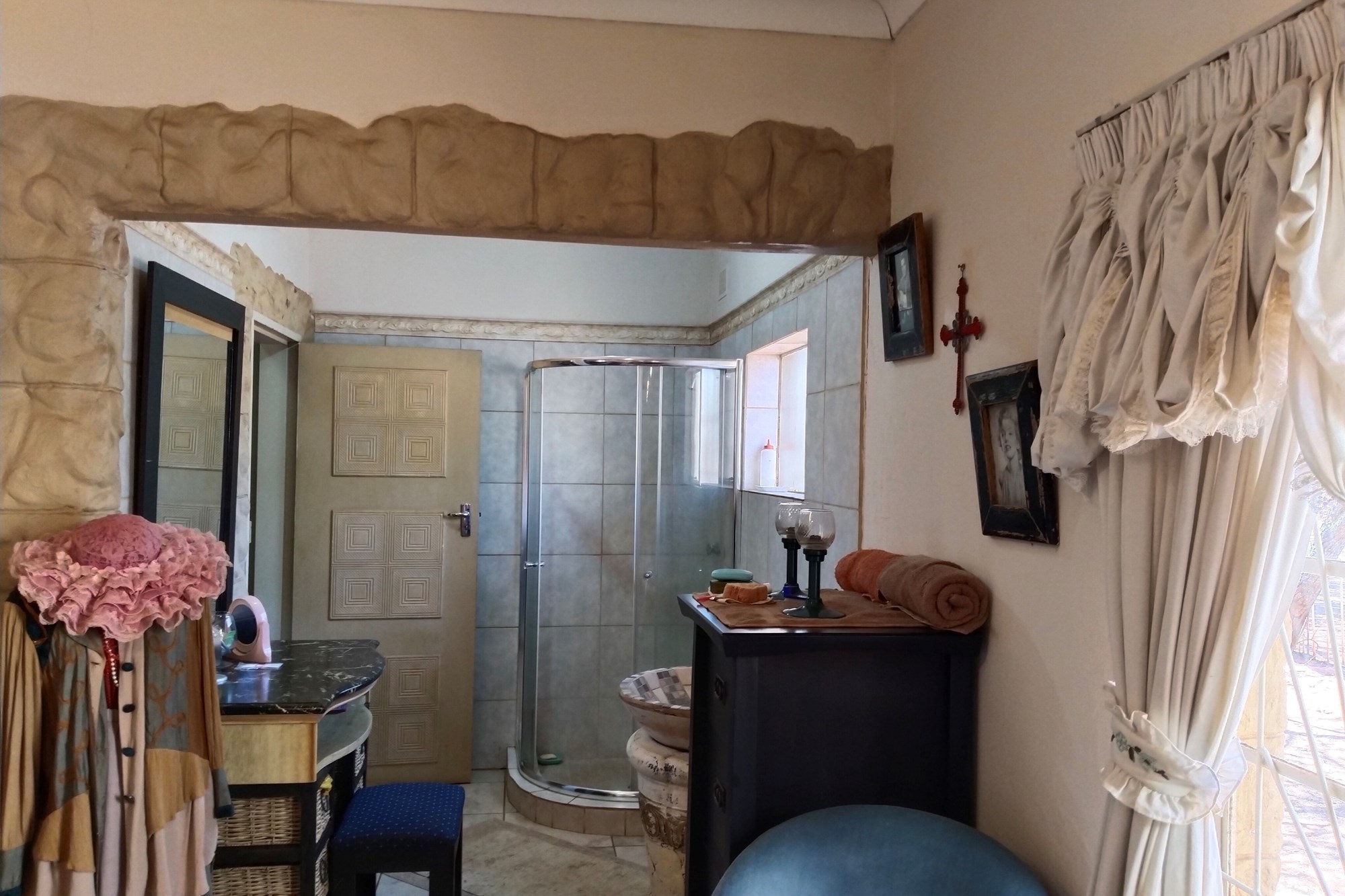 The estate features luxurious bathrooms with enclosed showers, en-suite designs, and built-in wardrobes, ensuring comfort and seclusion. The interior is elegantly decorated with a mix of brick, glass, and wood details, contributing to its rustic charm. Air conditioning throughout, partially furnished bedrooms, and staff accommodations enhance the inviting atmosphere.