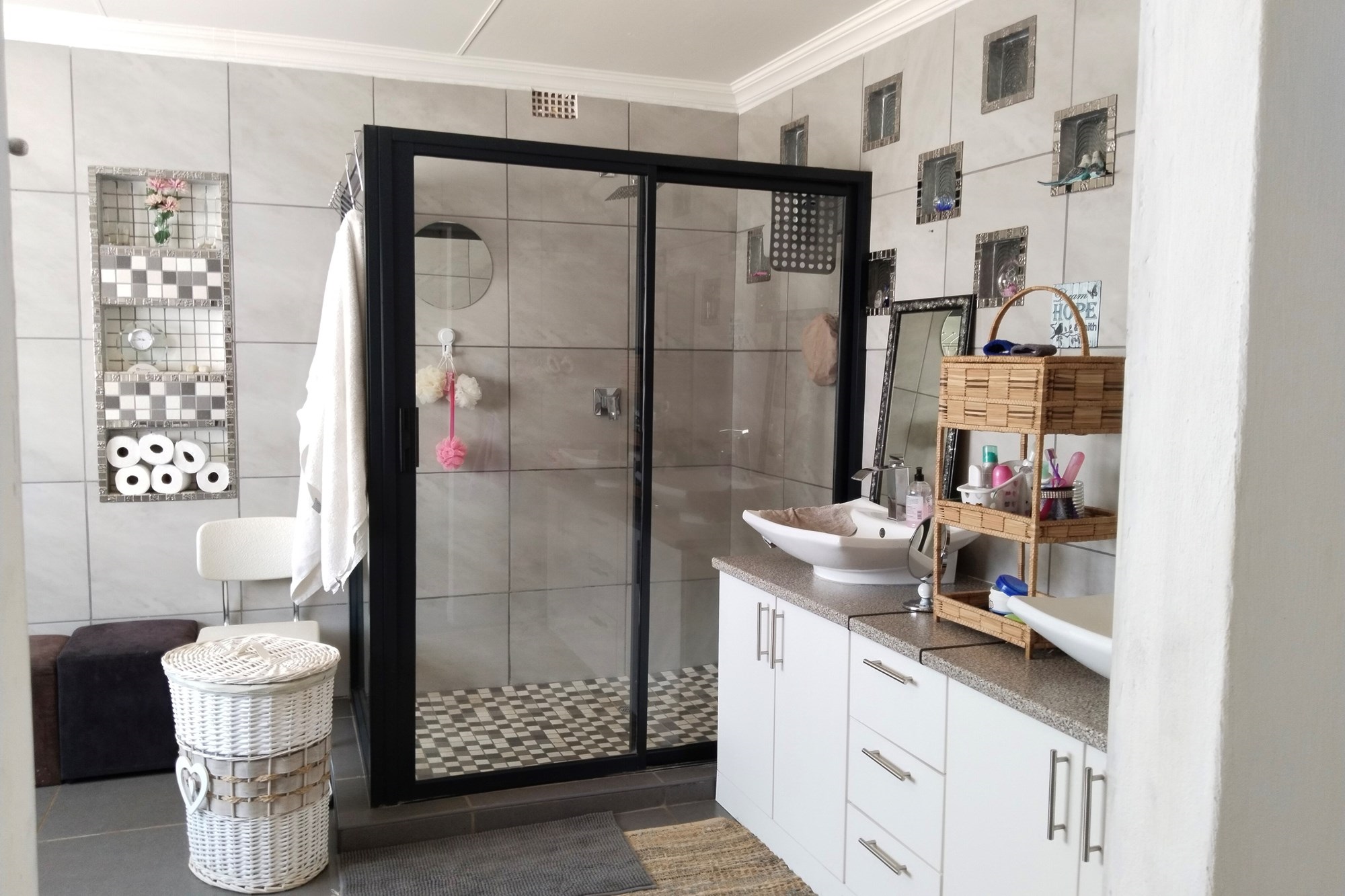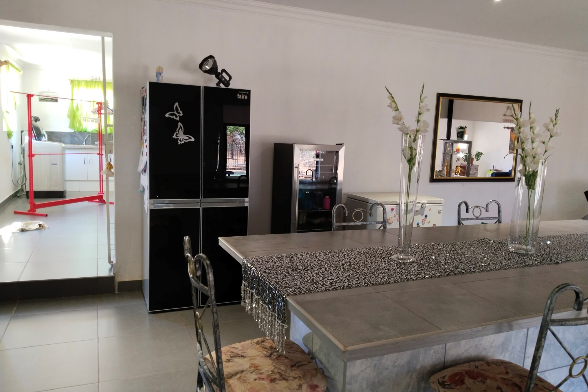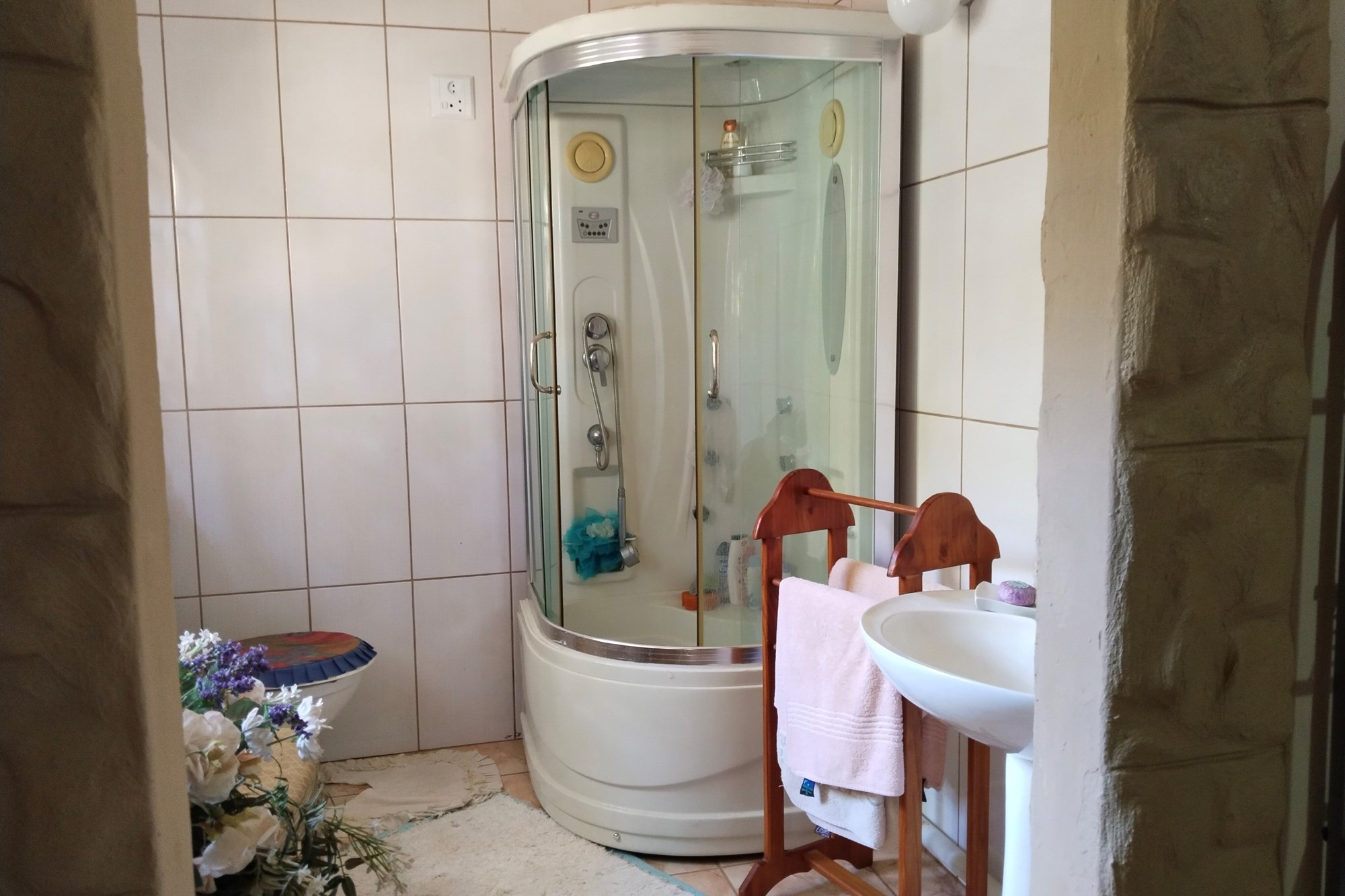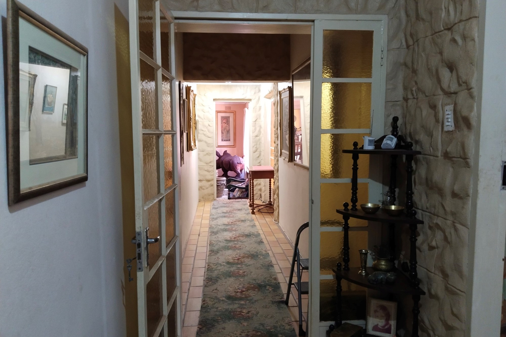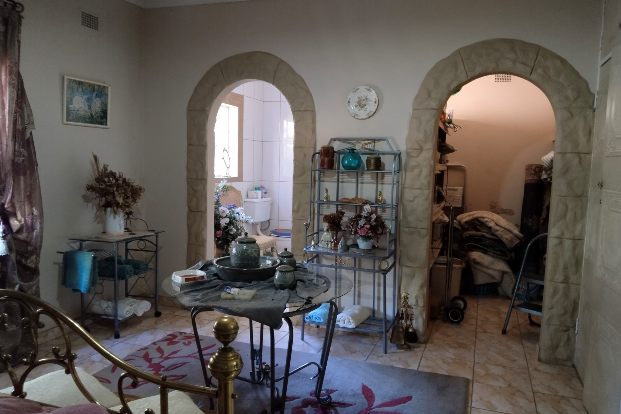 The estate features luxurious bathrooms with enclosed showers, en-suite designs, and built-in wardrobes, ensuring comfort and seclusion. The interior is elegantly decorated with a mix of brick, glass, and wood details, contributing to its rustic charm. Air conditioning throughout, partially furnished bedrooms, and staff accommodations enhance the inviting atmosphere.