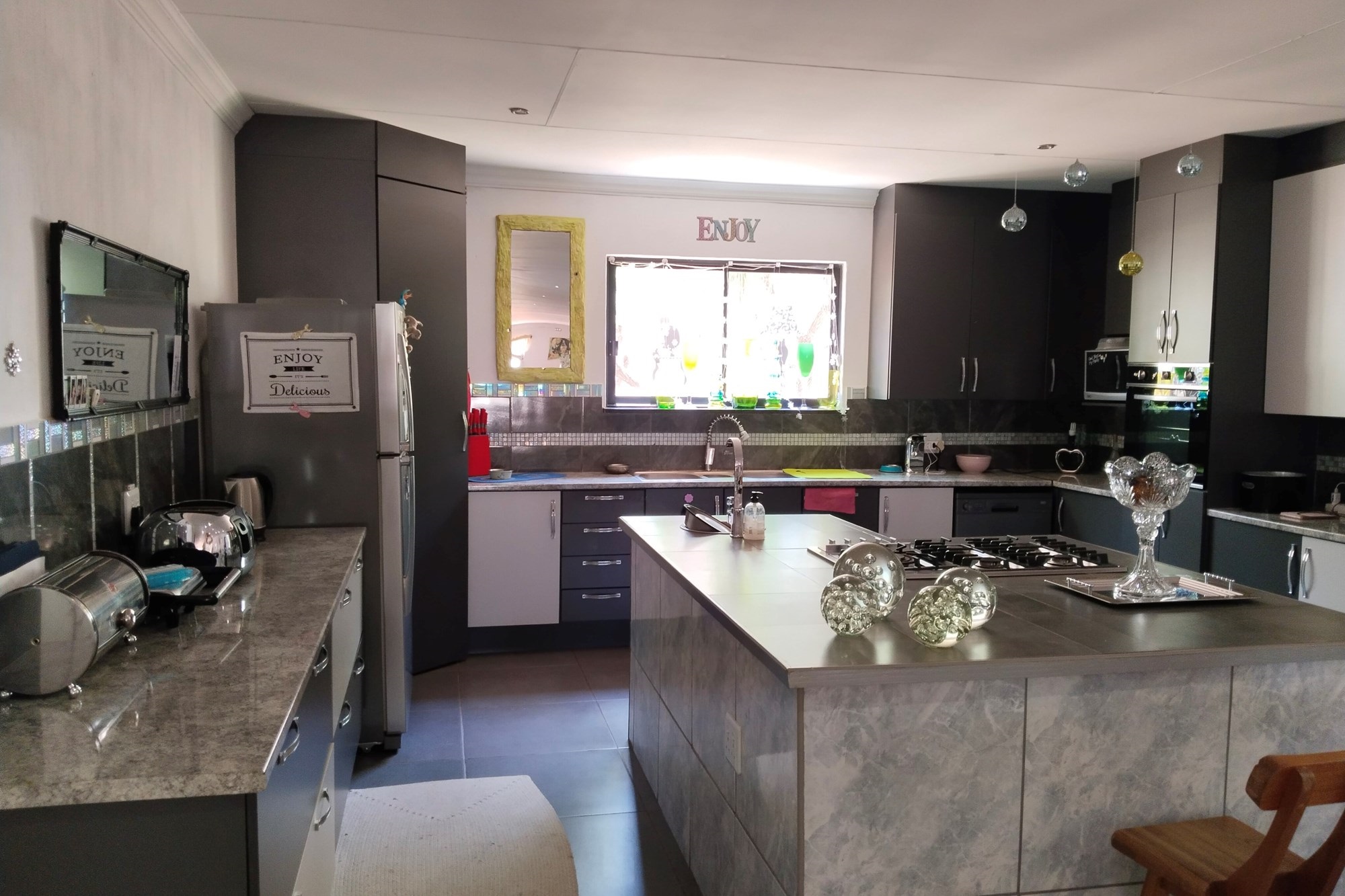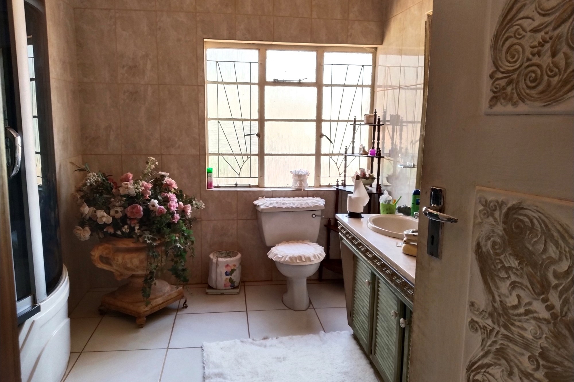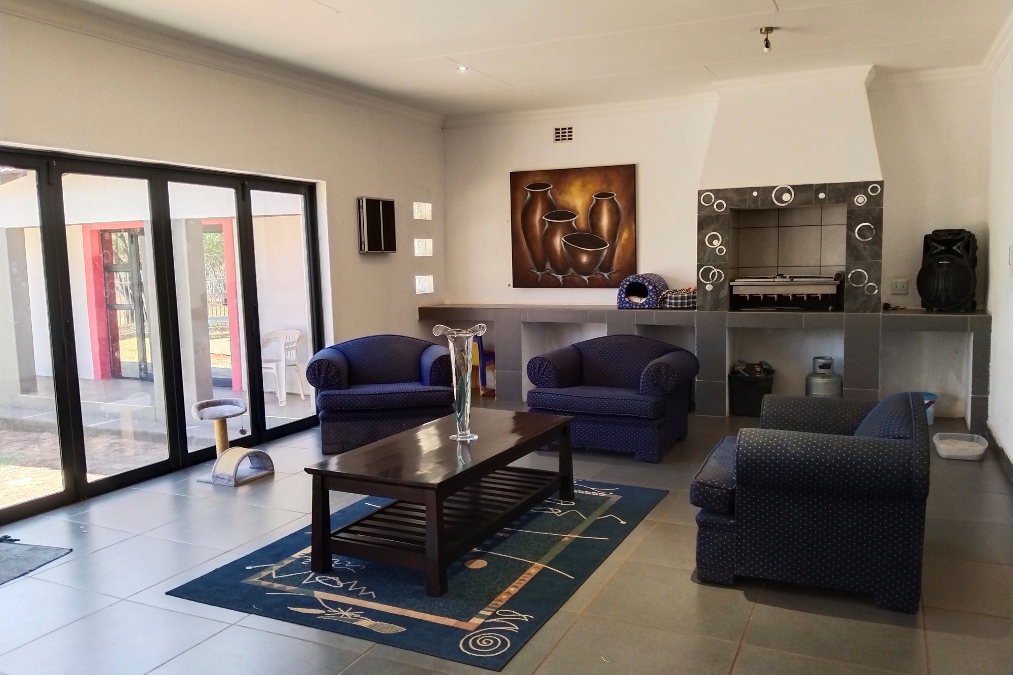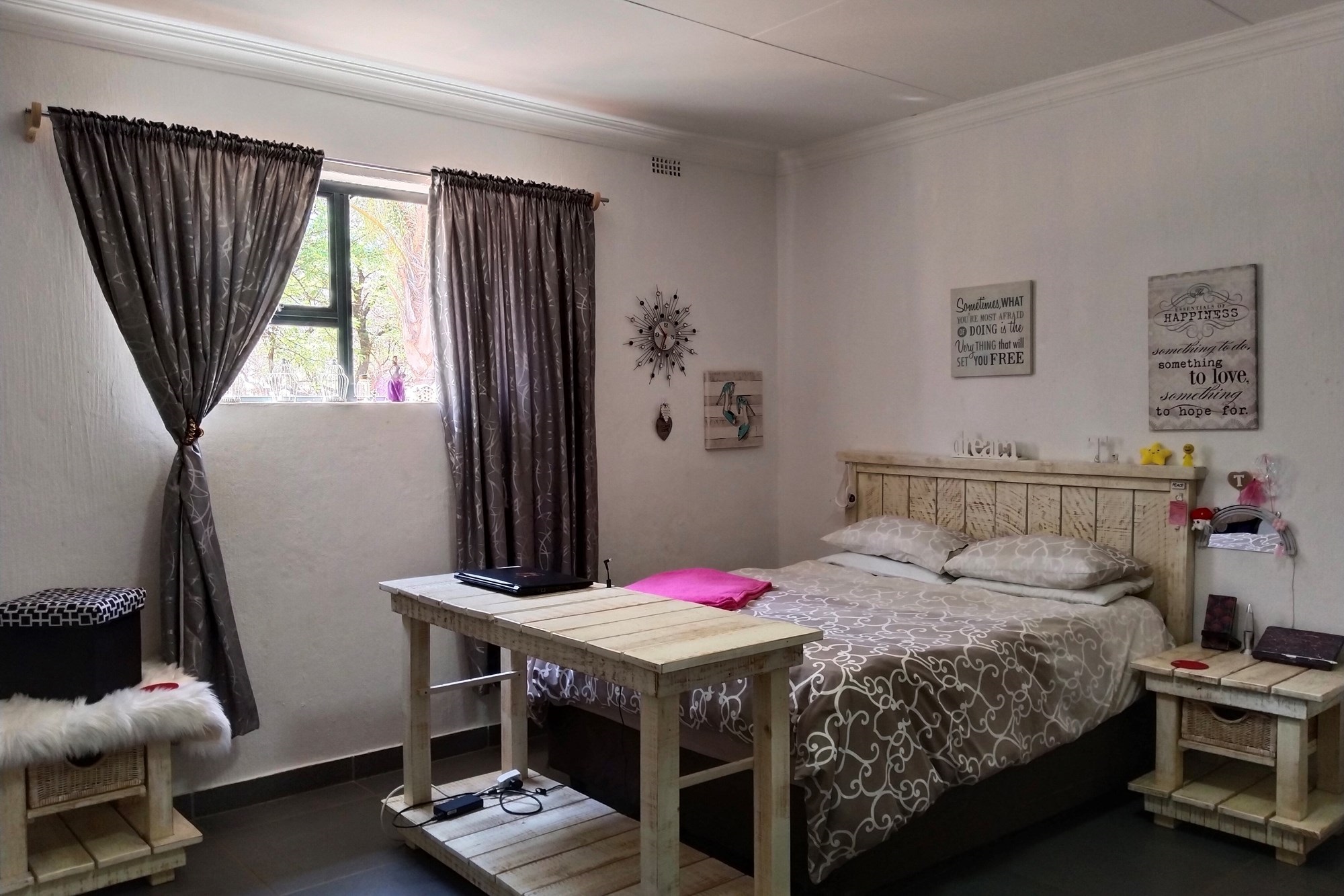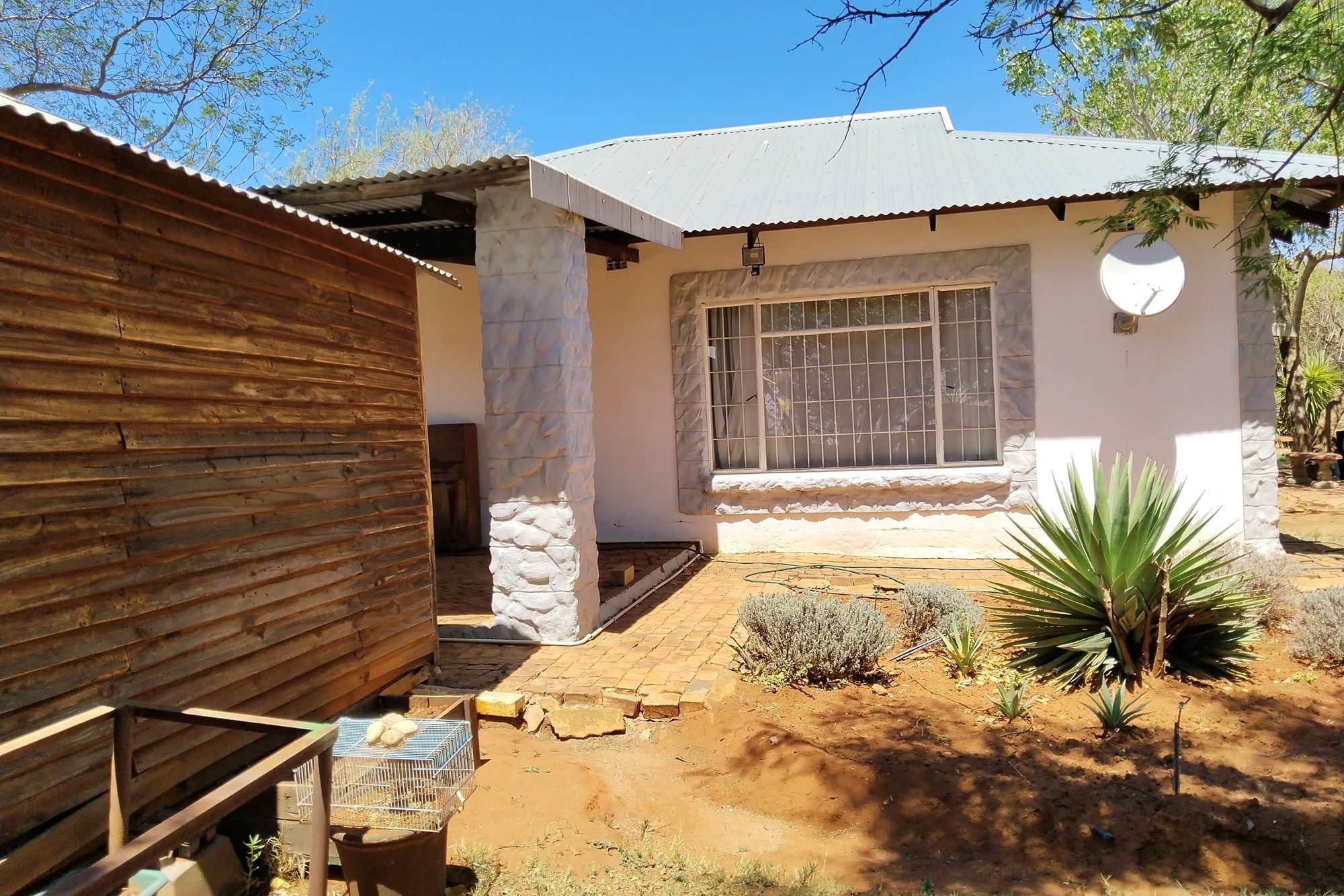 The estate features luxurious bathrooms with enclosed showers, en-suite designs, and built-in wardrobes, ensuring comfort and seclusion. The interior is elegantly decorated with a mix of brick, glass, and wood details, contributing to its rustic charm. Air conditioning throughout, partially furnished bedrooms, and staff accommodations enhance the inviting atmosphere.