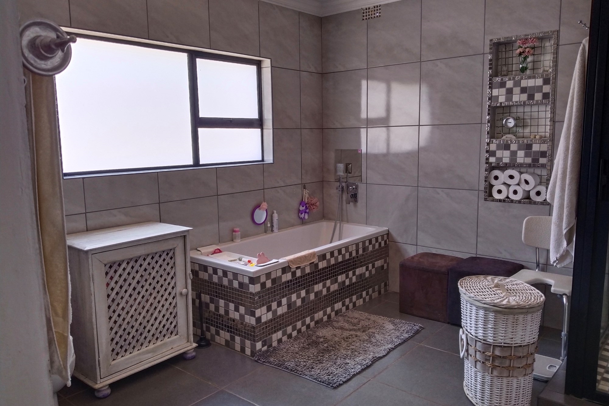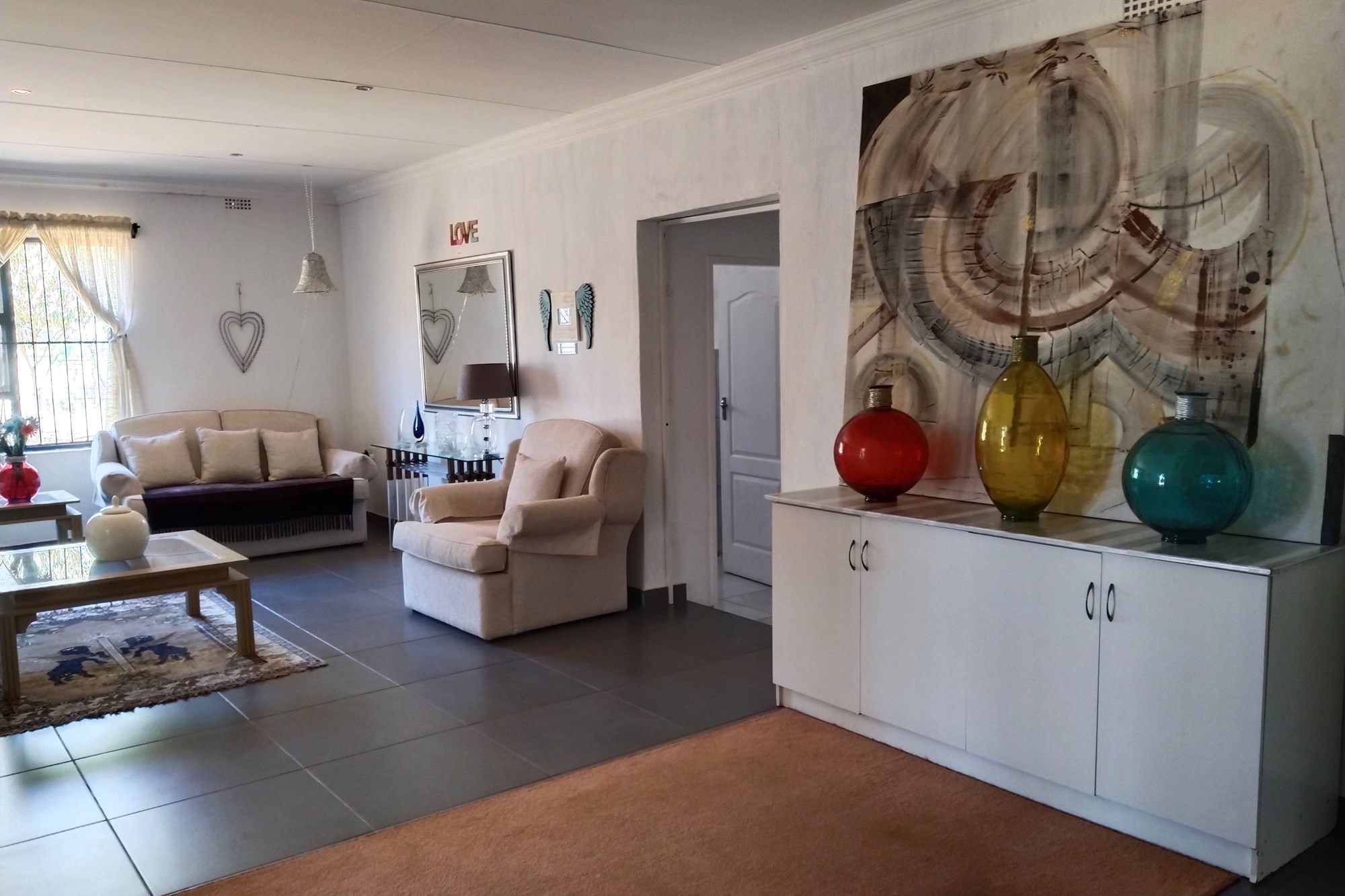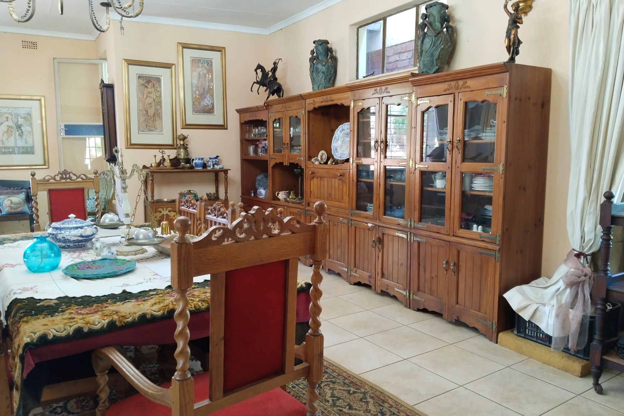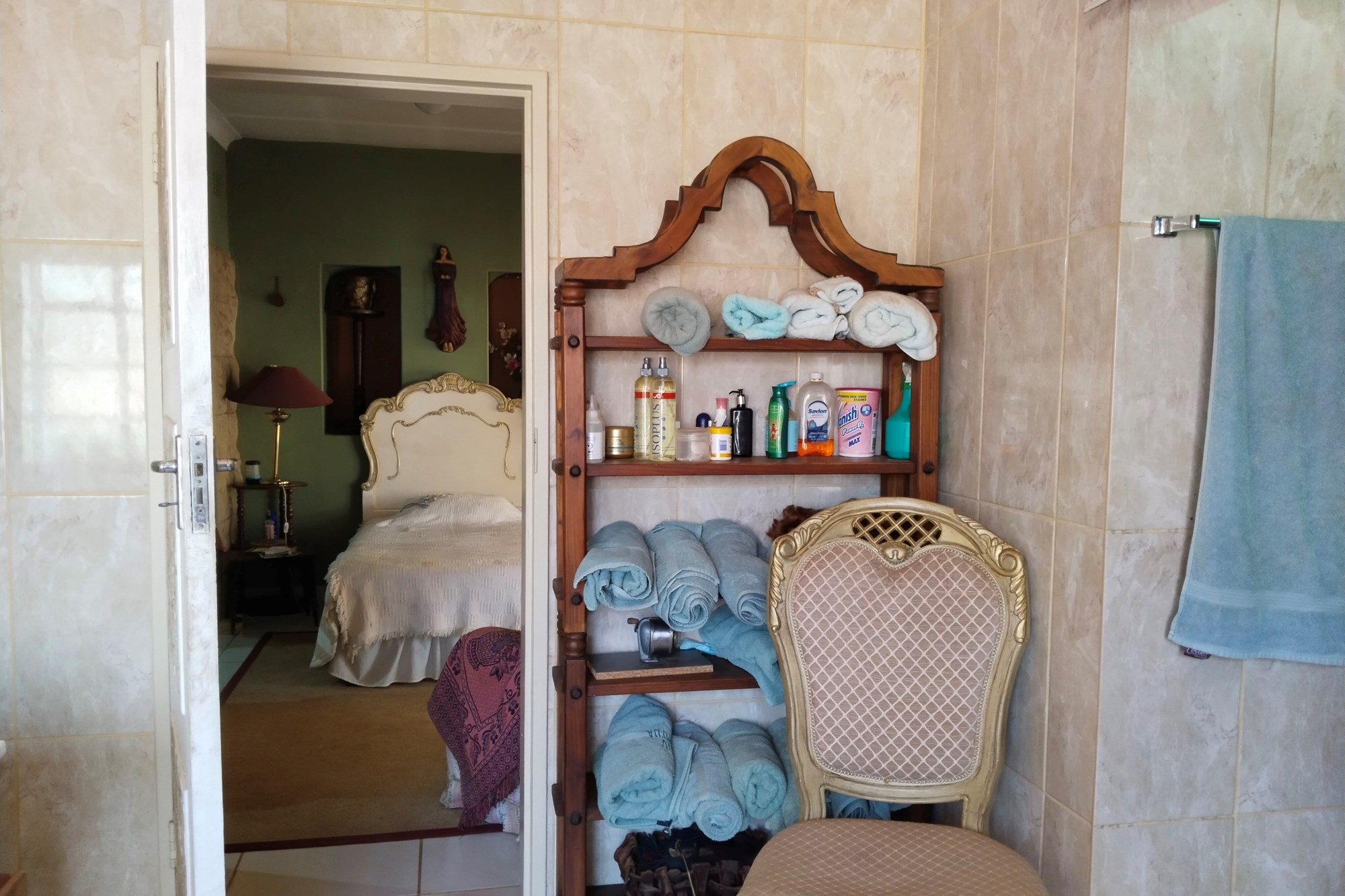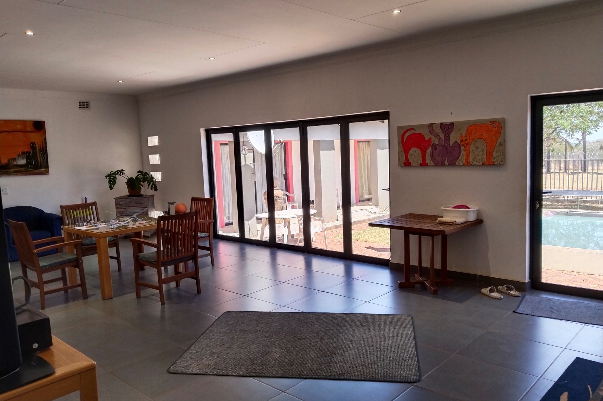 The estate features luxurious bathrooms with enclosed showers, en-suite designs, and built-in wardrobes, ensuring comfort and seclusion. The interior is elegantly decorated with a mix of brick, glass, and wood details, contributing to its rustic charm. Air conditioning throughout, partially furnished bedrooms, and staff accommodations enhance the inviting atmosphere.