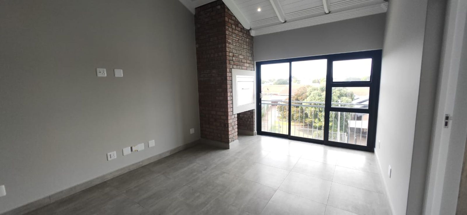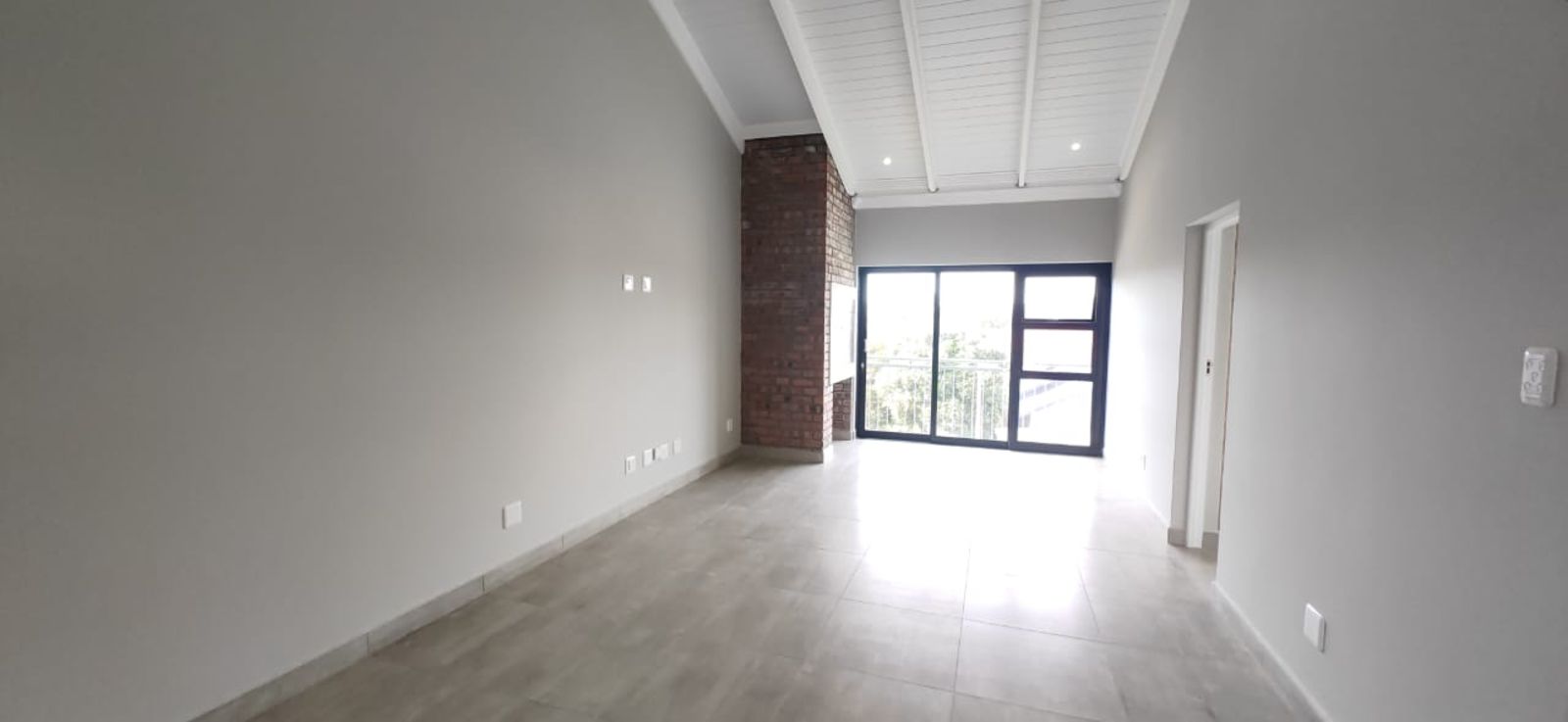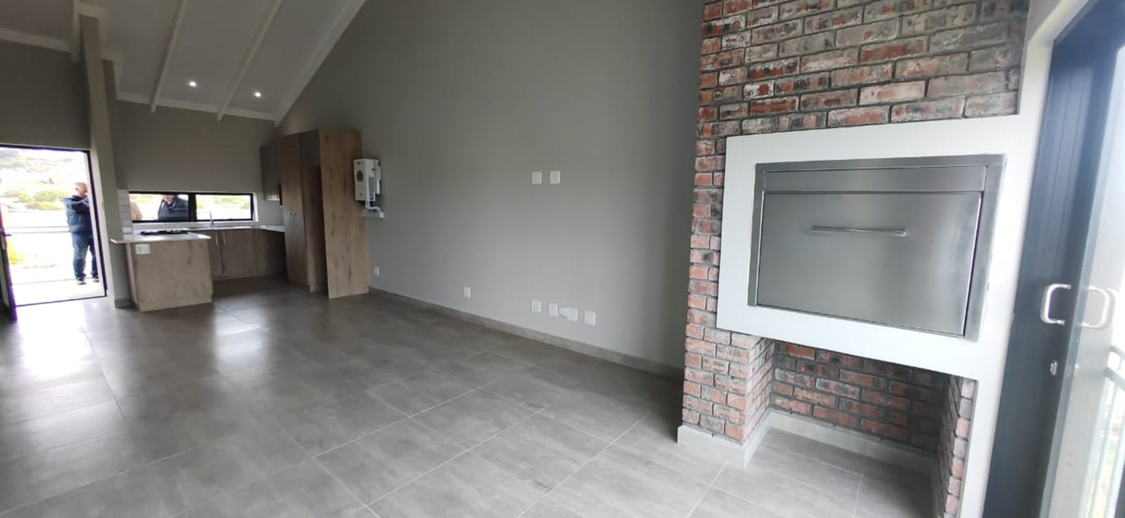 The open-plan living area flows effortlessly into a built-in stainless steel braai space, perfect for relaxed entertaining.