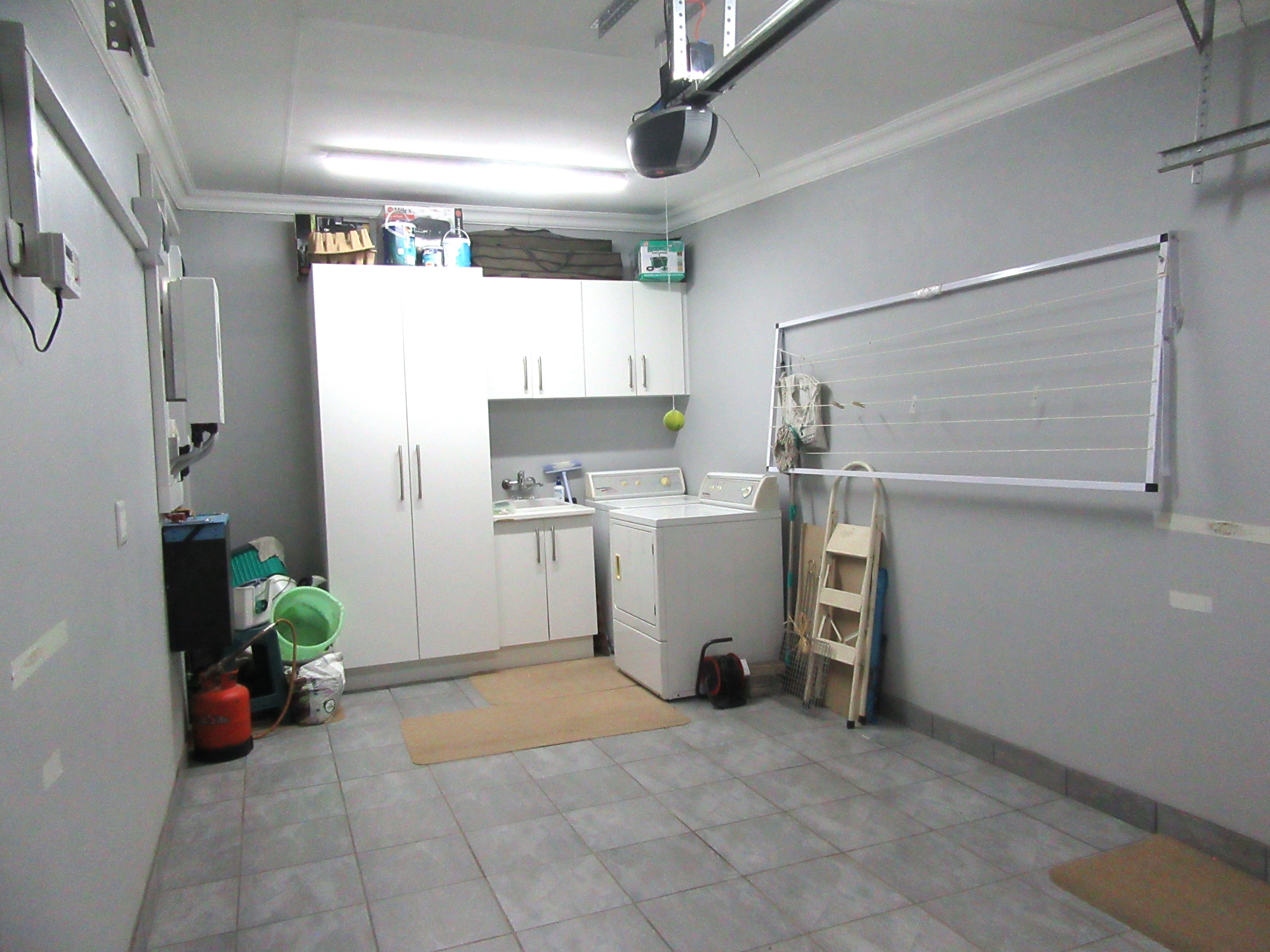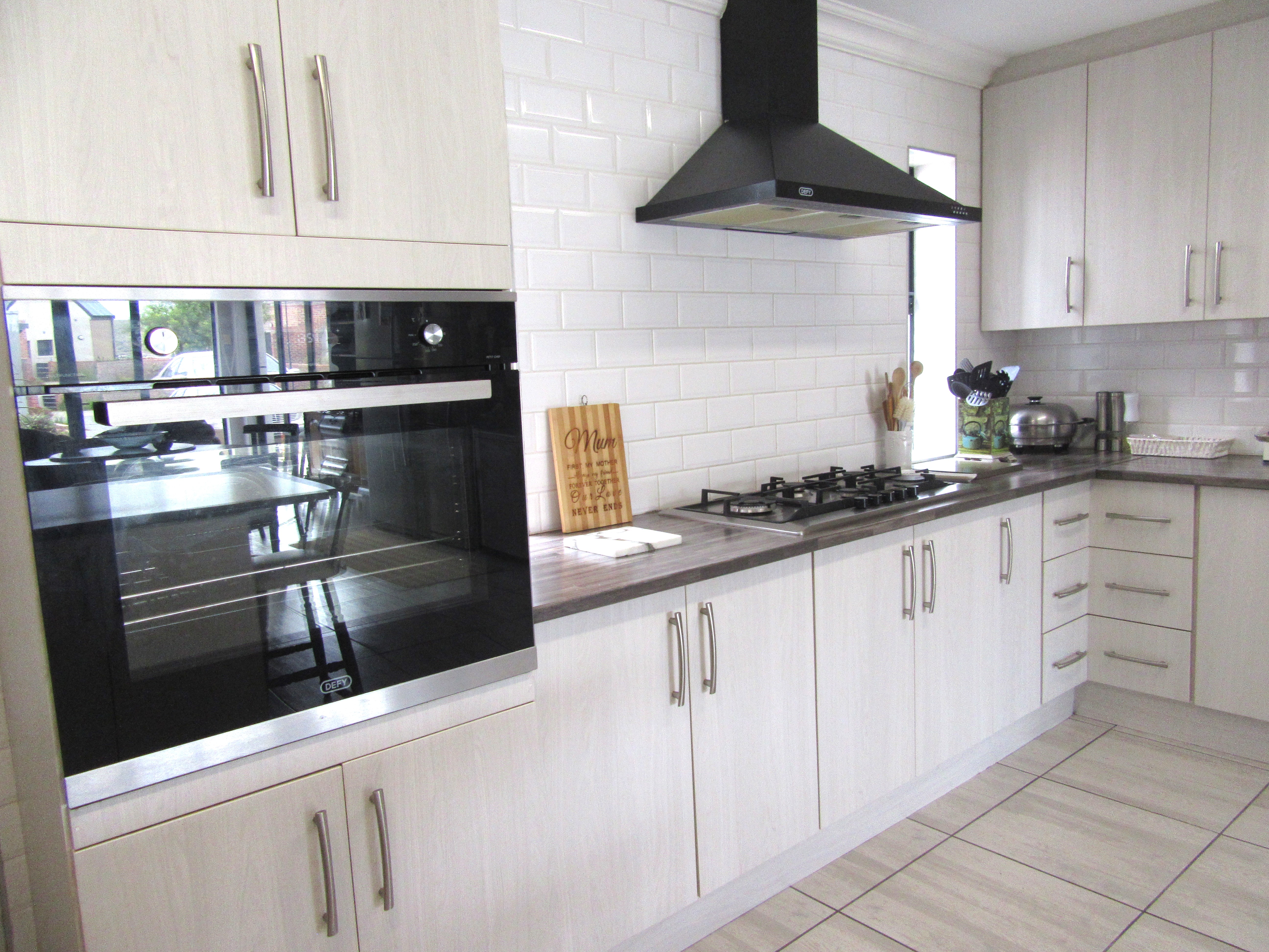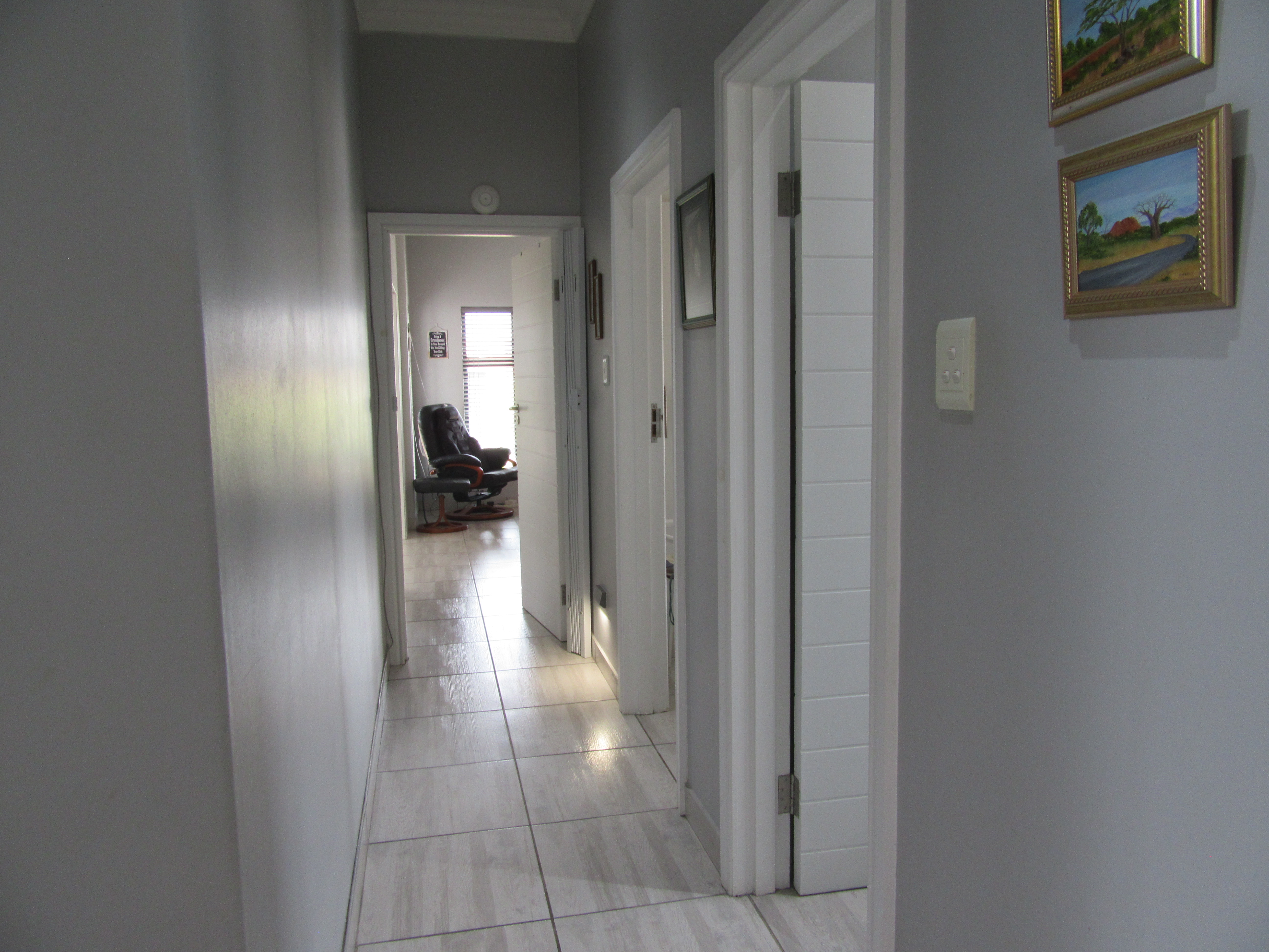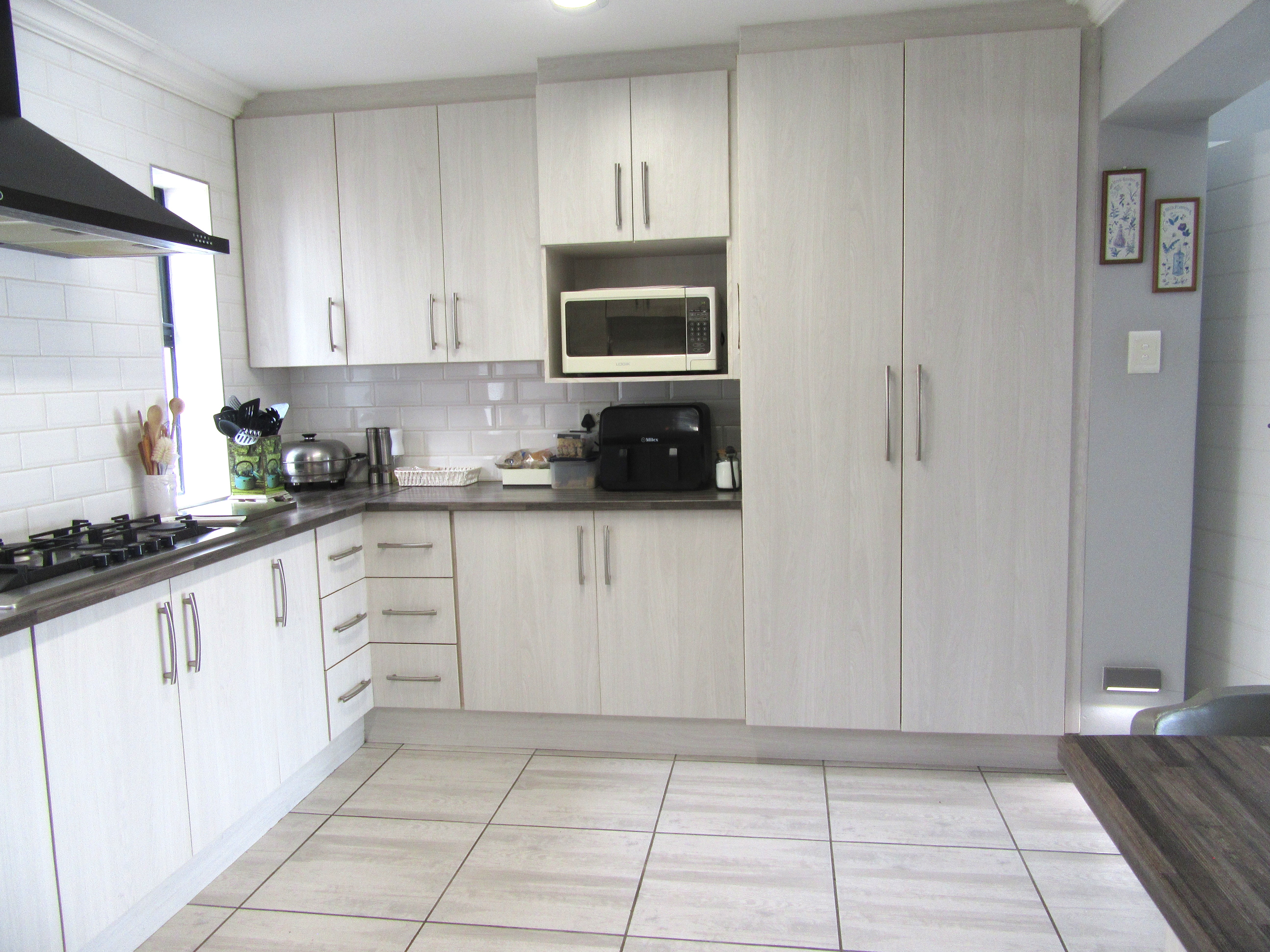 The home features high-volume ceilings and expansive sliding doors that flood the open-plan lounge and dining area with natural light, complemented by a gas fireplace for added warmth and ambience. The contemporary kitchen is well-appointed with a gas hob, eye-level oven, and a pantry, making it ideal for both everyday living and entertaining. Energy independence is assured with a 5 kW inverter and six solar panels, providing peace of mind during load shedding.