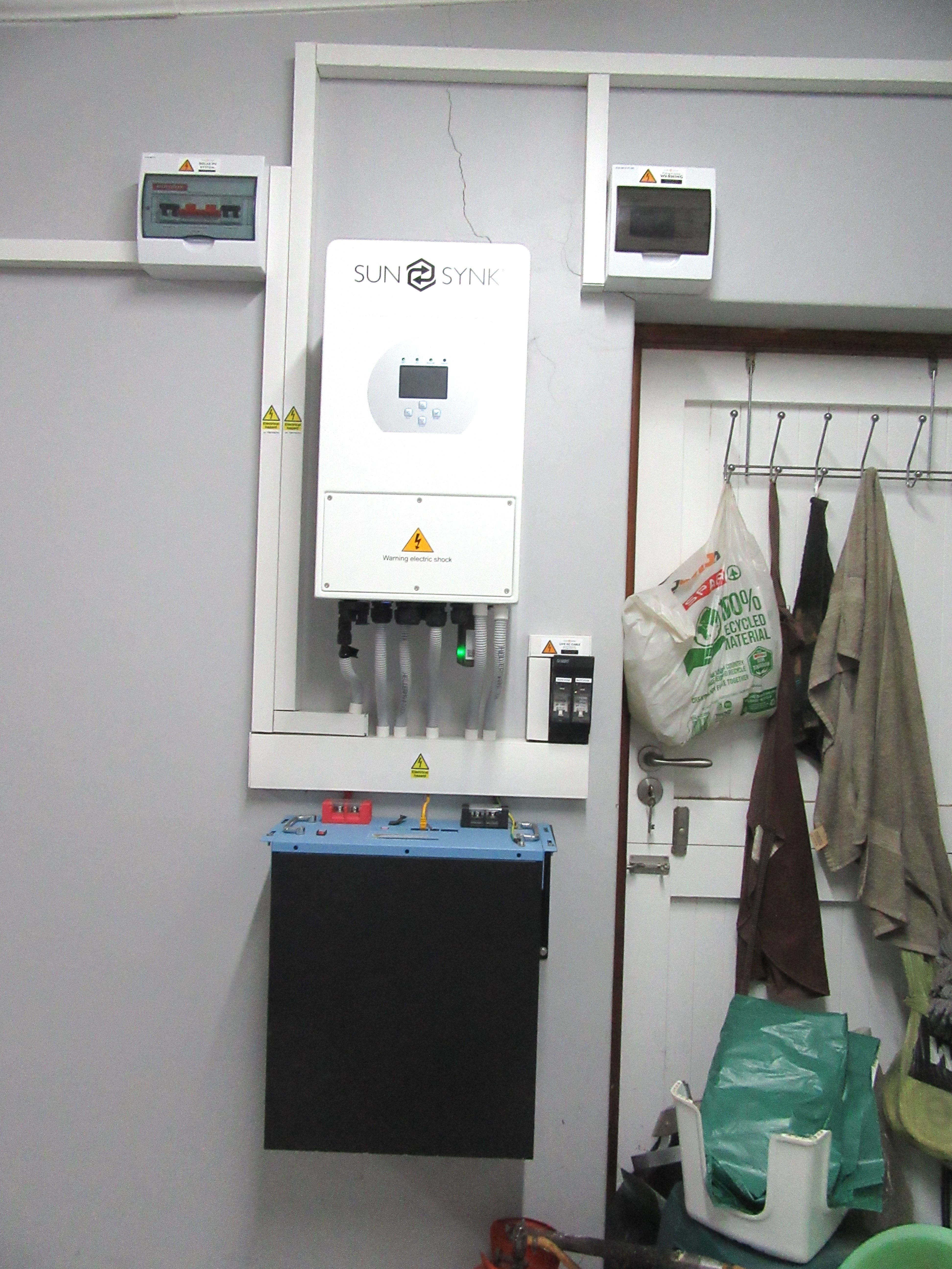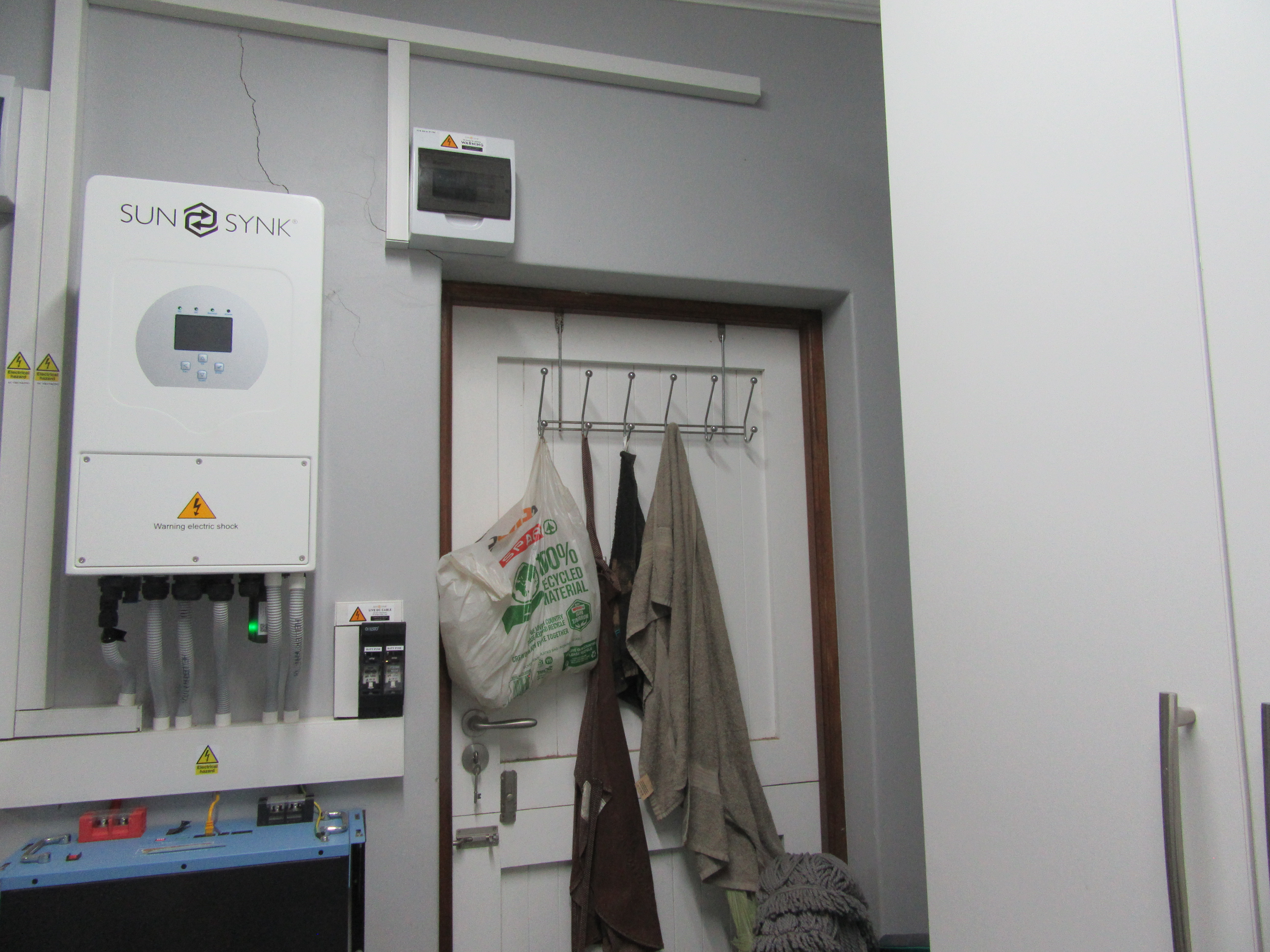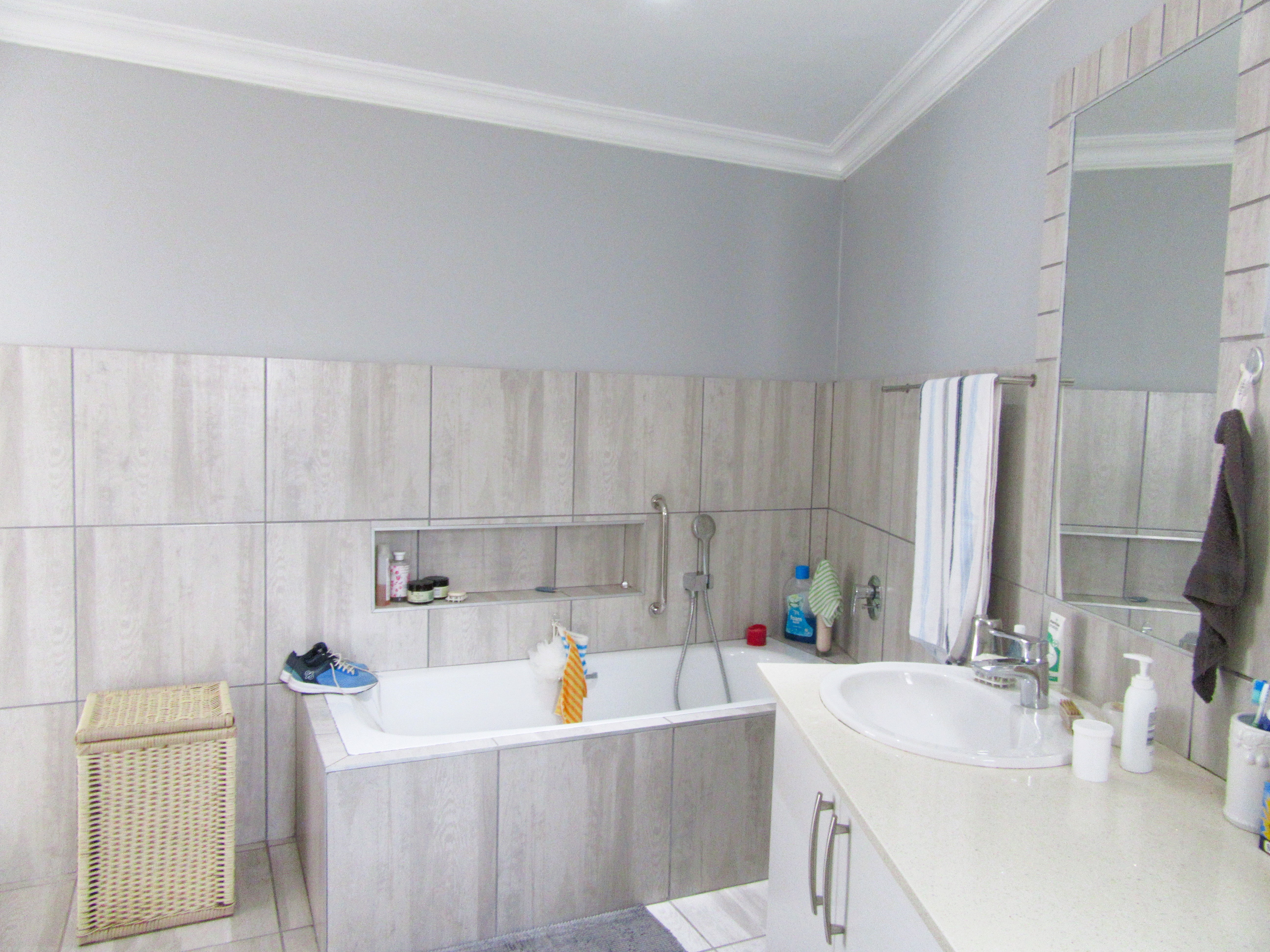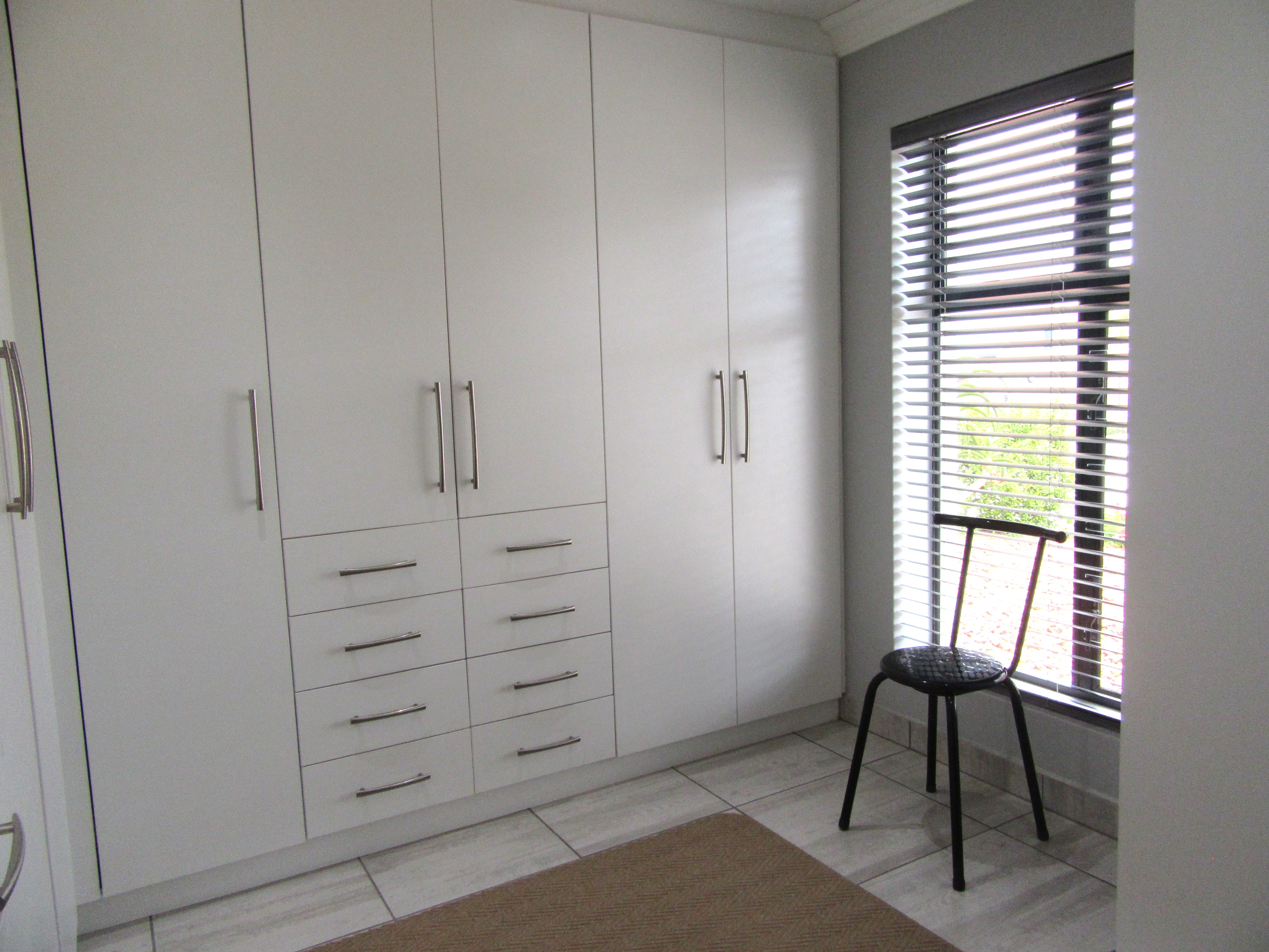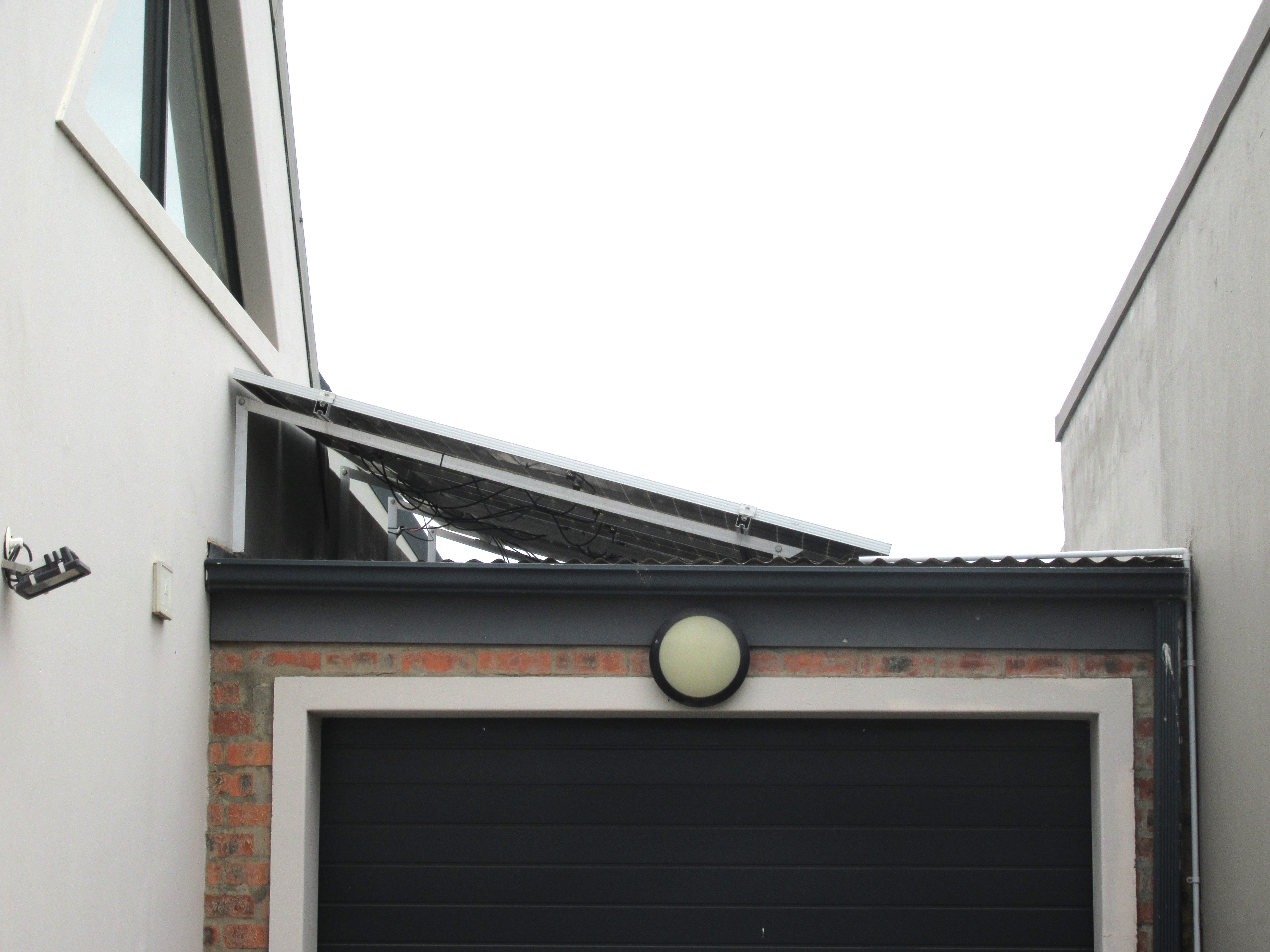 The home features high-volume ceilings and expansive sliding doors that flood the open-plan lounge and dining area with natural light, complemented by a gas fireplace for added warmth and ambience. The contemporary kitchen is well-appointed with a gas hob, eye-level oven, and a pantry, making it ideal for both everyday living and entertaining. Energy independence is assured with a 5 kW inverter and six solar panels, providing peace of mind during load shedding.