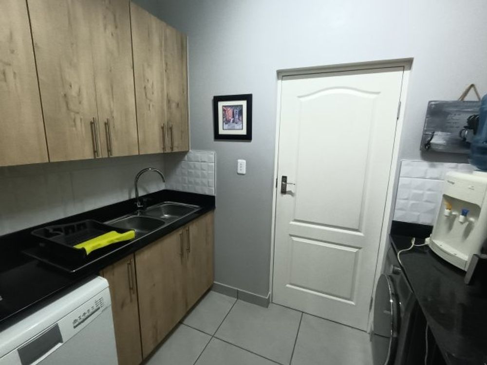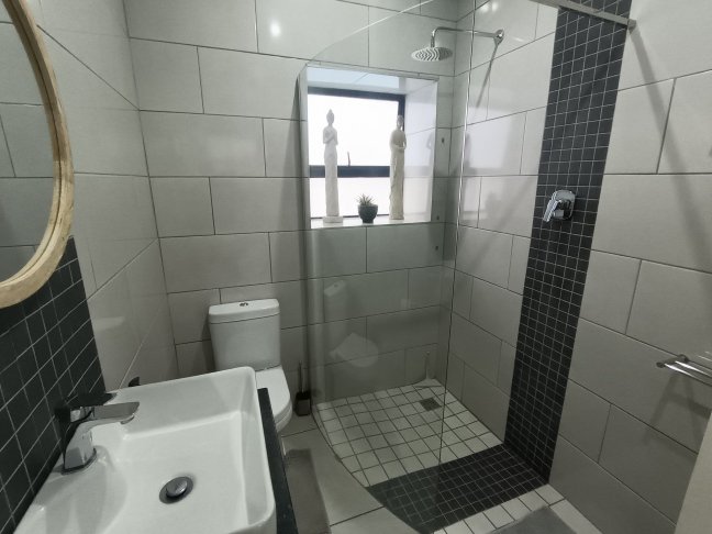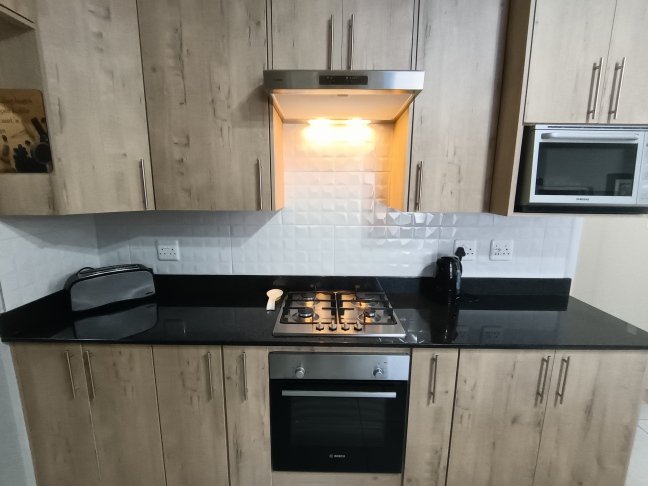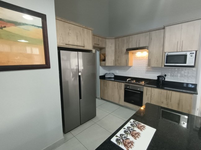 The kitchen is modern and fitted with a gas hob and electric under counter oven. Plenty of cupboards and working space. The separate scullery has space for 'n washing machine, tumble dryer and dishwasher. There is space for a double door fridge. Access to the garage is gain through the scullery. The Garage is a drive through single, automated one that can access a caravan. A chromo deck carport in front of the garage gives secure and covered parking for a 2nd vehicle. The garage door at the back of the garage gives access for a vehicle to the backyard. This area has been paved and one may build a carport at the back.