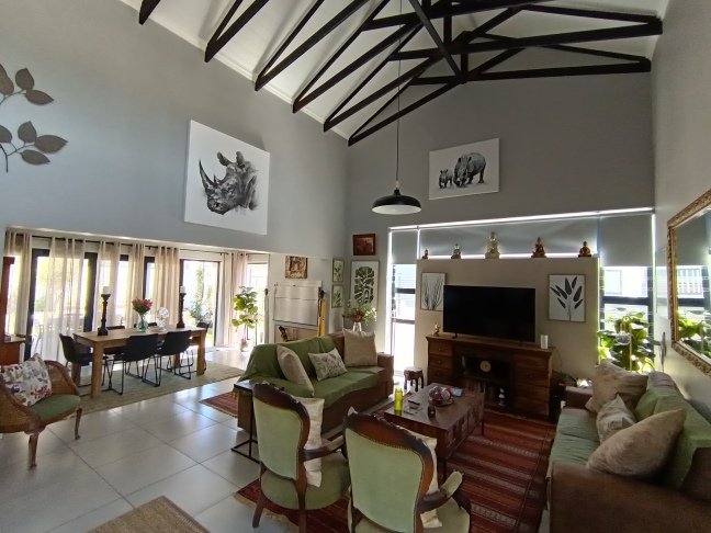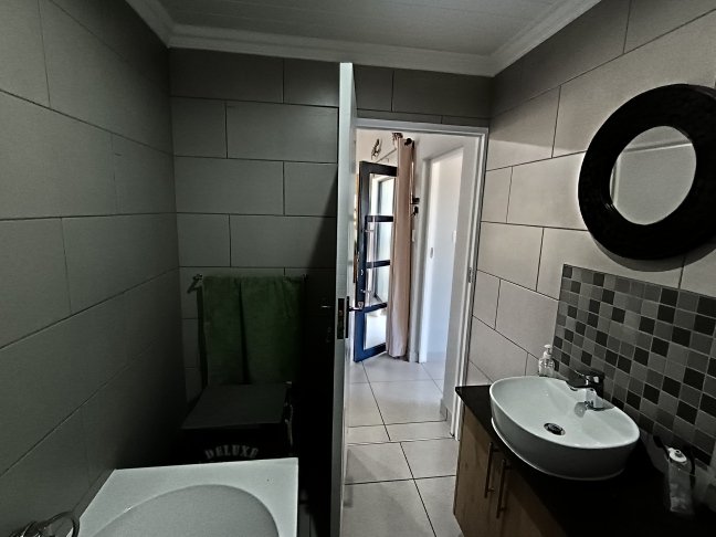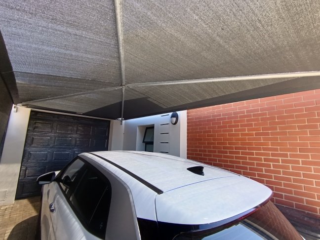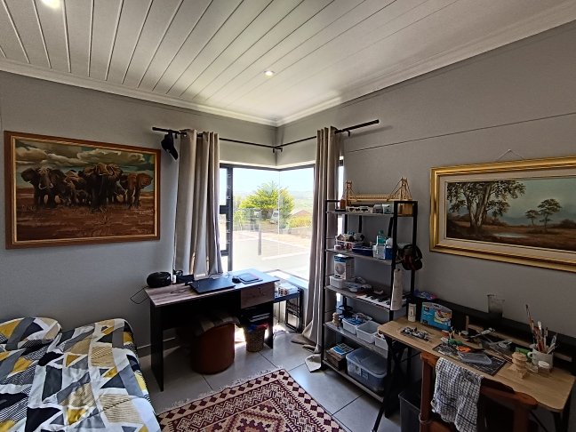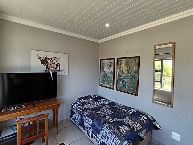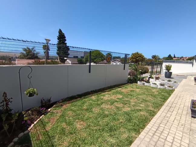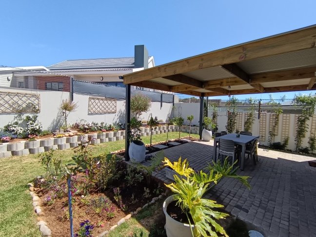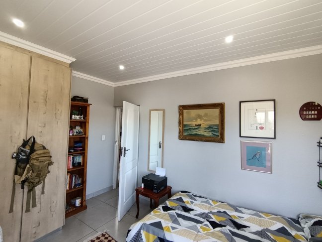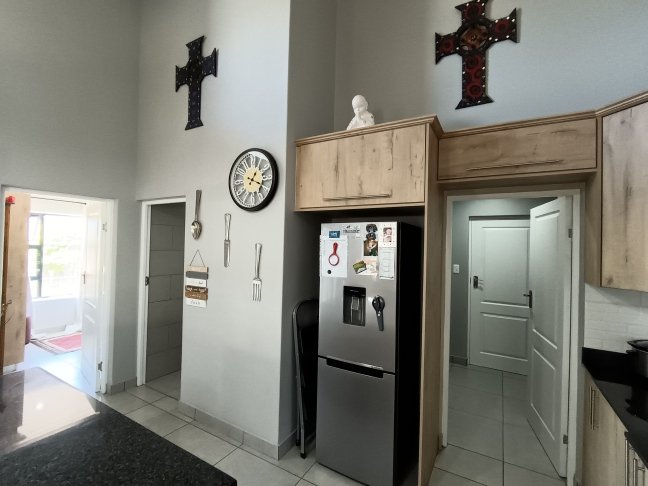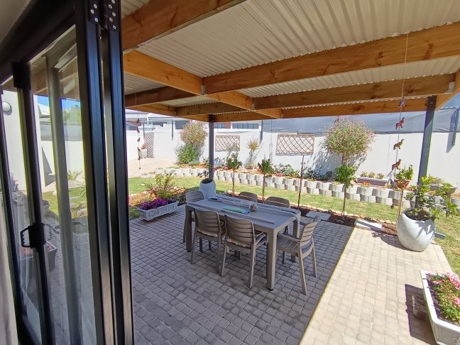 All the windows are fitted with blinds. From the braai room one exit the house into the backyard through big, staggered doors. One can enjoy this lovely garden from underneath the covered patio in the back yard. The garden is in a immaculate condition. The garage is a single drive through one that has extra high doors to accompany a caravan. It is a very big single garage. There is ample space behind the garage to store a 3rd vehicle or caravan. There is also a single shade port in front of the garage.