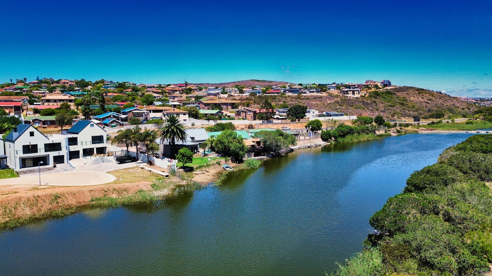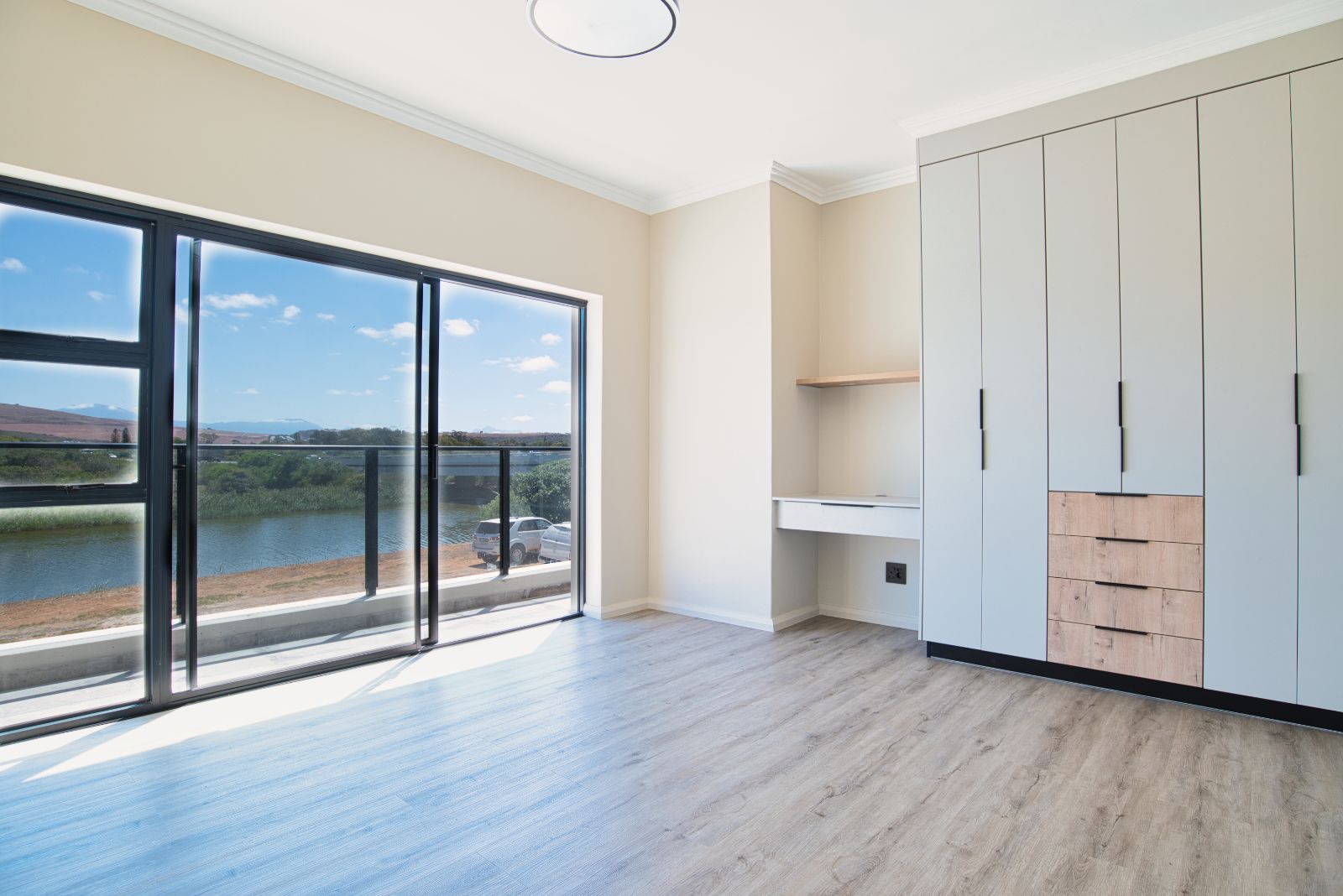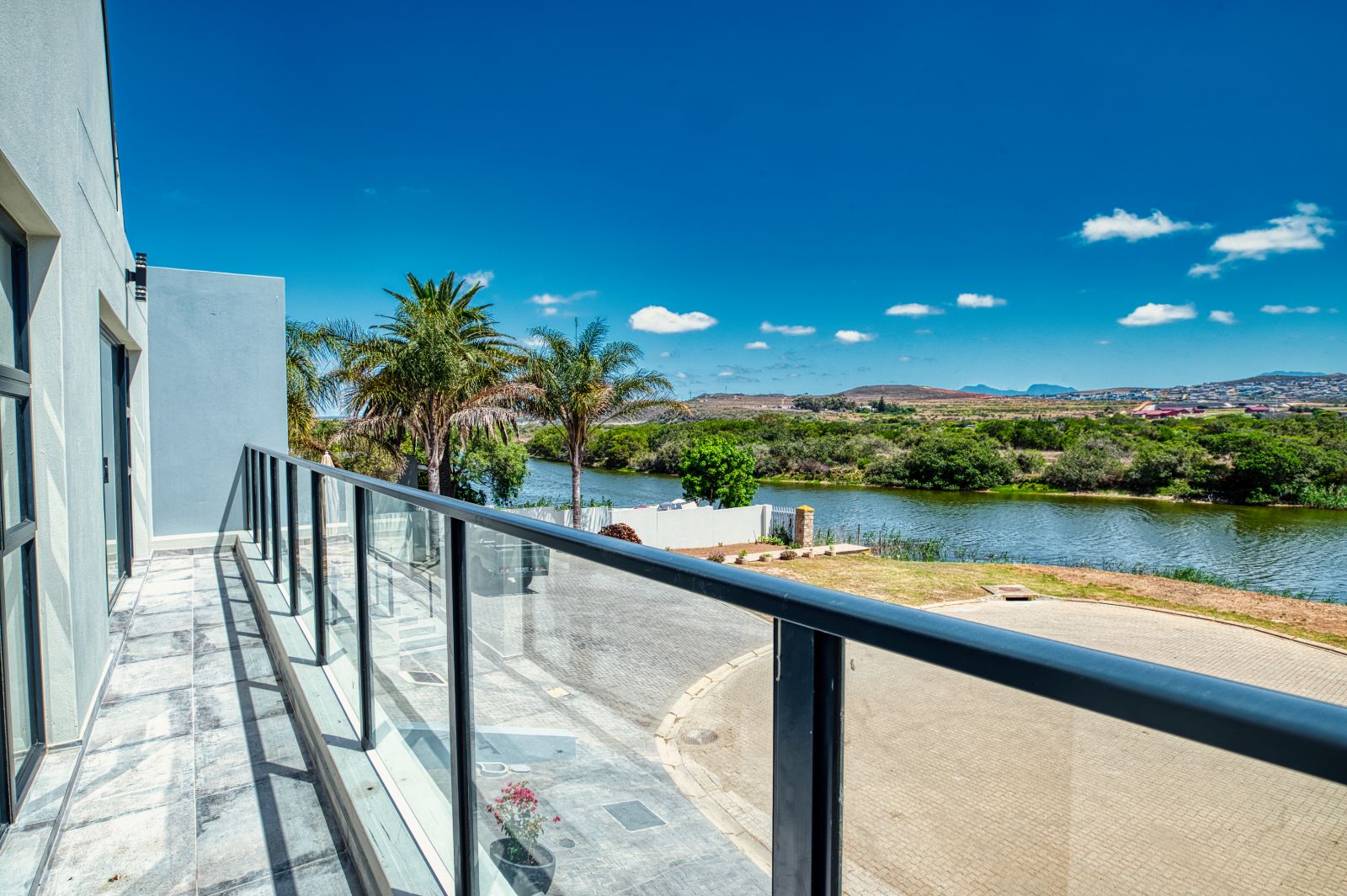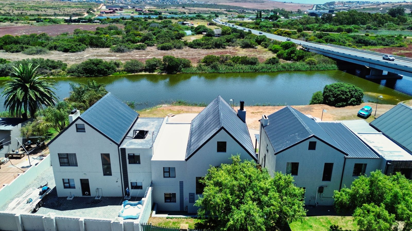 Upstairs, the home features three well-sized bedrooms. The main bedroom includes an en-suite bathroom, while the two additional bedrooms share a full bathroom. Both the main bedroom and the second bedroom open onto balconies, offering tranquil views of the Hartenbos Lagoon and surrounding greenery.