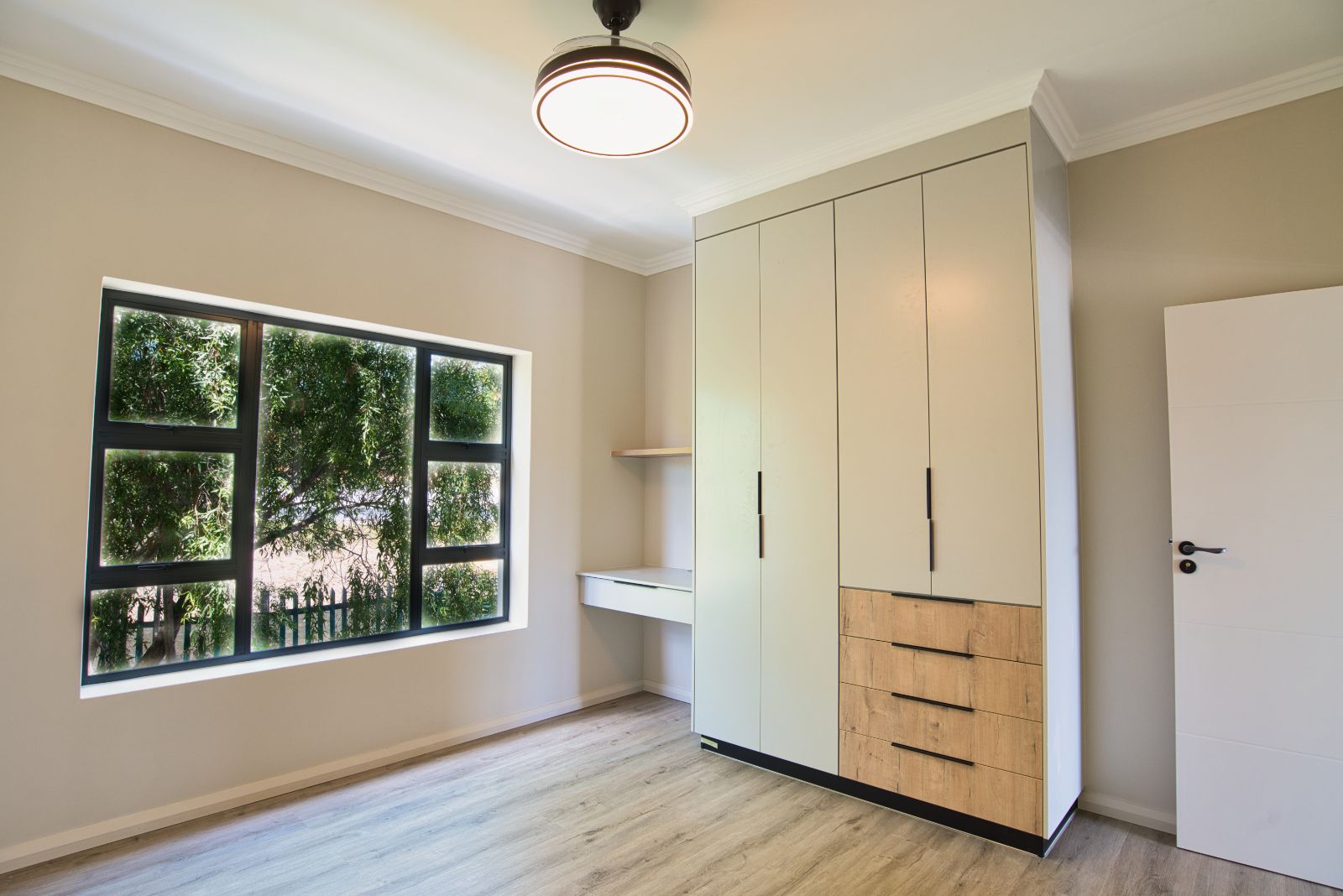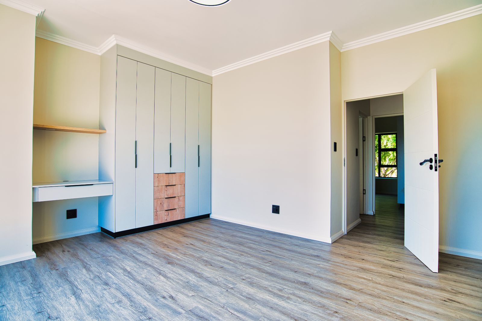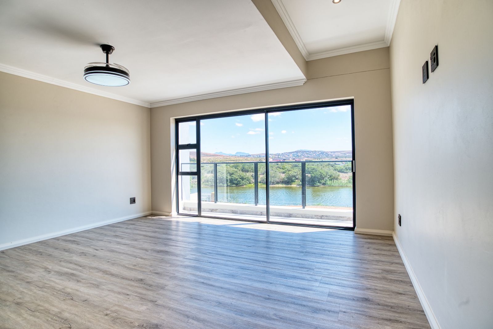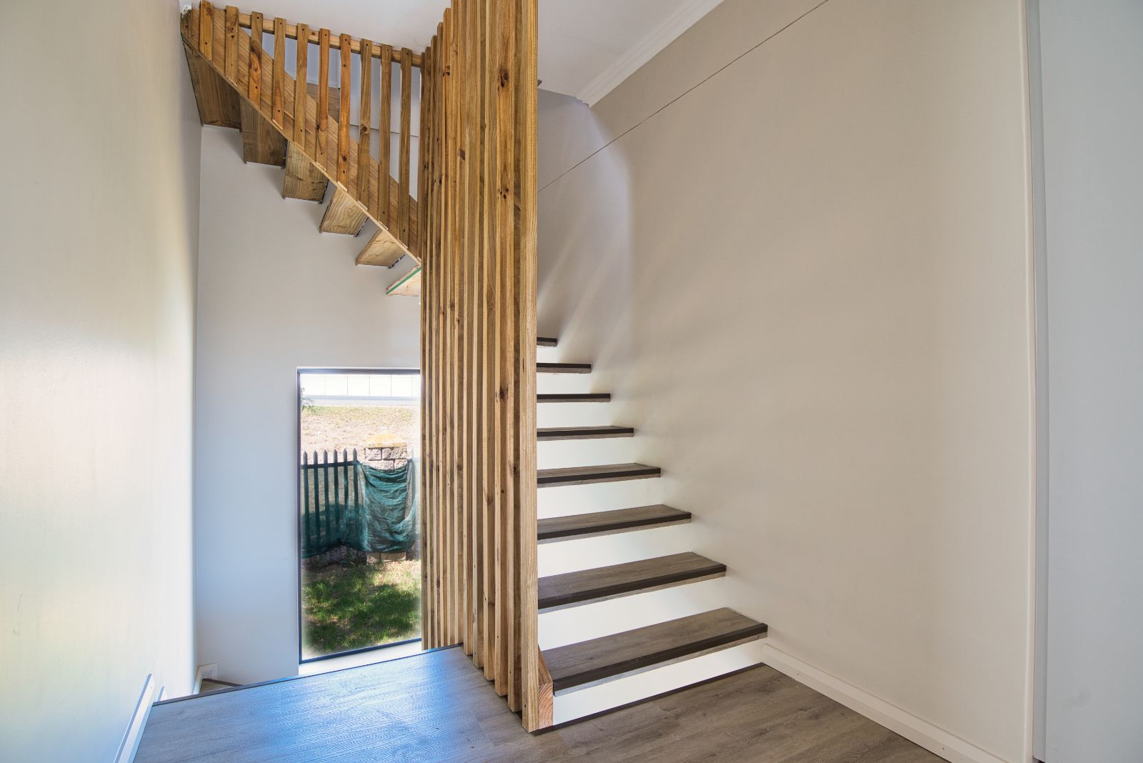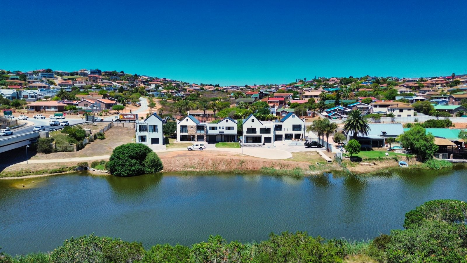 Upstairs, the home features three well-sized bedrooms. The main bedroom includes an en-suite bathroom, while the two additional bedrooms share a full bathroom. Both the main bedroom and the second bedroom open onto balconies, offering tranquil views of the Hartenbos Lagoon and surrounding greenery.