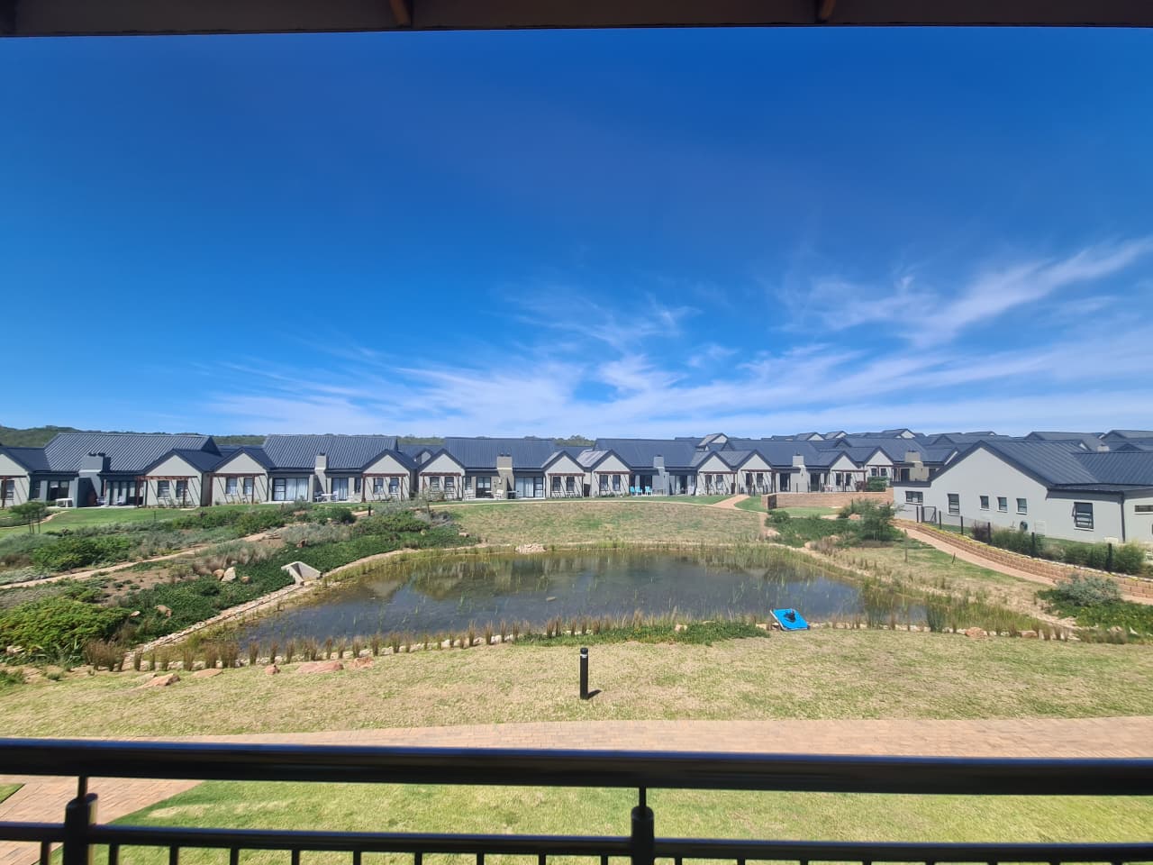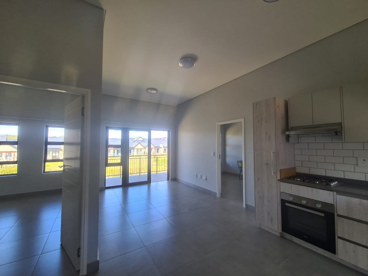 The apartment features a spacious open-plan lounge and kitchenette with modern finishes, built-in cupboards, a stove, and practical counter space for everyday convenience. Large glass doors lead from the living area onto a balcony, where residents can enjoy lovely views of the dam and surrounding green areas, creating a calm and relaxing atmosphere.
