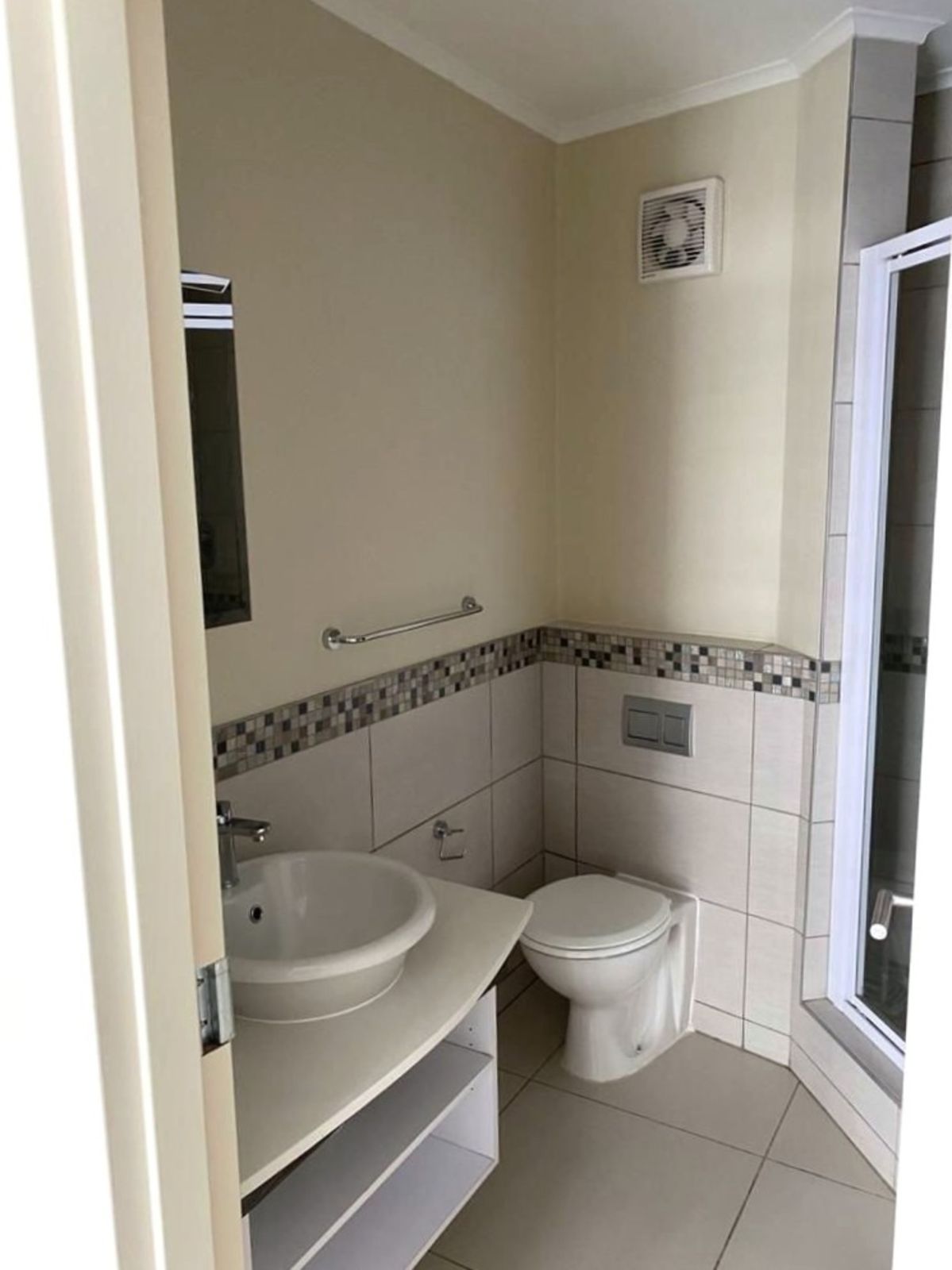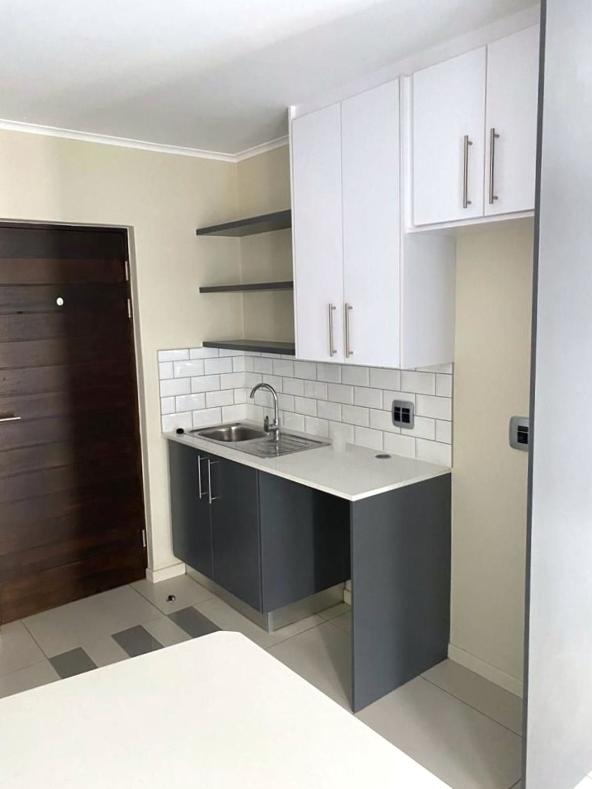 Inside, the studio is fitted with elegant porcelain tile flooring and energy-efficient LED lighting throughout. The full kitchen features quality appliances, space for a single fridge, and a connection point for an additional appliance. A sleek separate bathroom includes a shower, basin, and toilet. Built-in cupboards and clever storage solutions make the most of the space.