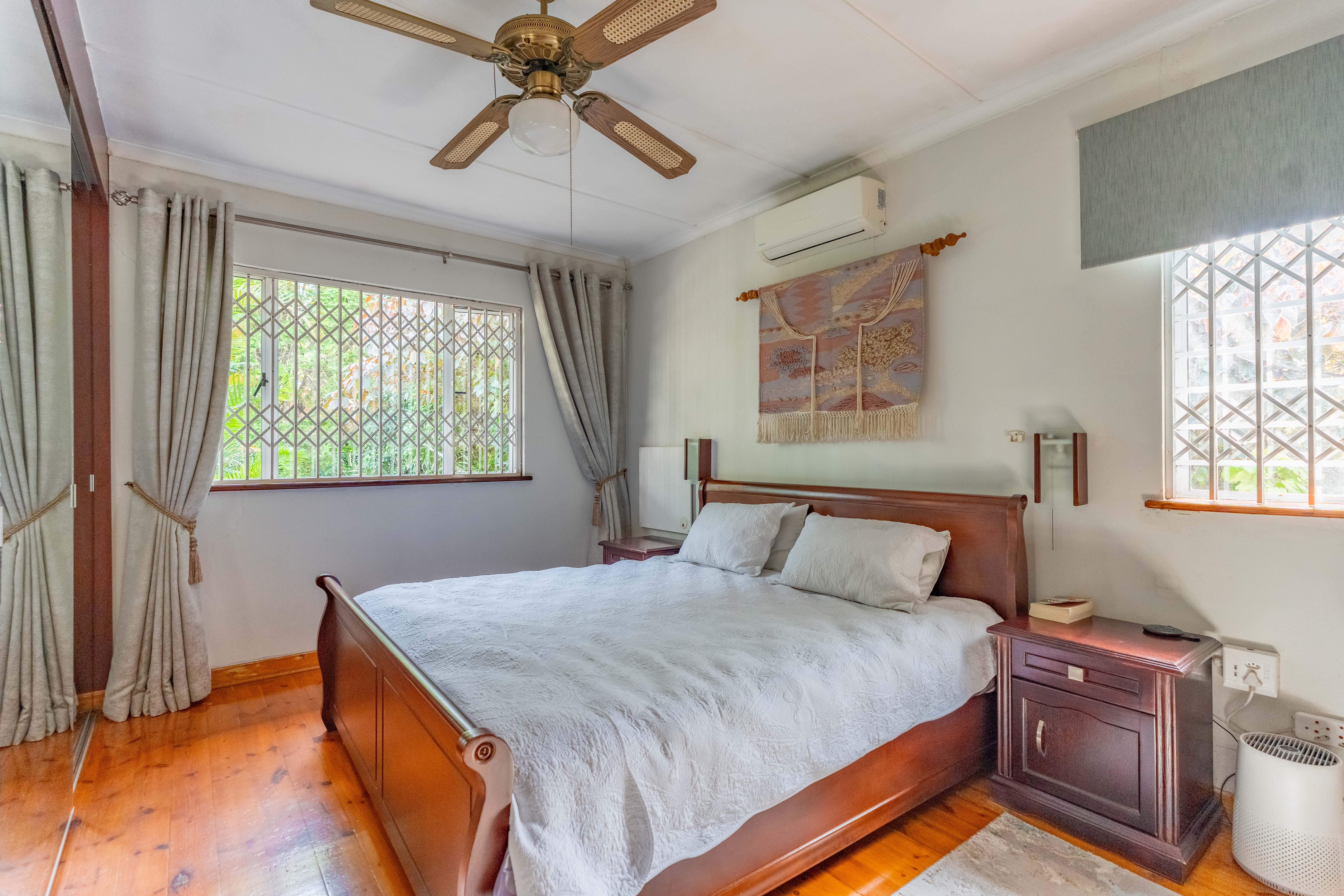 3 Spacious bedrooms, all with BIC's and aircons overlook the garden. The Bathroom is modern, tiled throughout and boast a shower, bathtub, basin, vanity cupboard and toilet. For guests there is a separate toilet also tiled. To add to the character and charm is the gleaming wooden flooring which just adds to the ambiance and luxury.