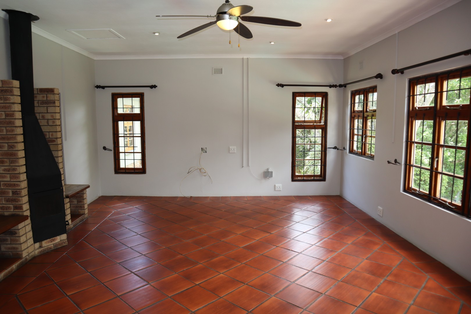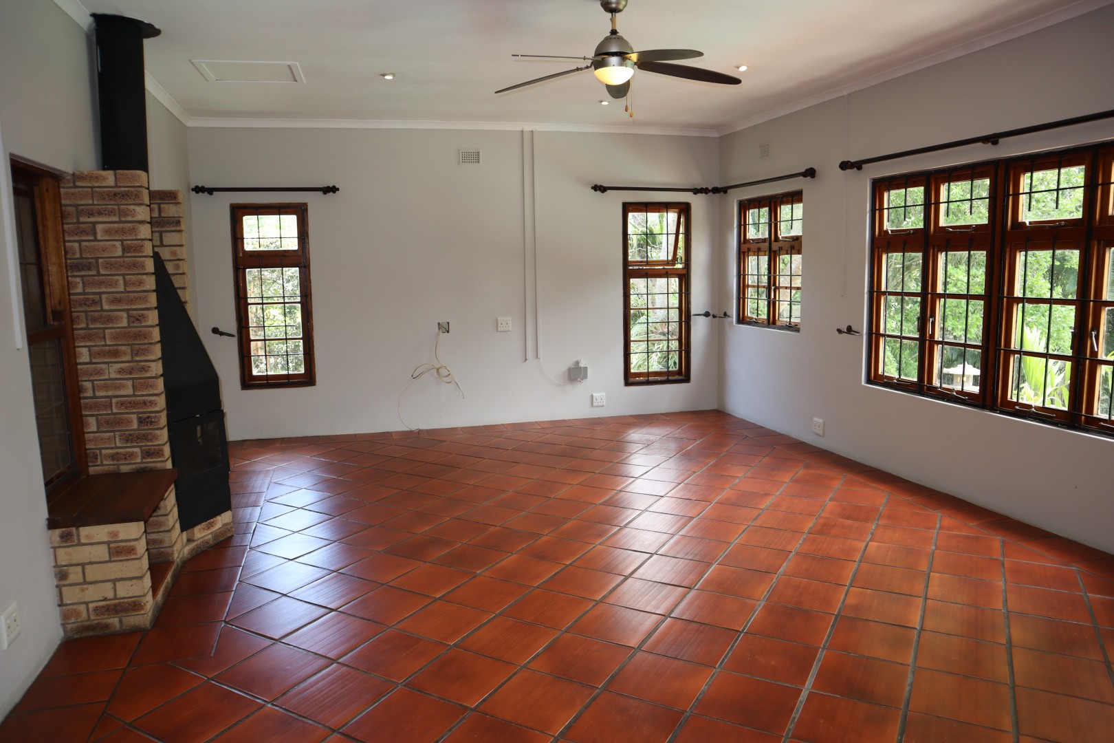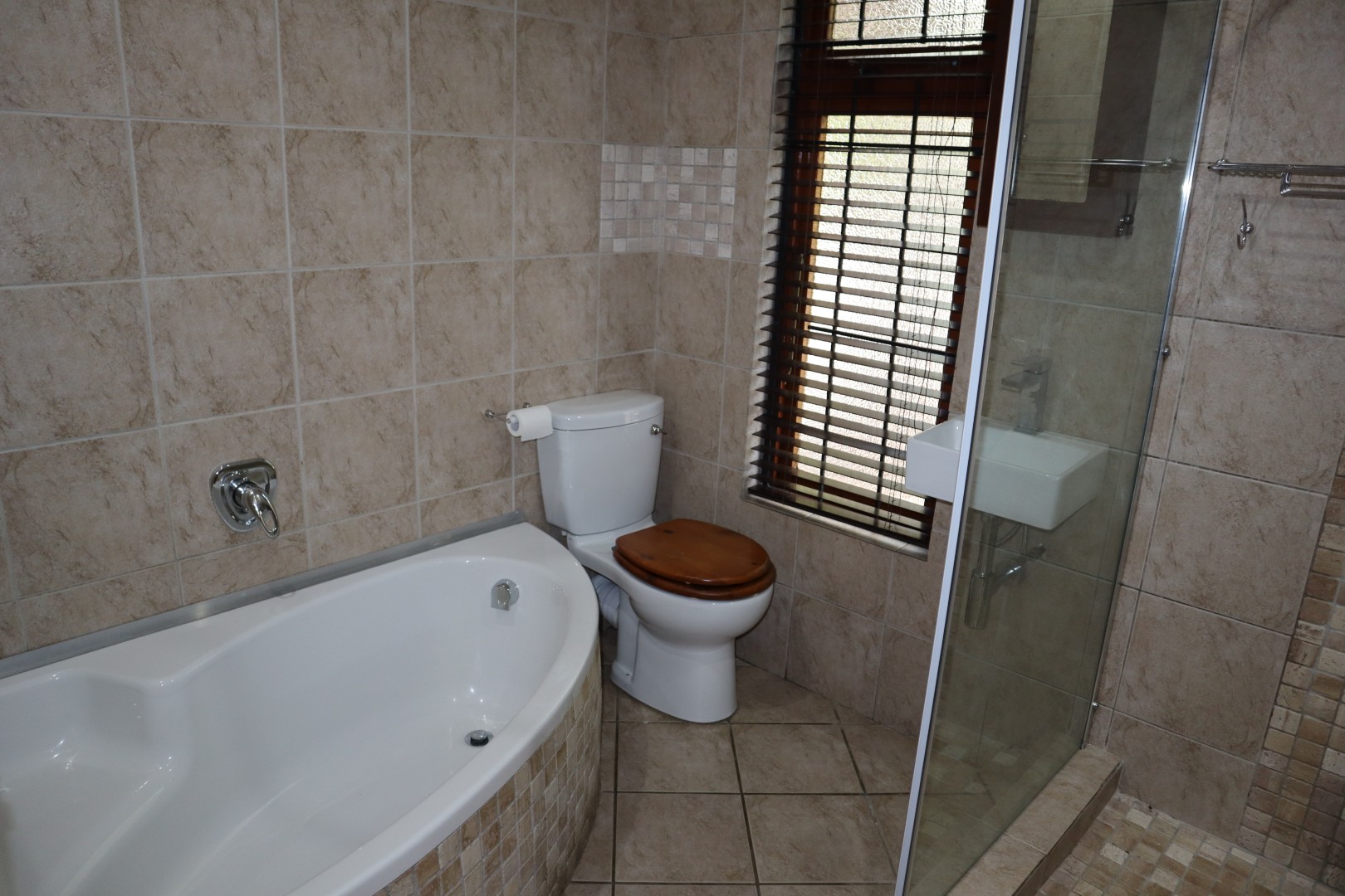 4 Bedrooms with built in cupboards and ceiling fans, the family bathroom has a corner bath, toilet basin, and shower plus a separate guest toilet. The en-suite bathroom has a bath, toilet basin, and double showers.