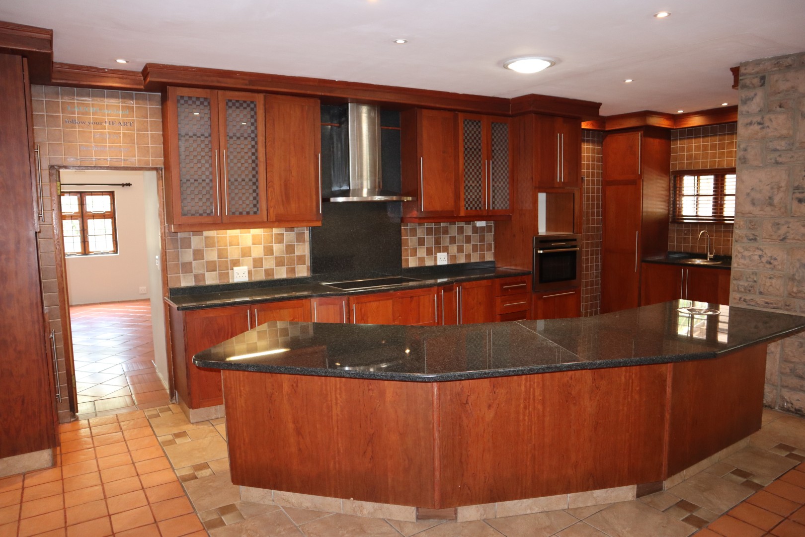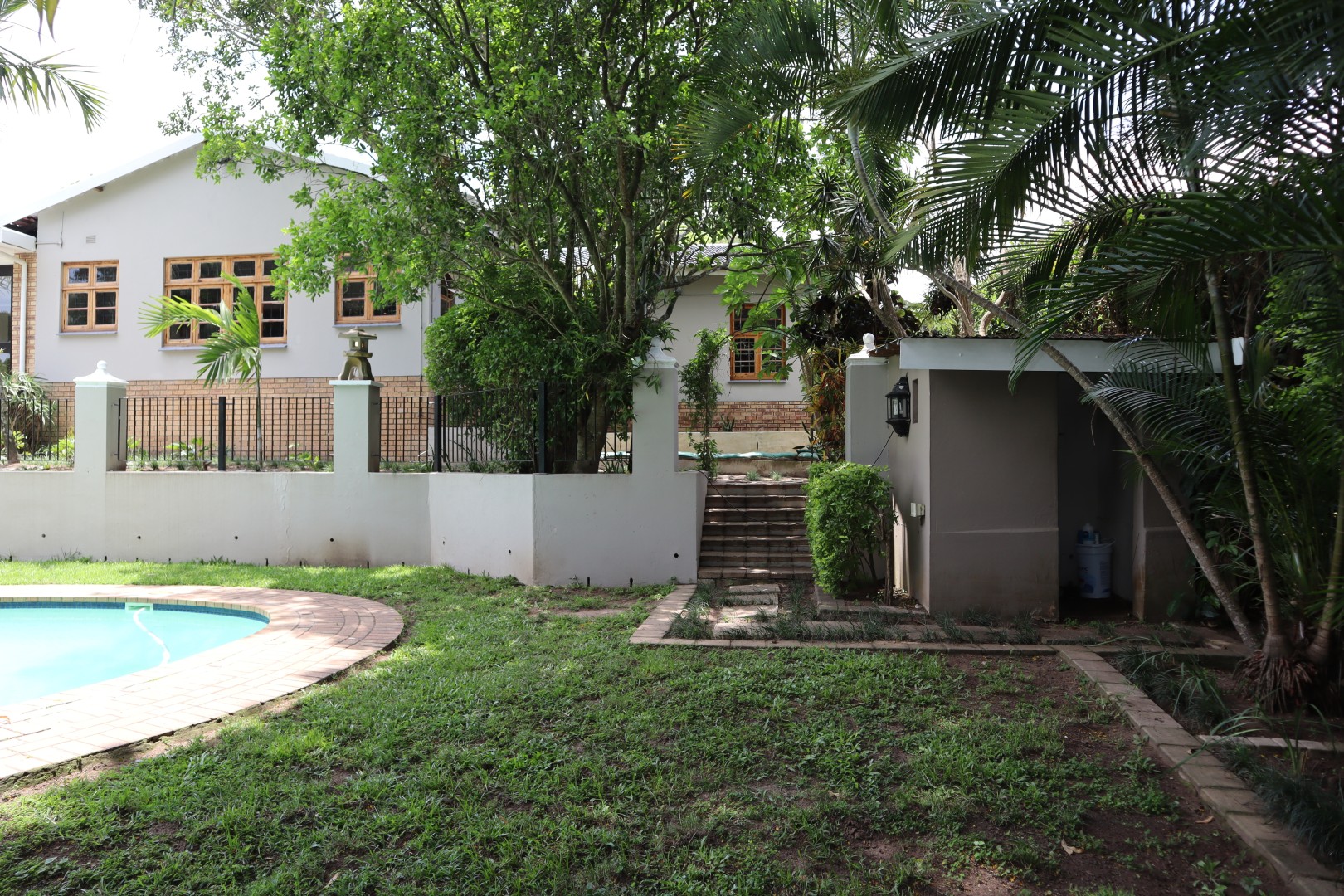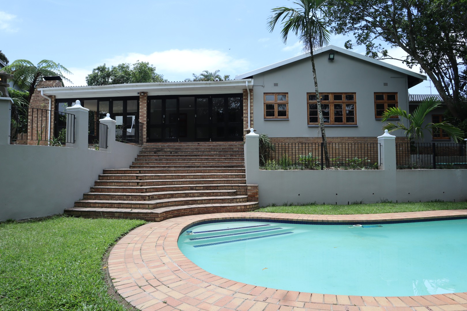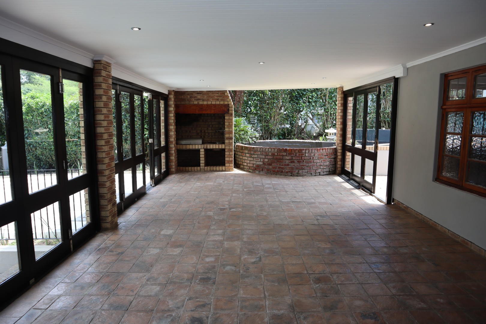 Perfect for entertaining, the lounge opens onto a delightful, large, enclosed patio featuring a built-in braai and folding doors for year-round enjoyment, another open side patio plus a Koi pond.