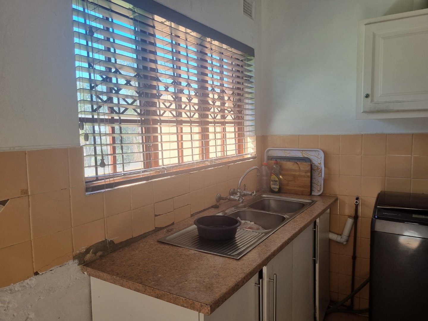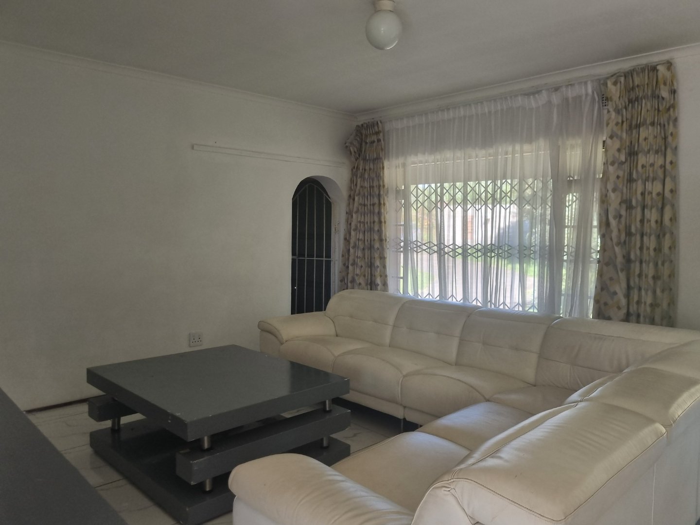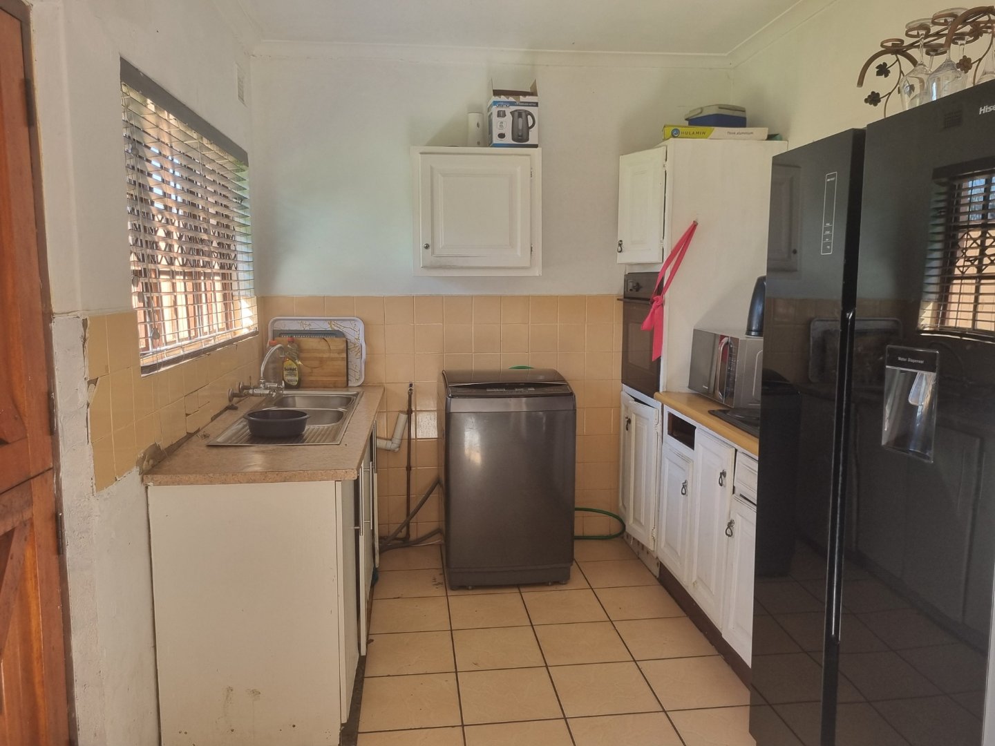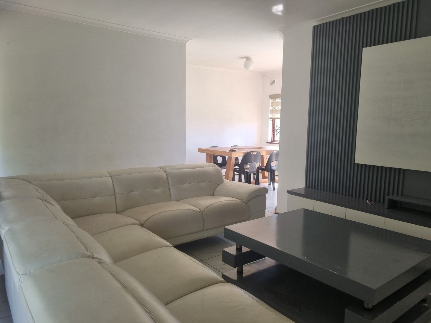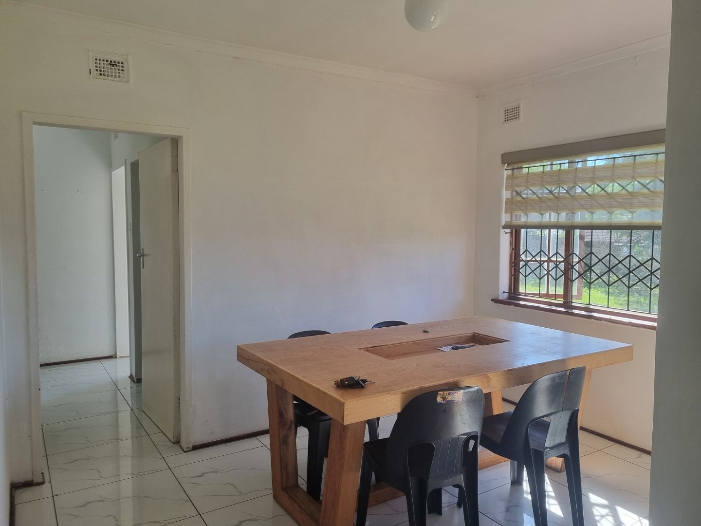 The functional kitchen flows seamlessly into the open-plan lounge and dining area, making it ideal for family living and entertaining. Wooden-framed windows with burglar bars add character and peace of mind.