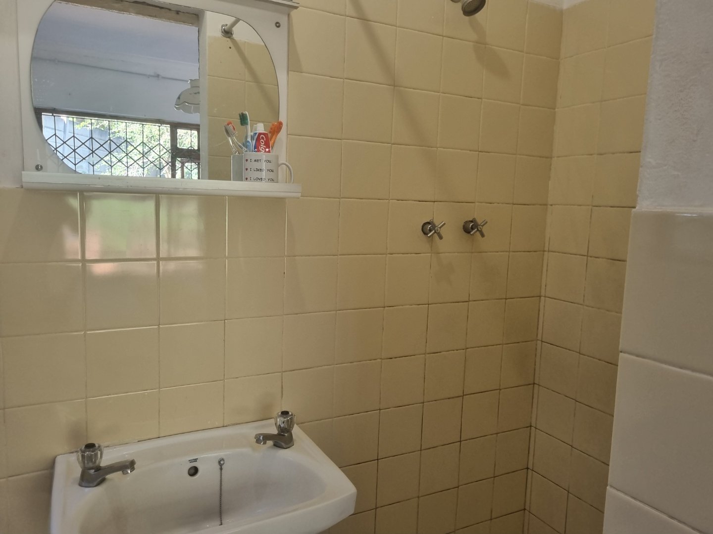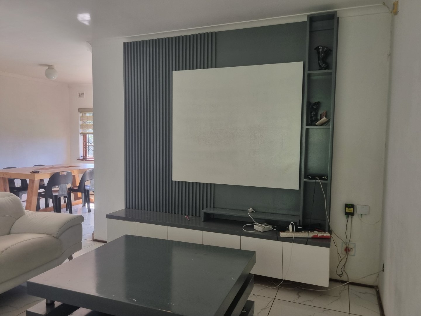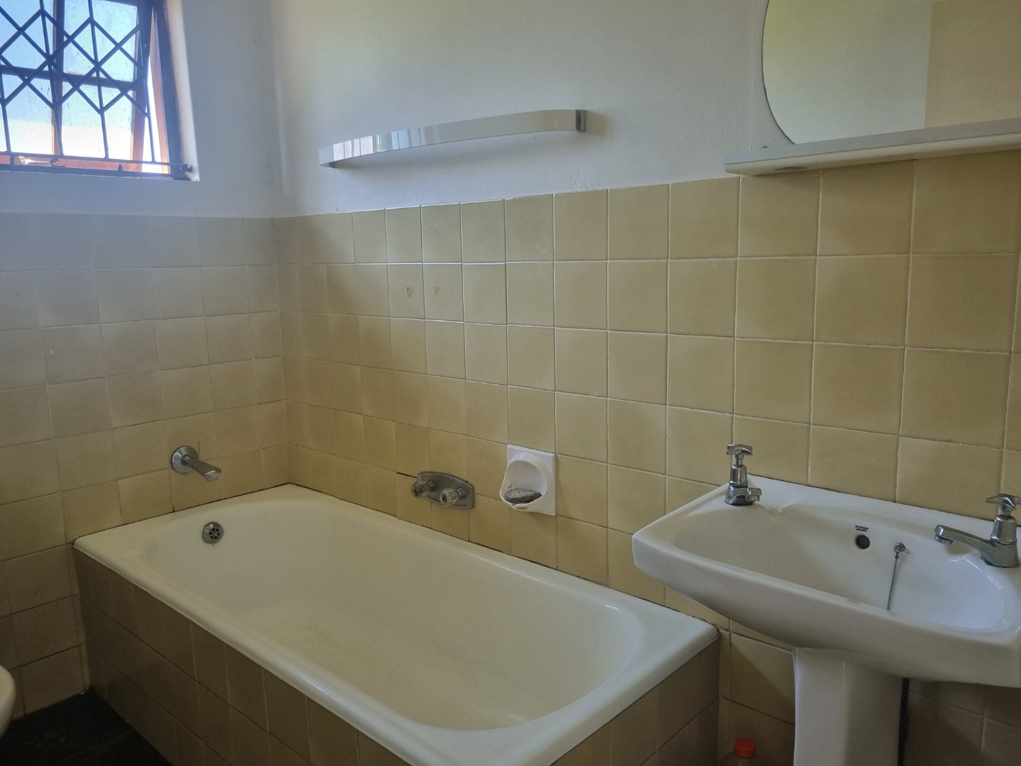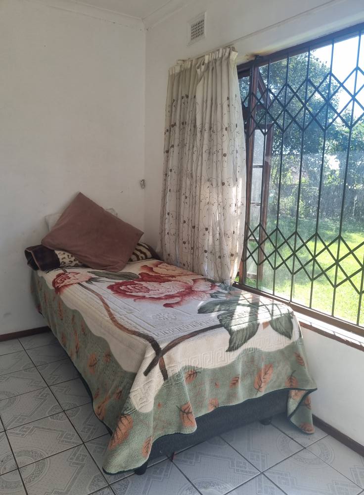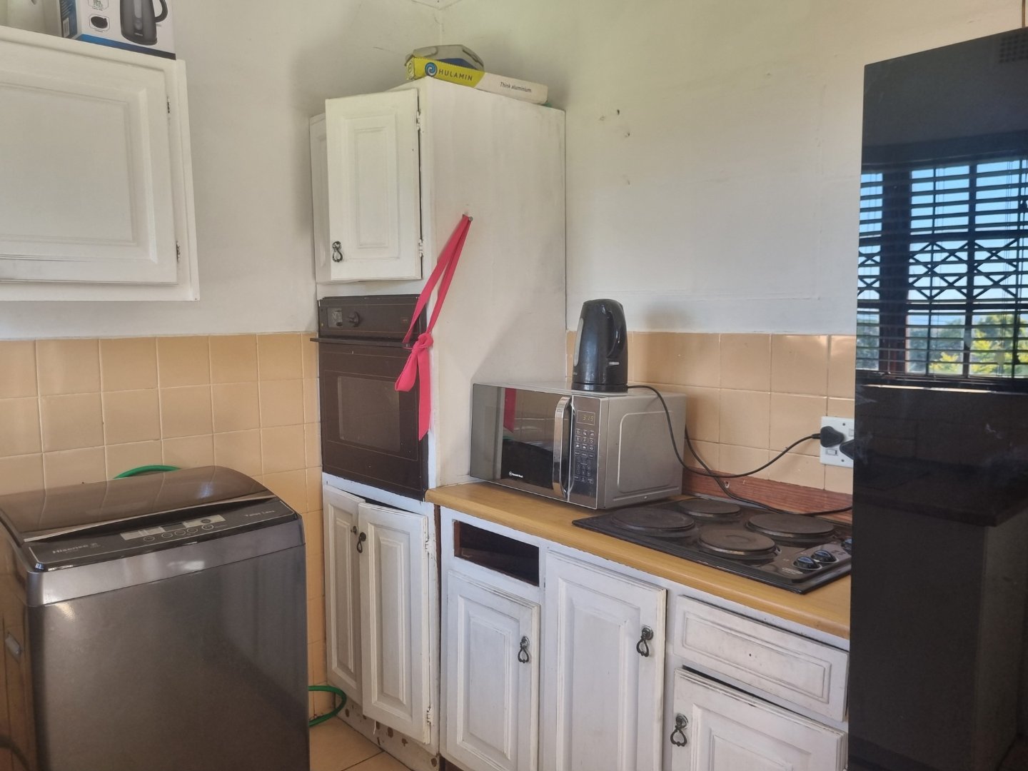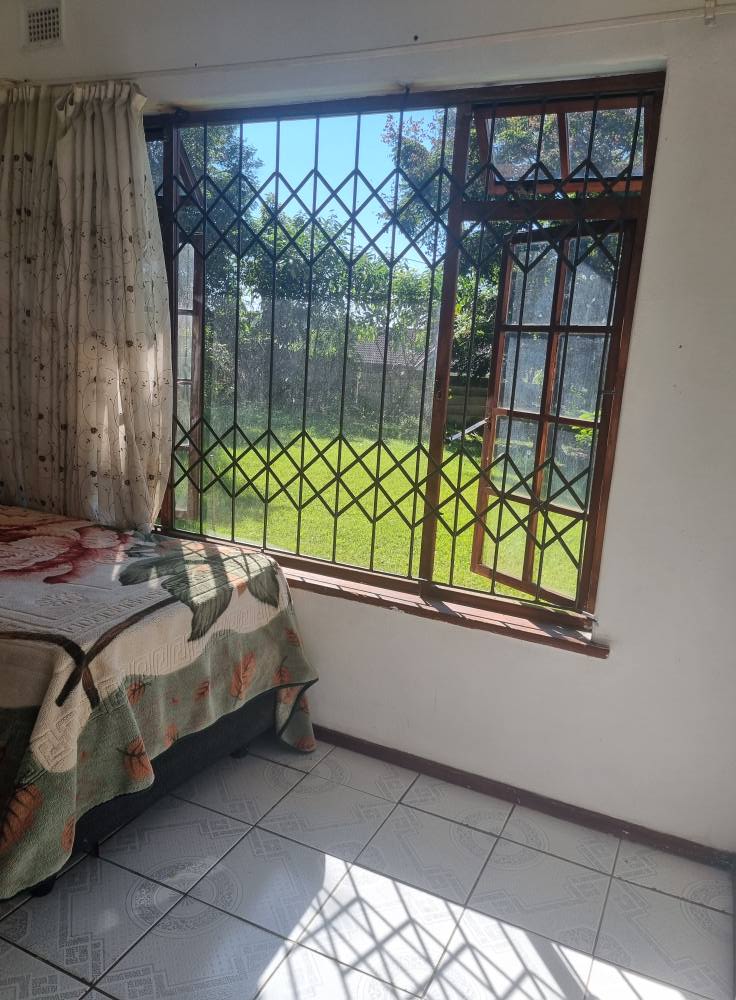 The functional kitchen flows seamlessly into the open-plan lounge and dining area, making it ideal for family living and entertaining. Wooden-framed windows with burglar bars add character and peace of mind.