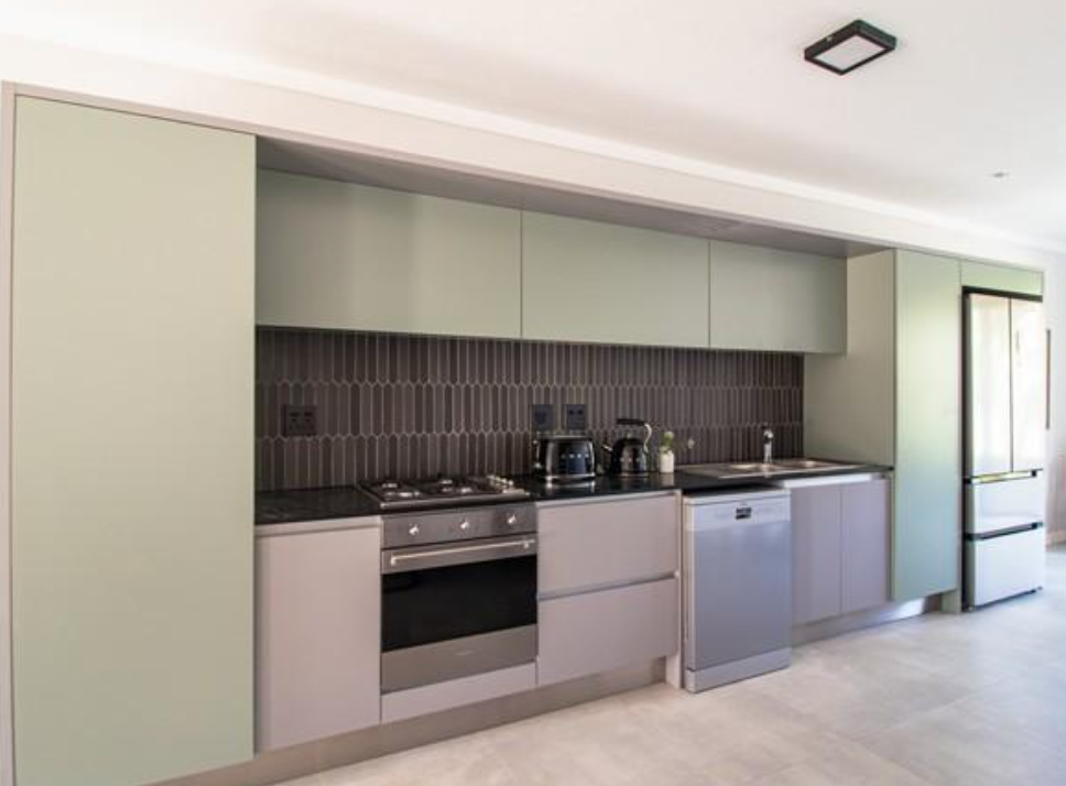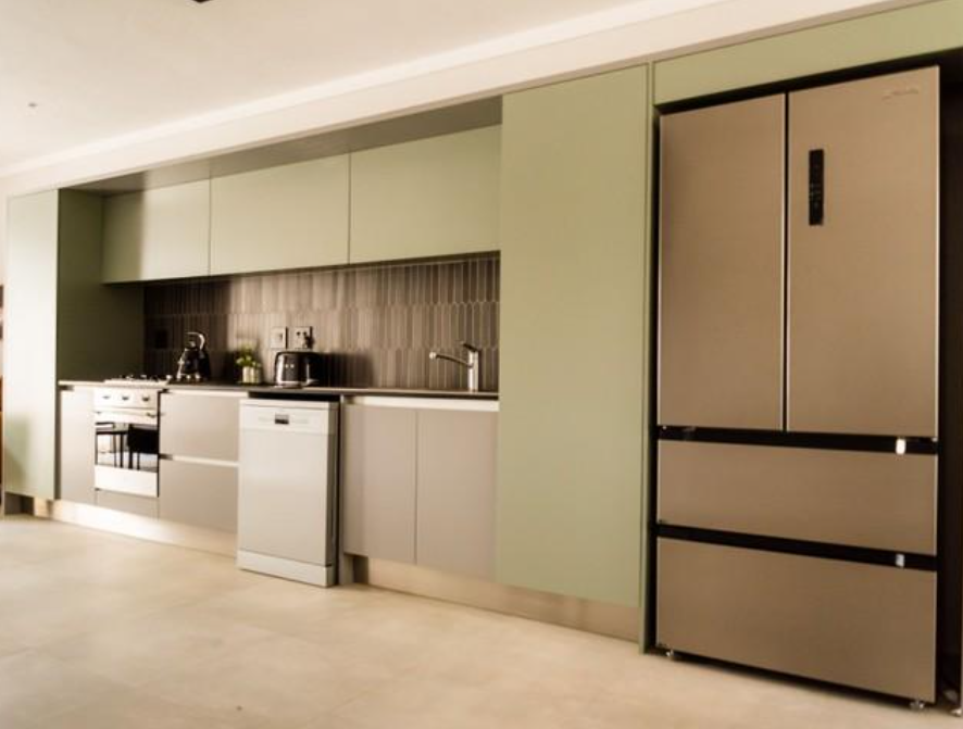 Modern, contemporary finishes and fixtures throughout. Open plan living room, dining room, and kitchen with Caesarstone countertops, SMEG gas stove, and electric oven. Space for double door fridge.