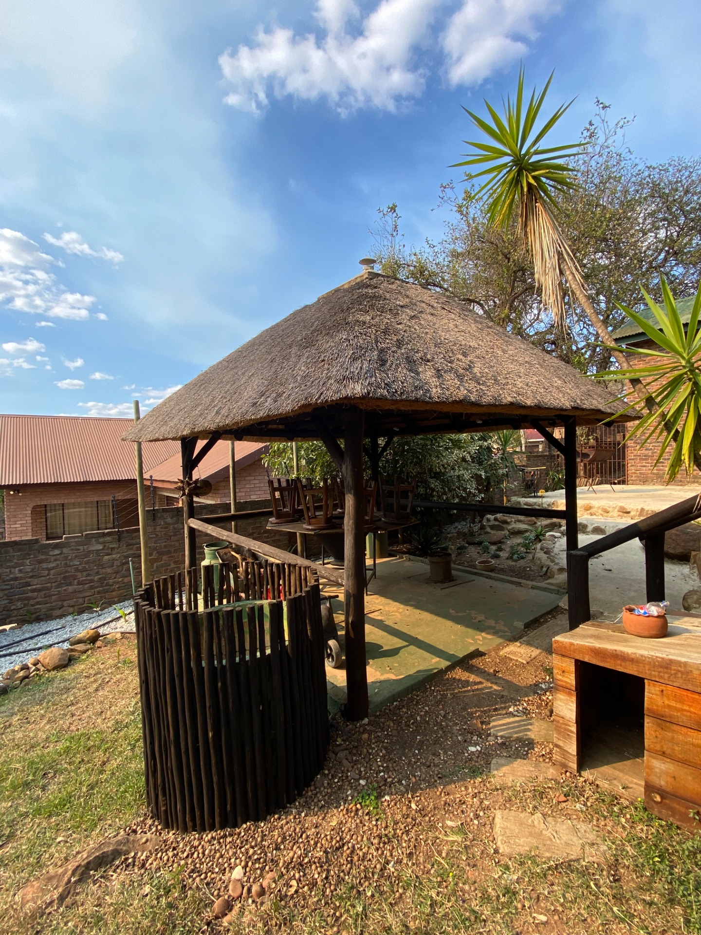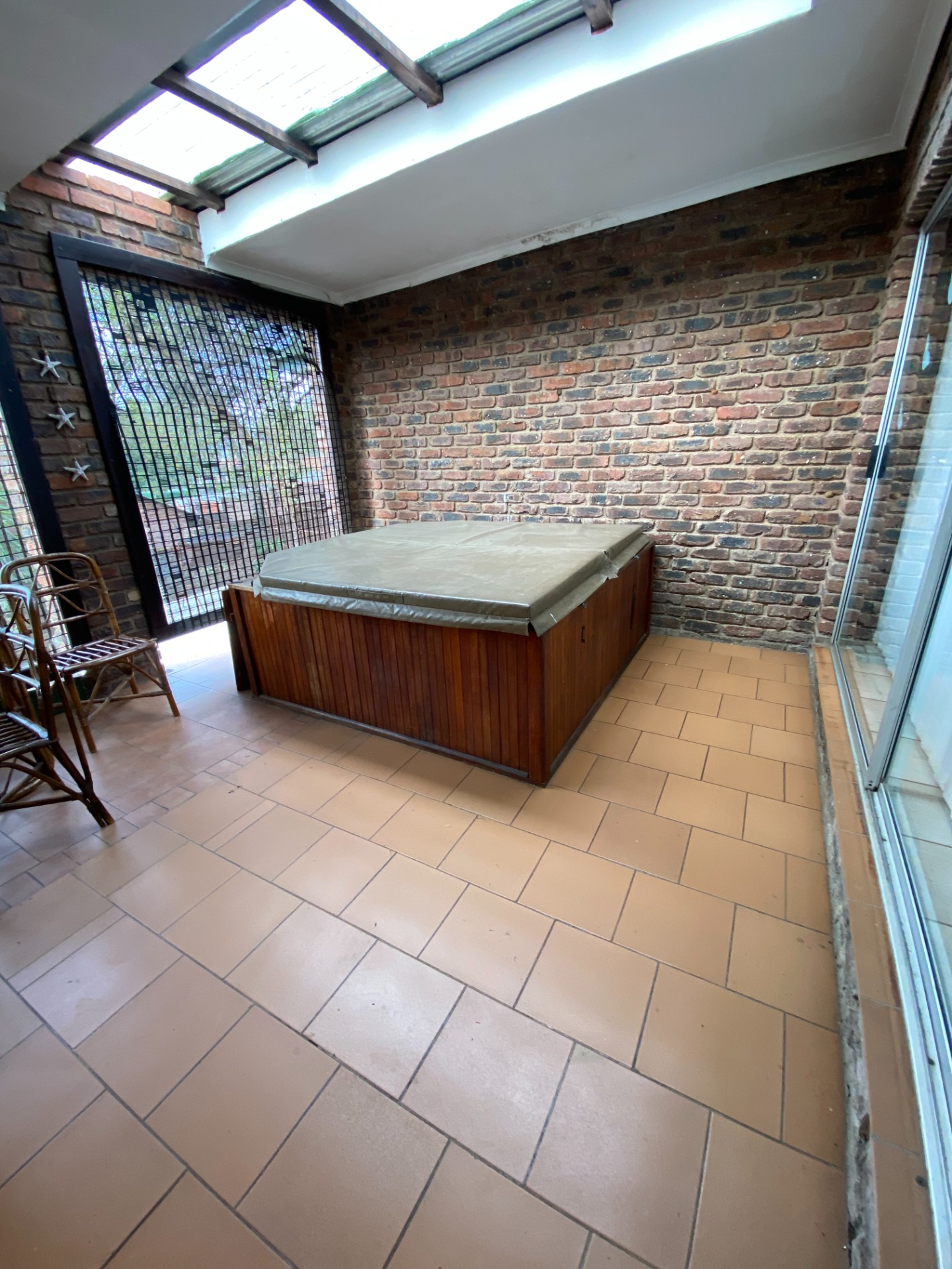Outdoor Oasis: Relax and entertain in your private backyard with a cozy thatch lapa and invigorating jacuzzi. A beautifully maintained garden front and back enhances your outdoor living experience.