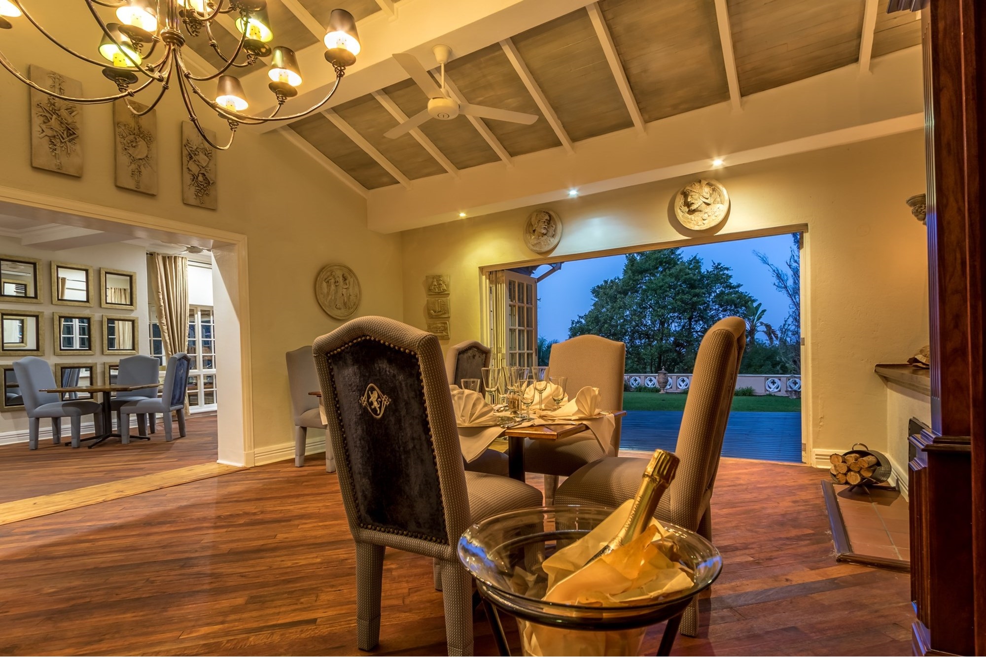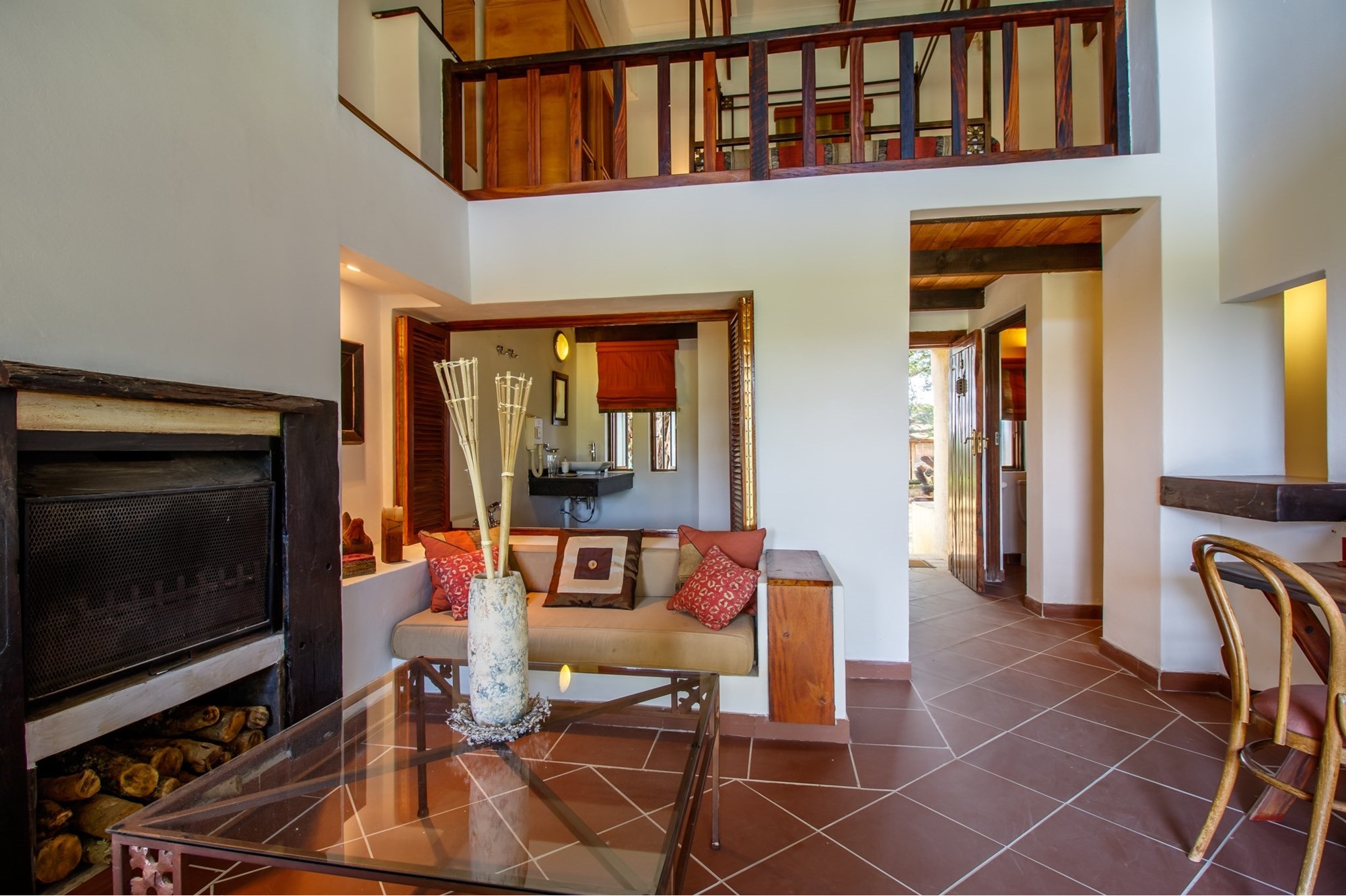 Boutique Lodge FeaturesAccommodation: 13 individually themed suites sleeping up to 26 guestsIncludes: Presidential Suite, 8 Romantic Suites, 4 Duplex SuitesArchitecture: Ochre-washed lodge with cobbled courtyard and timeless eleganceDining: Fine dining restaurant with African/French fusion cuisineWalk-in wine cellar with over 2,000 bottlesElegant dining room with silverware, crystal, and log fireplace loungeWedding & Events:Stone chapel for fairytale ceremoniesIntimate reception areaIdeal for weddings, honeymoons, conferences, and retreats