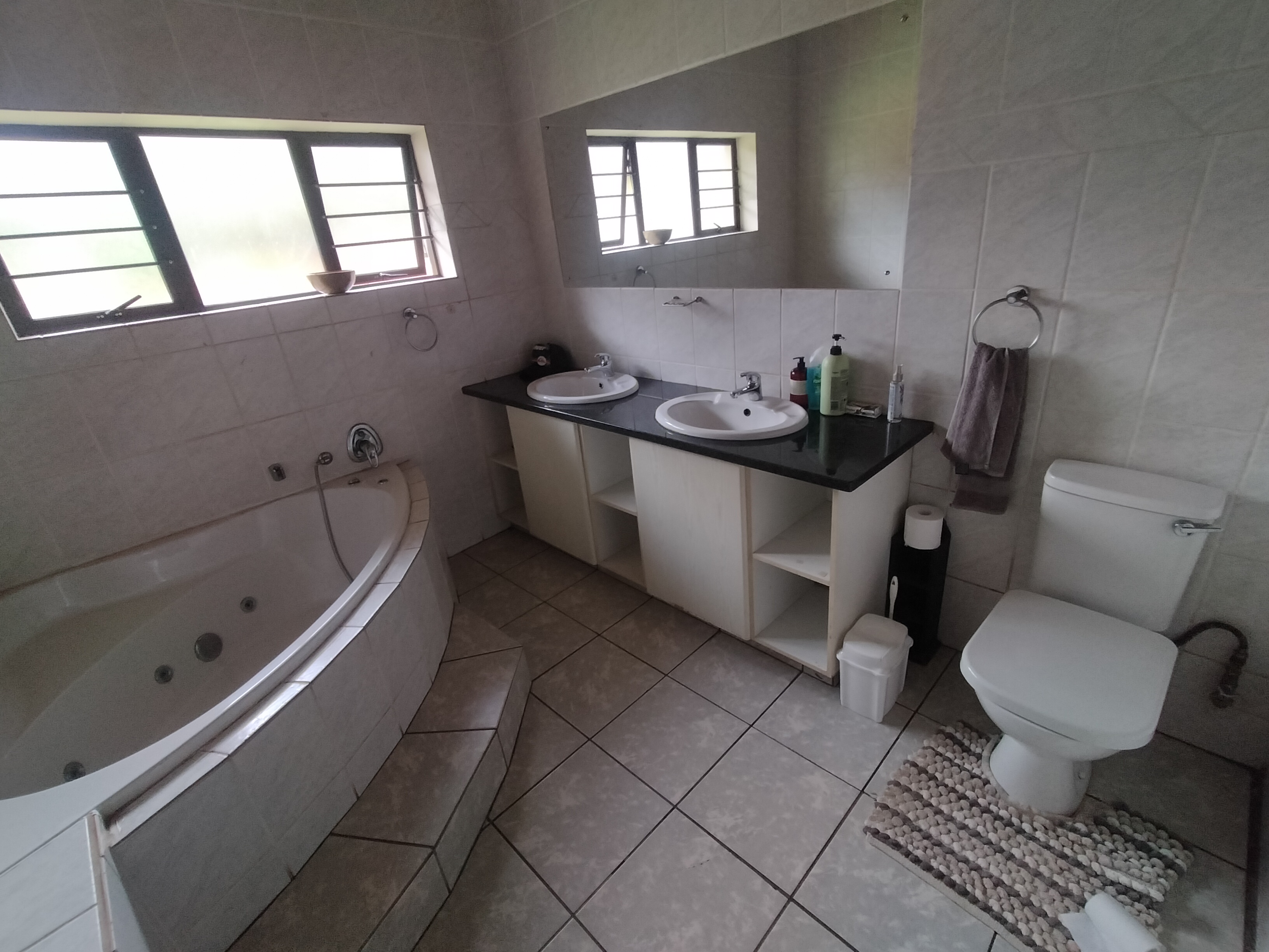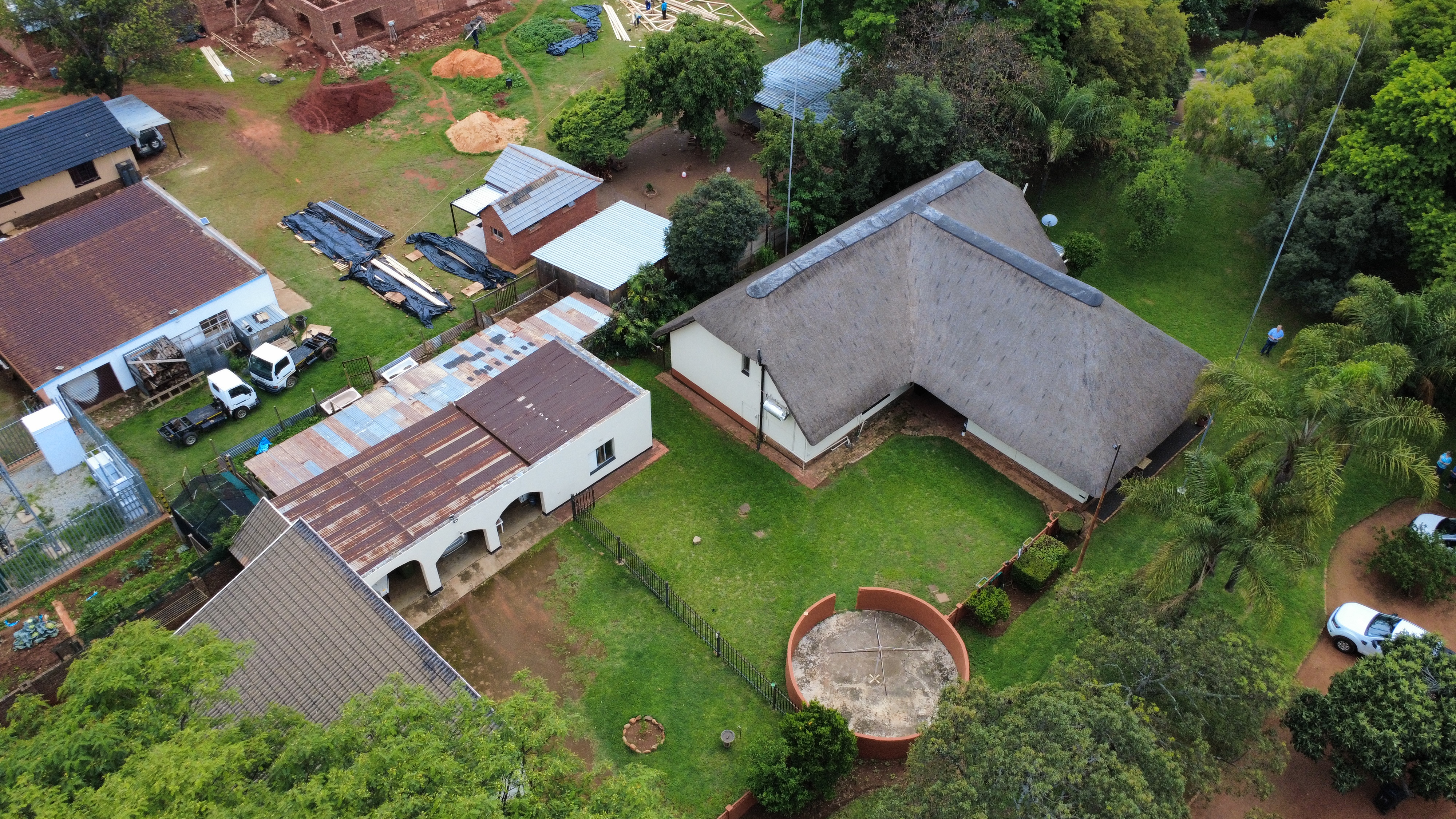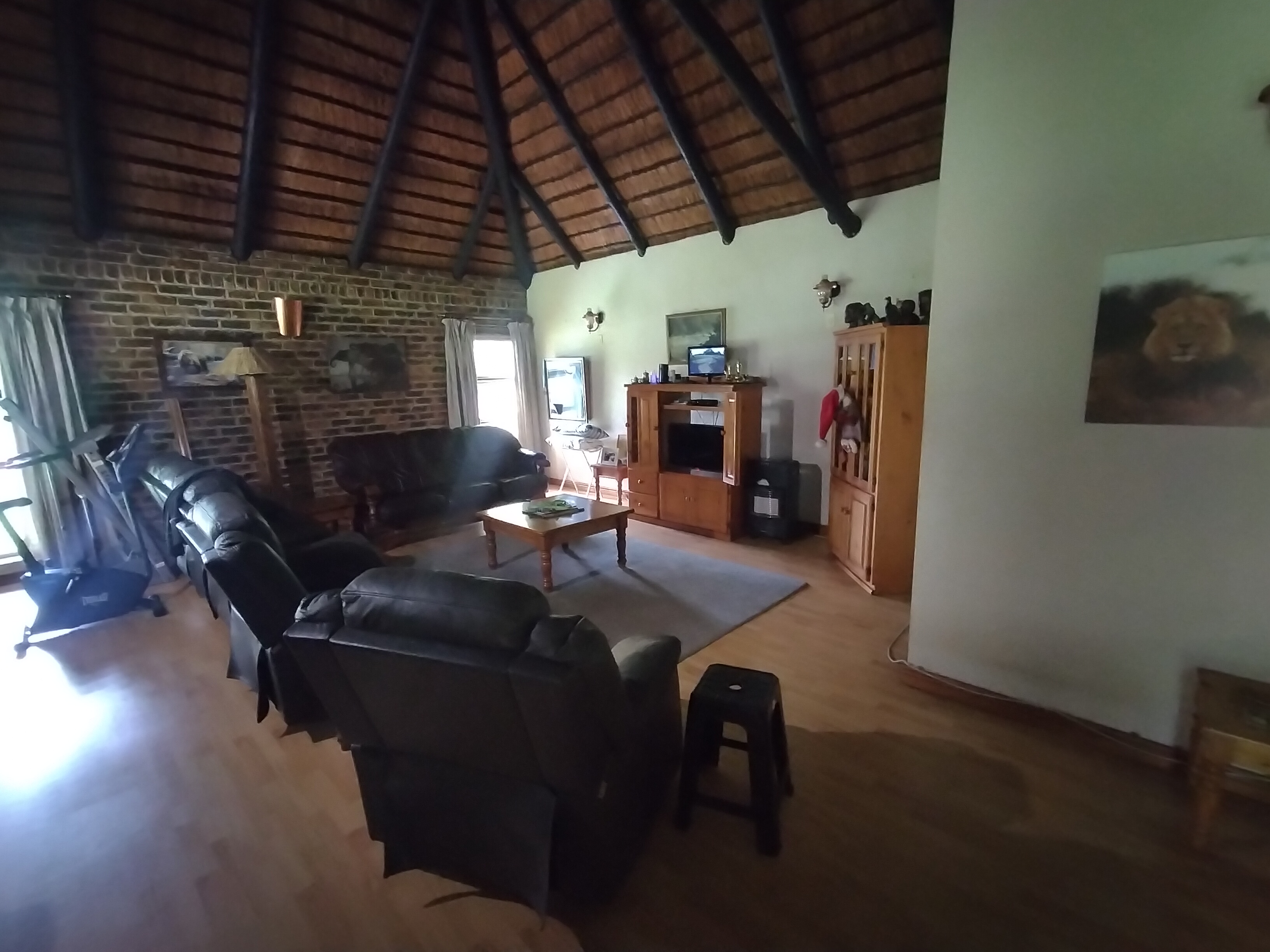 Discover peaceful country living on this 1-hectare plot featuring a beautifully maintained modern thatch home surrounded by tall trees and a serene garden. The inviting patio leads into a spacious lounge with laminate flooring, a dining area, and a charming bar fitted with a Rhodesian teak counter. The stylish kitchen offers granite tops, a pantry, and a gas hob, while the home includes four generous bedrooms with built-in cupboards. The main bedroom boasts a full ensuite bathroom. Added convenience includes prepaid electricity, a security system with CCTV, an outside laundry, storeroom, and a 3-car garage.