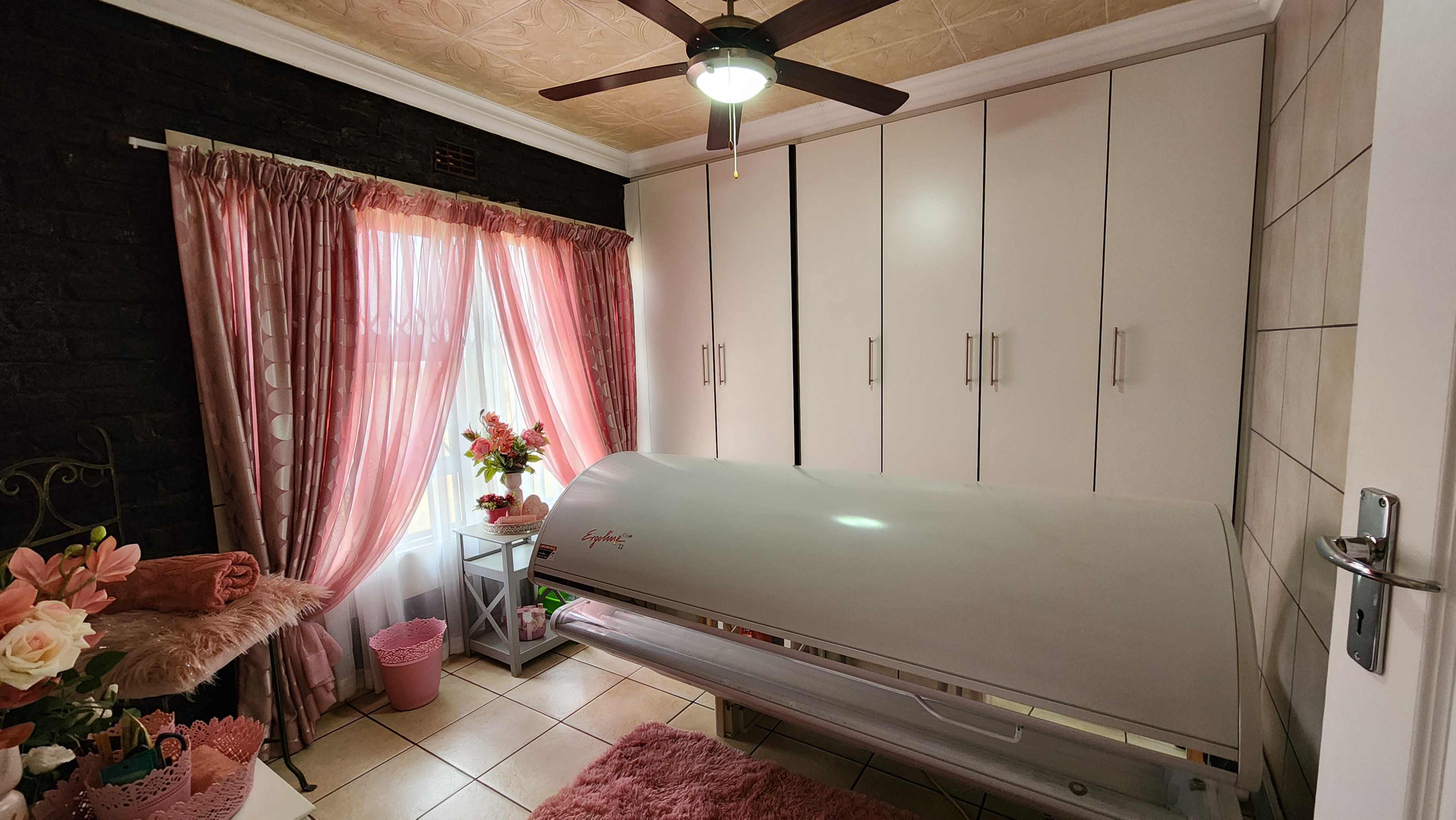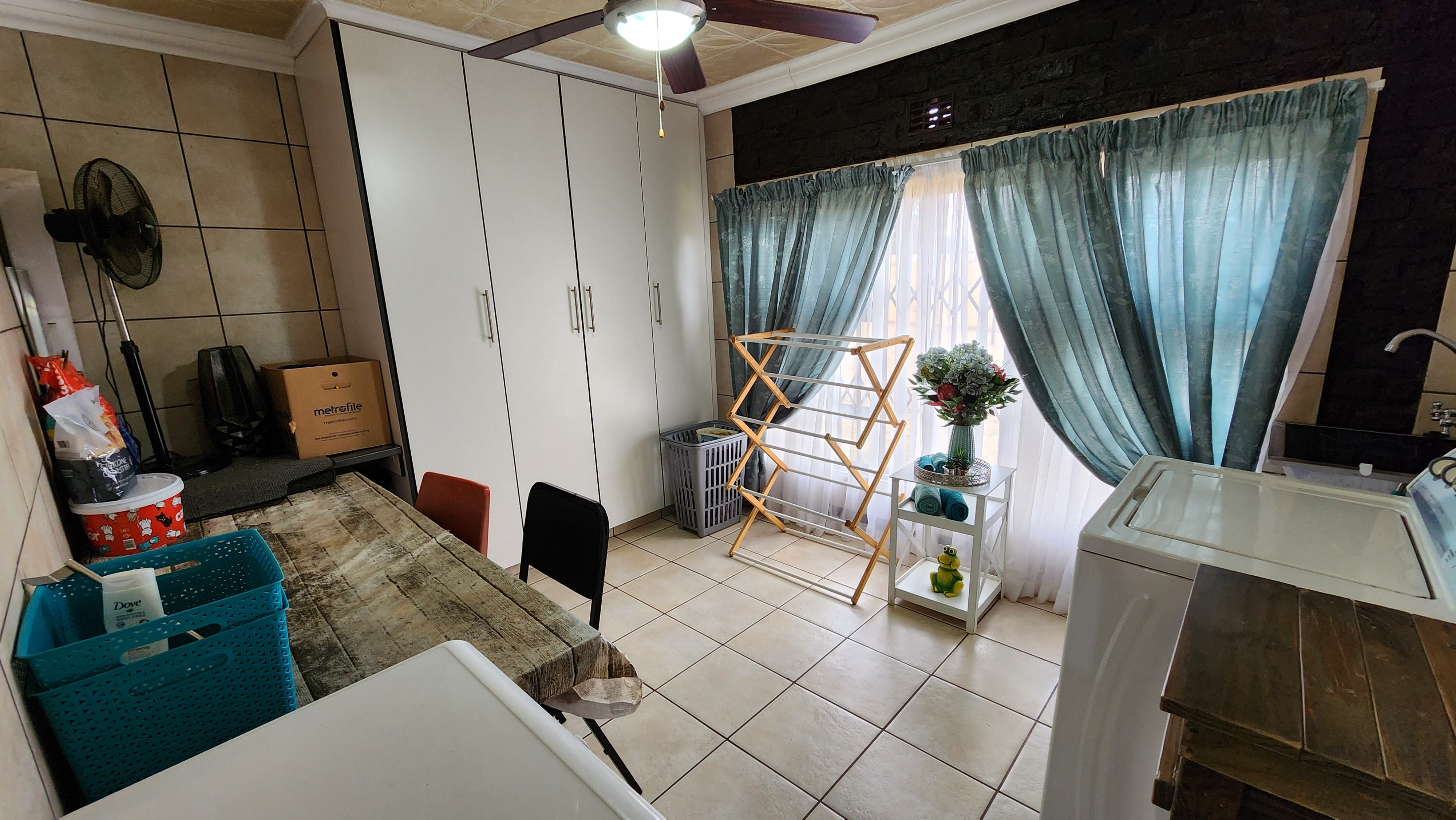 Big entertaining area with beautiful build in cupboards. Neatly tiled floor and walls. The building also has an aircon and build in braai with gas stove and oven. This building is equipped with a gas geyser. Building can also be used as a office or boardroom.