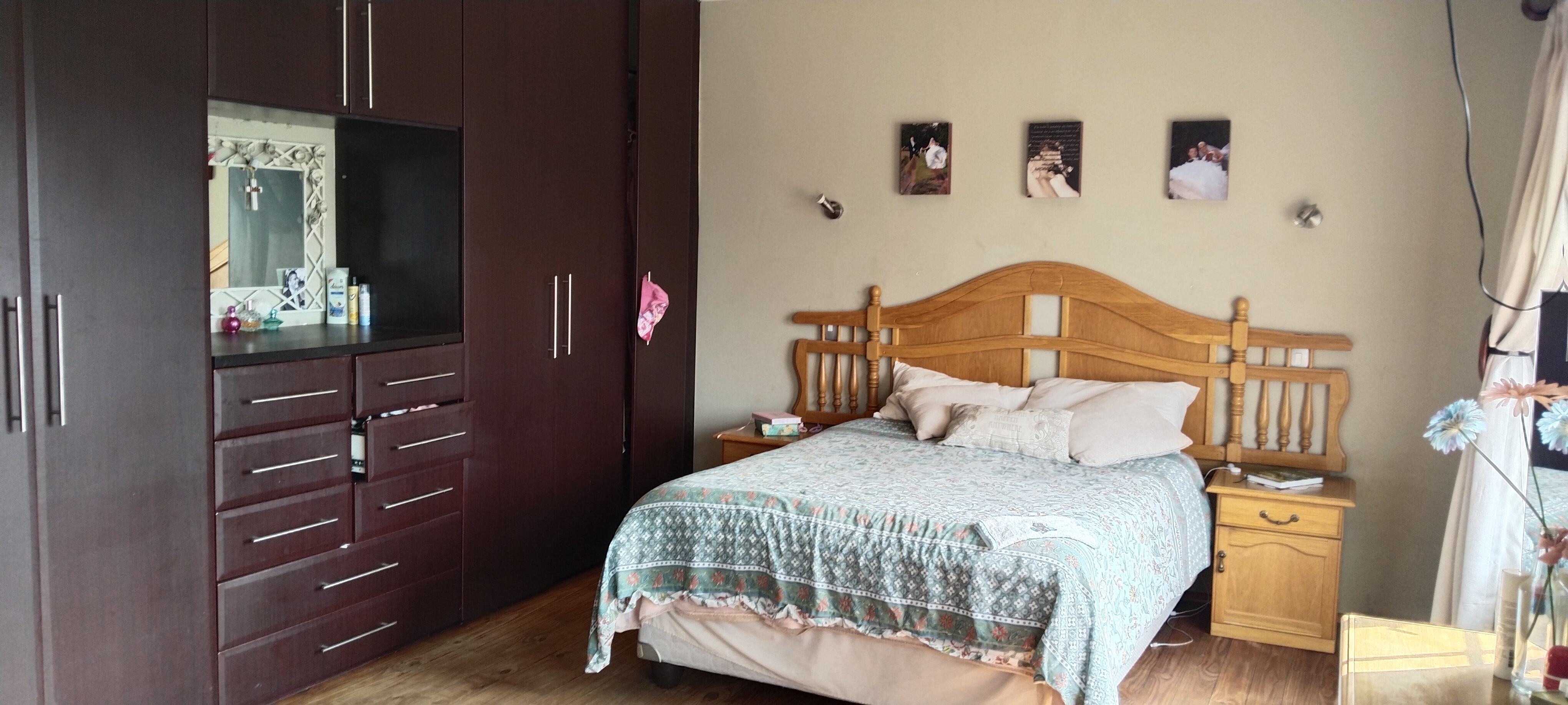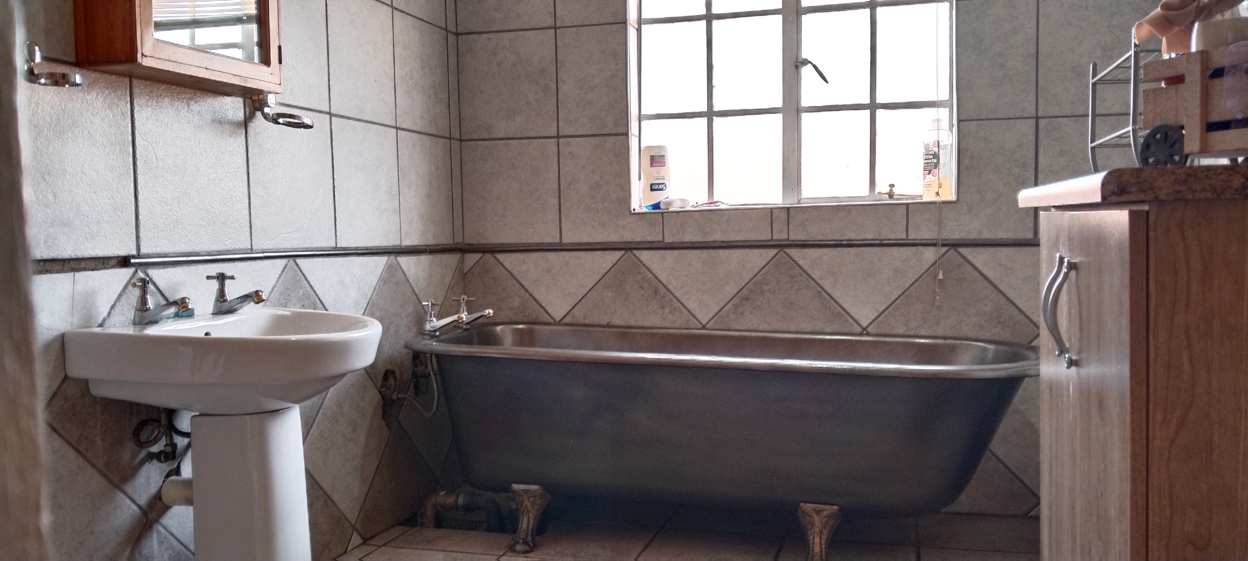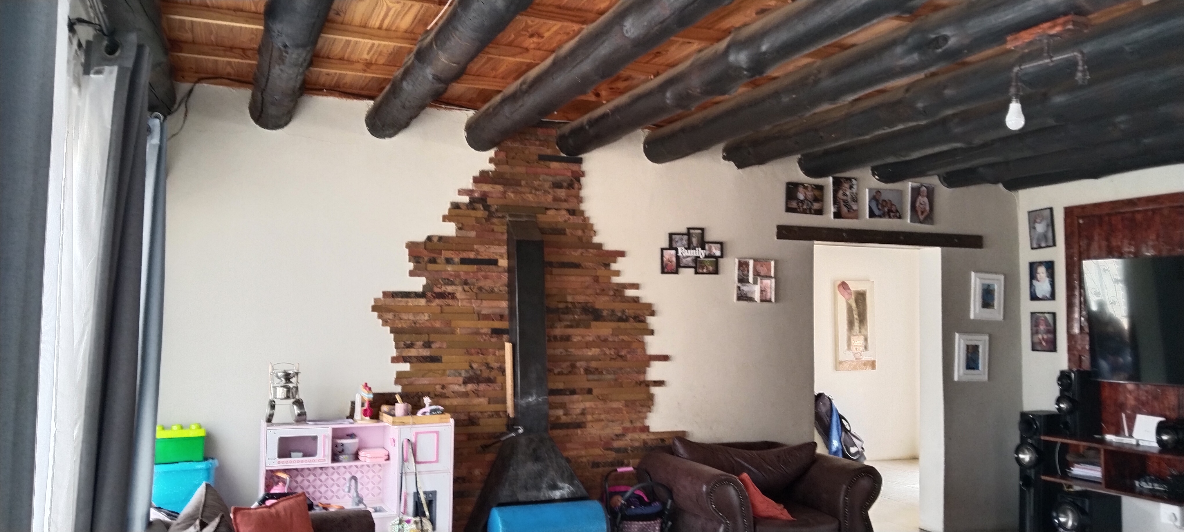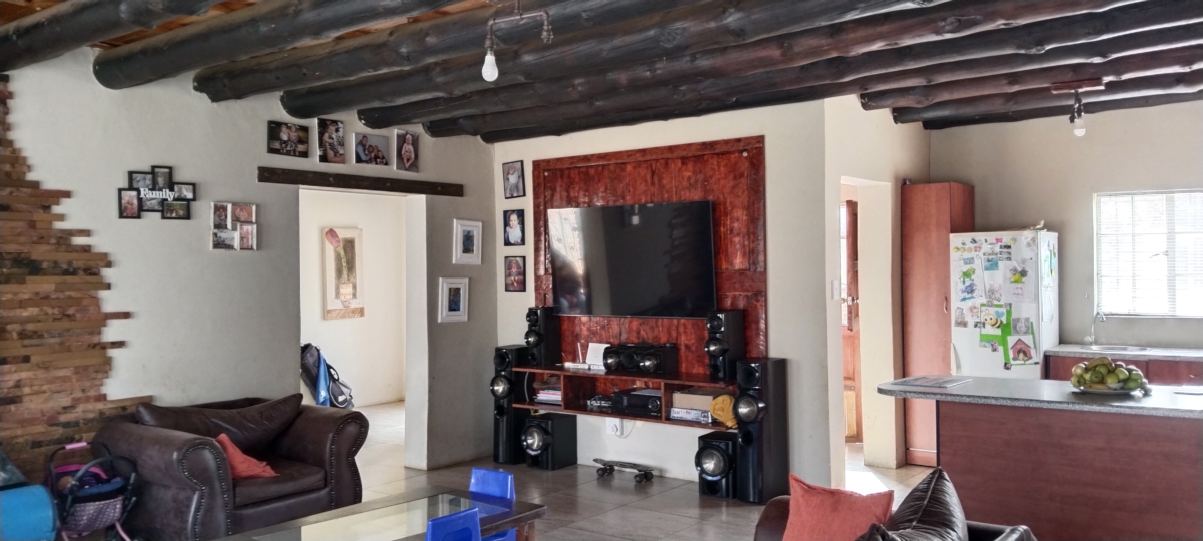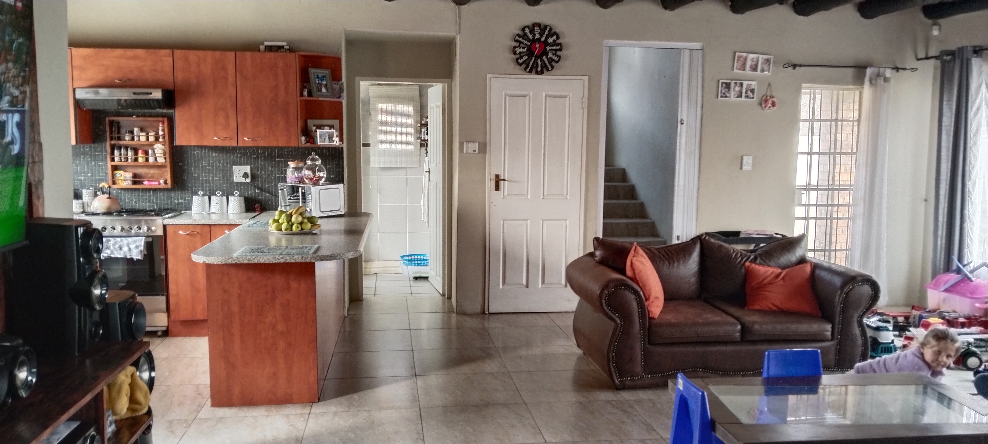 The open-plan layout creates a seamless flow between the spacious lounge, dining area, and kitchen, with natural light enhancing the airy ambiance. A conveniently located downstairs bathroom serves guests, while the separate scullery/laundry, opening to the back garden and well-used lapa, remains discreetly tucked out of sight.